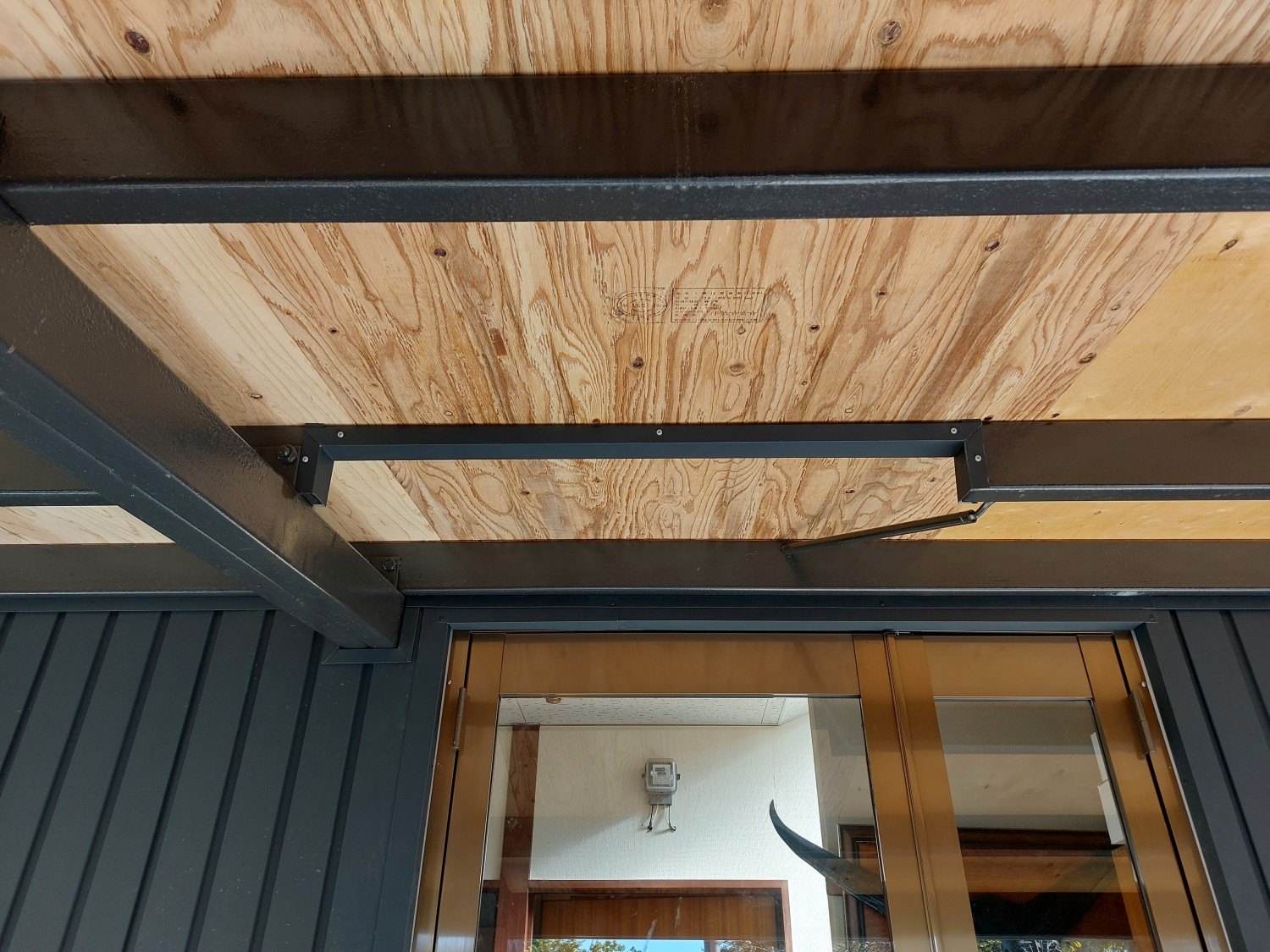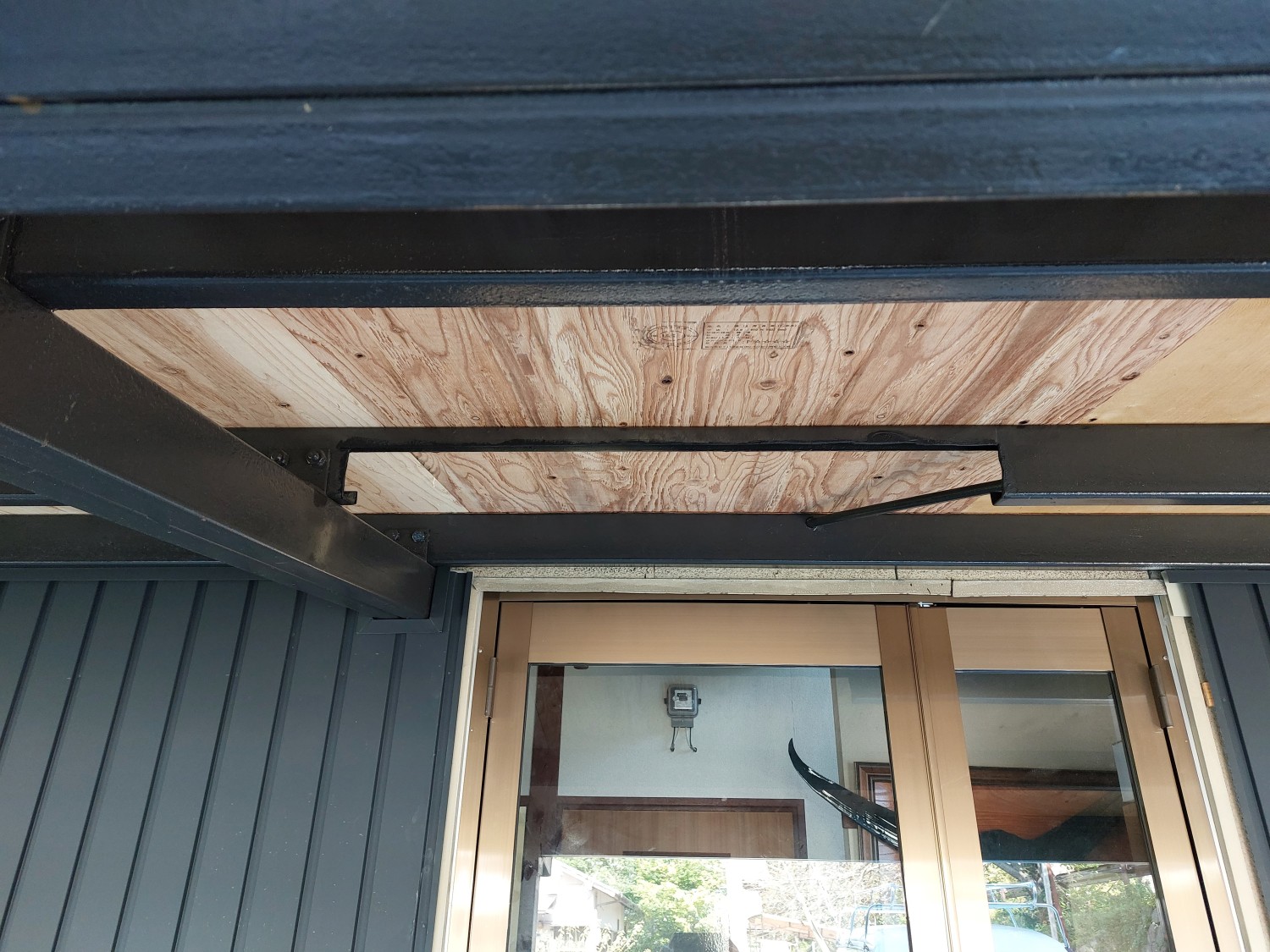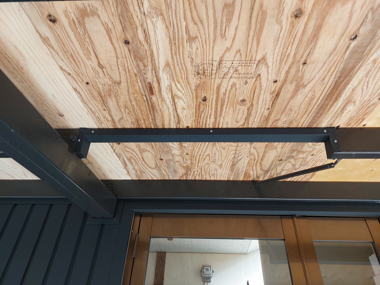 ドア施工時に欄間なしの縦長のドアに変更した為、干渉する鉄骨をカットしましたので、見栄えをよくする為に板金にてカット面を巻きました。