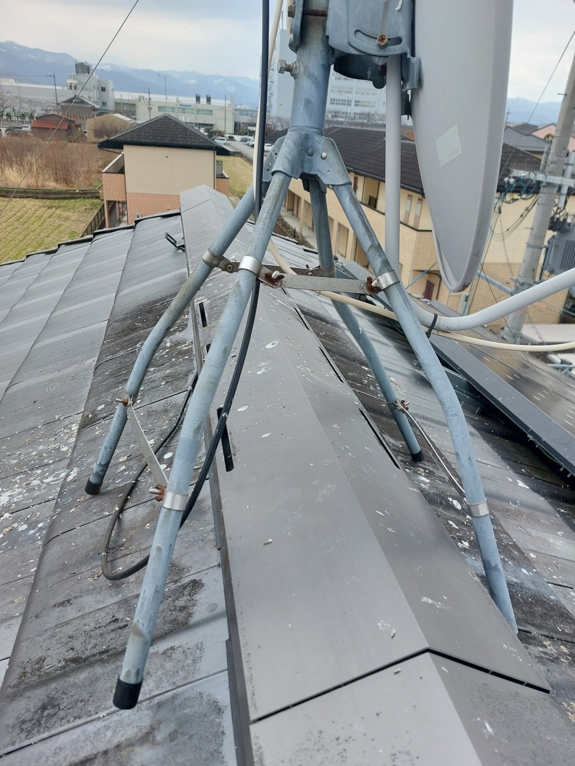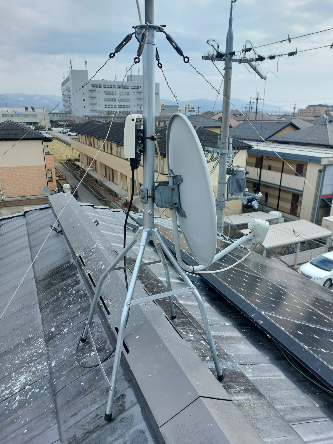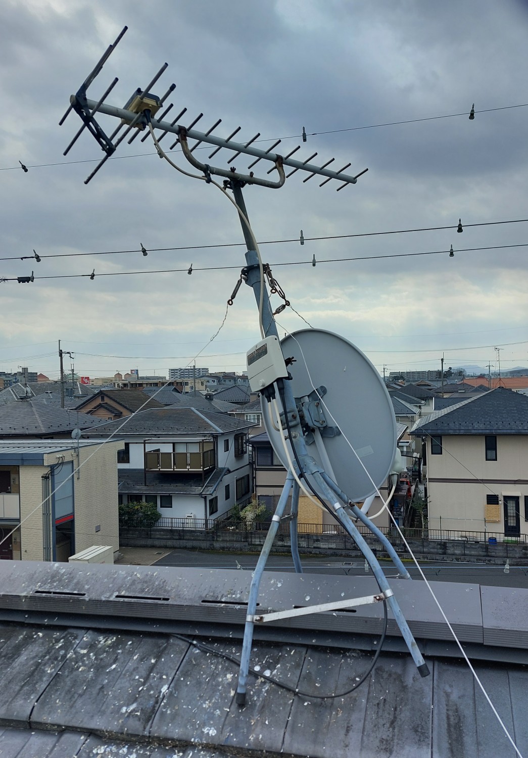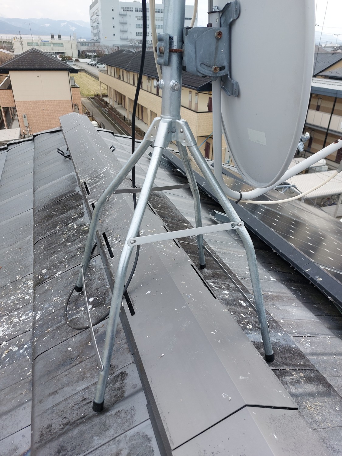 大雪による被害でアンテナスタンドの足が折れ曲がり、アンテナが倒れていたので早急の応急処置としまして、倒れているアンテナをおこしてBSアンテナの角度を調整し、受信できるようにしておきました。