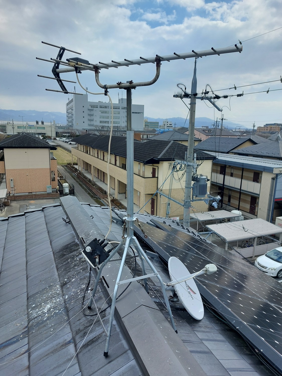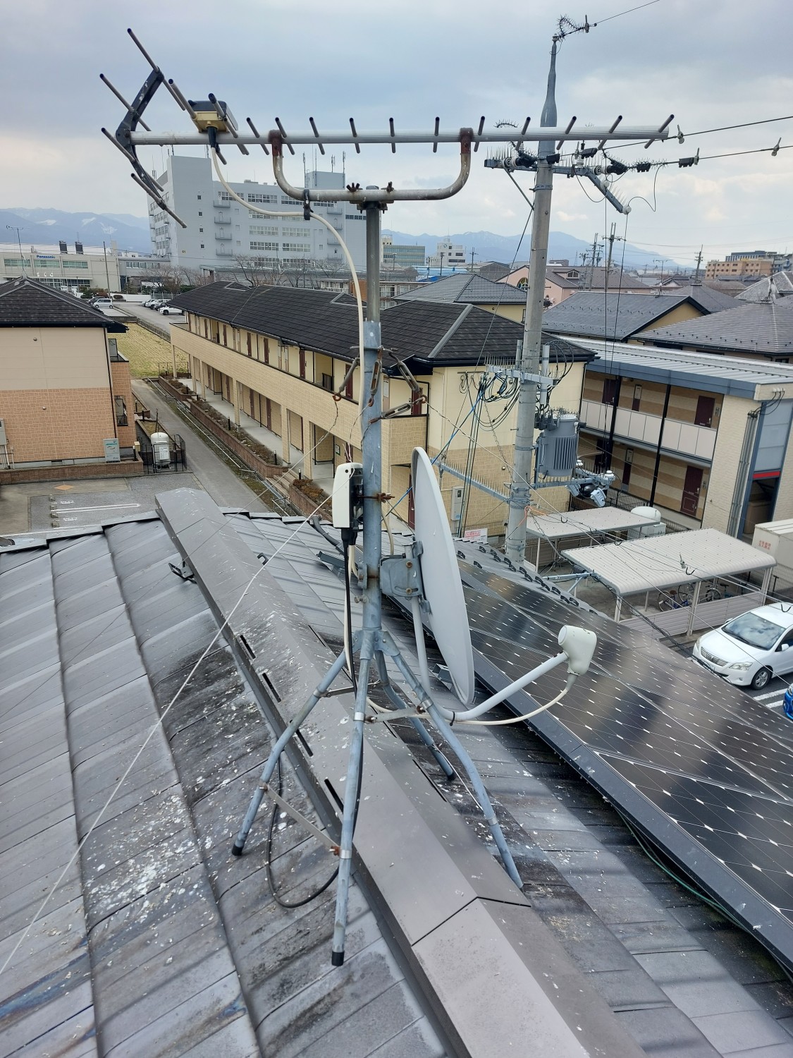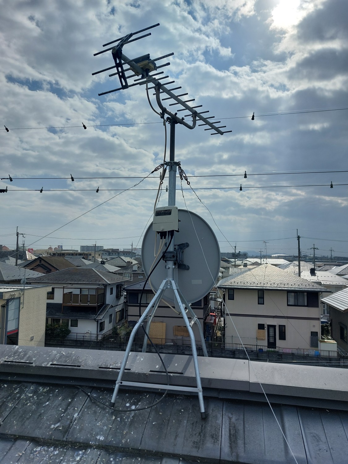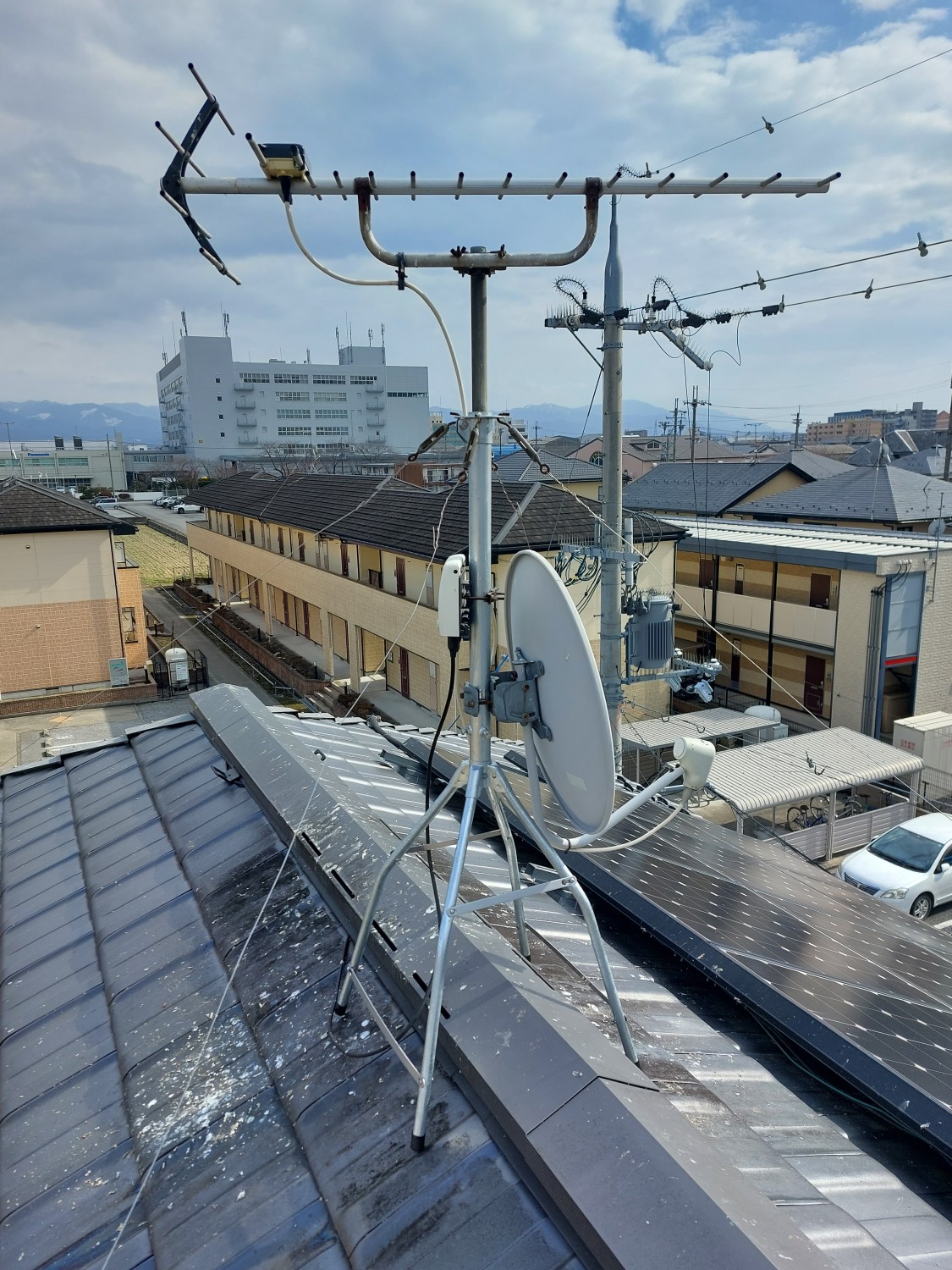 大雪による被害でアンテナスタンドの足が折れ曲がり、アンテナが倒れていたので早急の応急処置としまして、倒れているアンテナをおこしてBSアンテナの角度を調整し、受信できるようにしておきました。