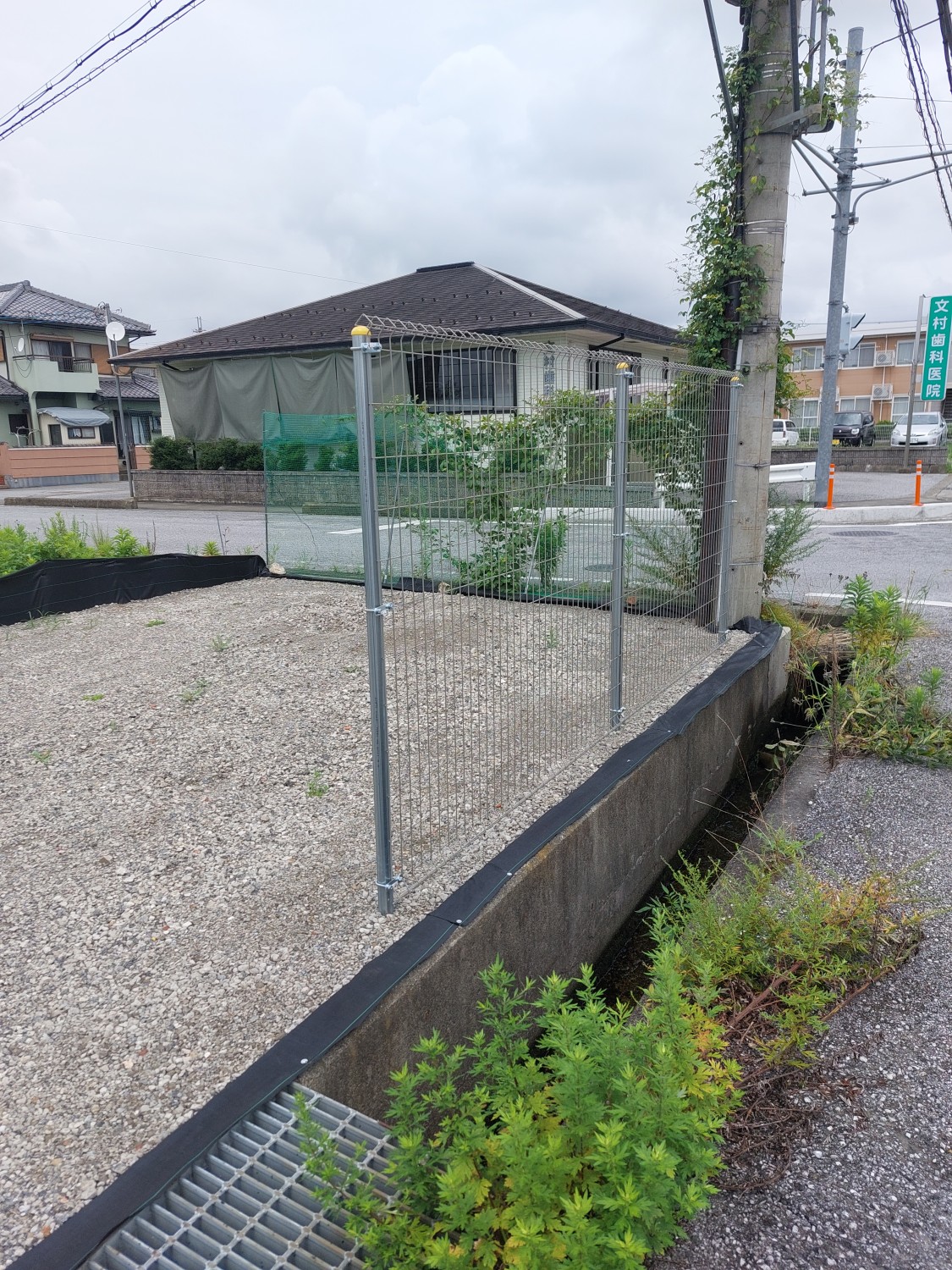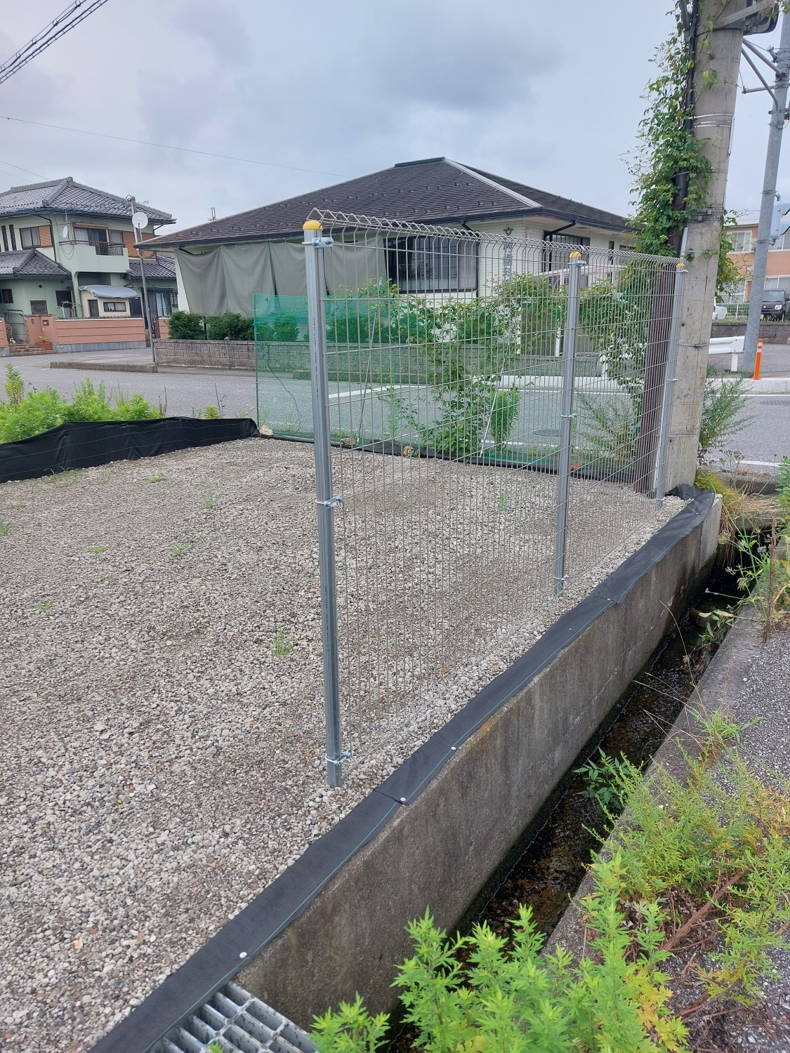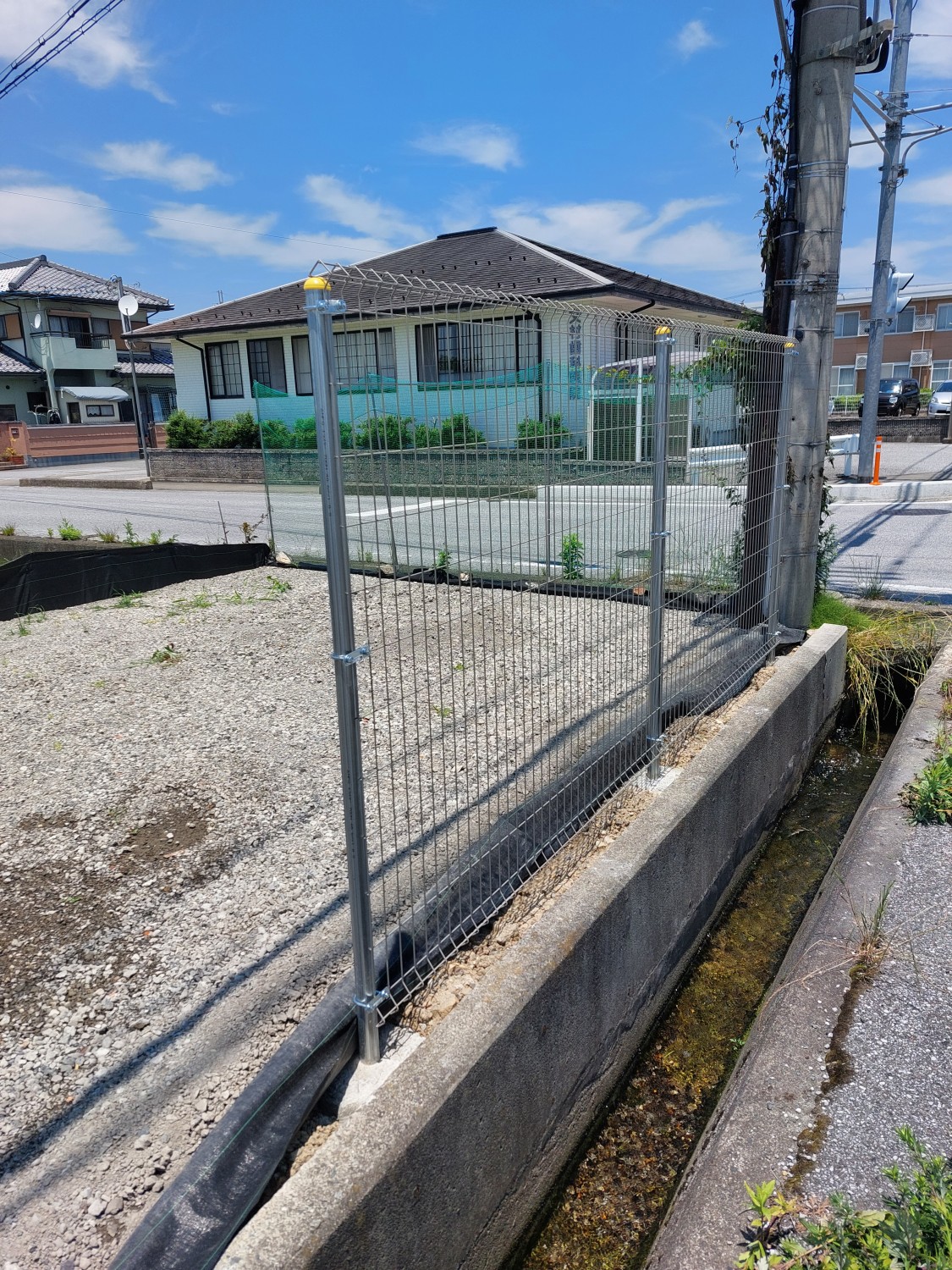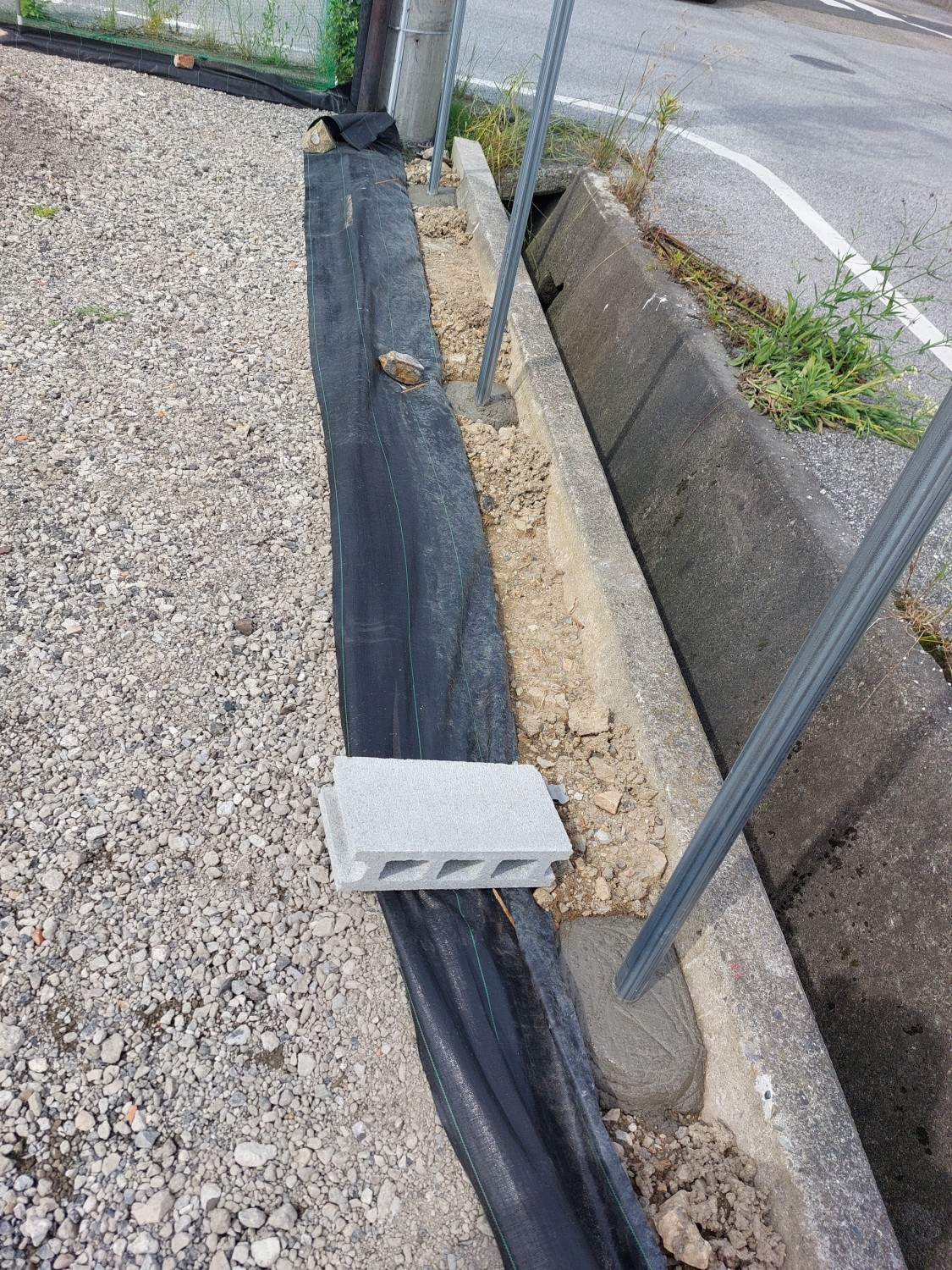 そしてフェンス本体の取り付けを行い、その後に土及び防草シート・砕石を戻し、敷均しを行ってからプレートにて転圧を施して仕上げました。