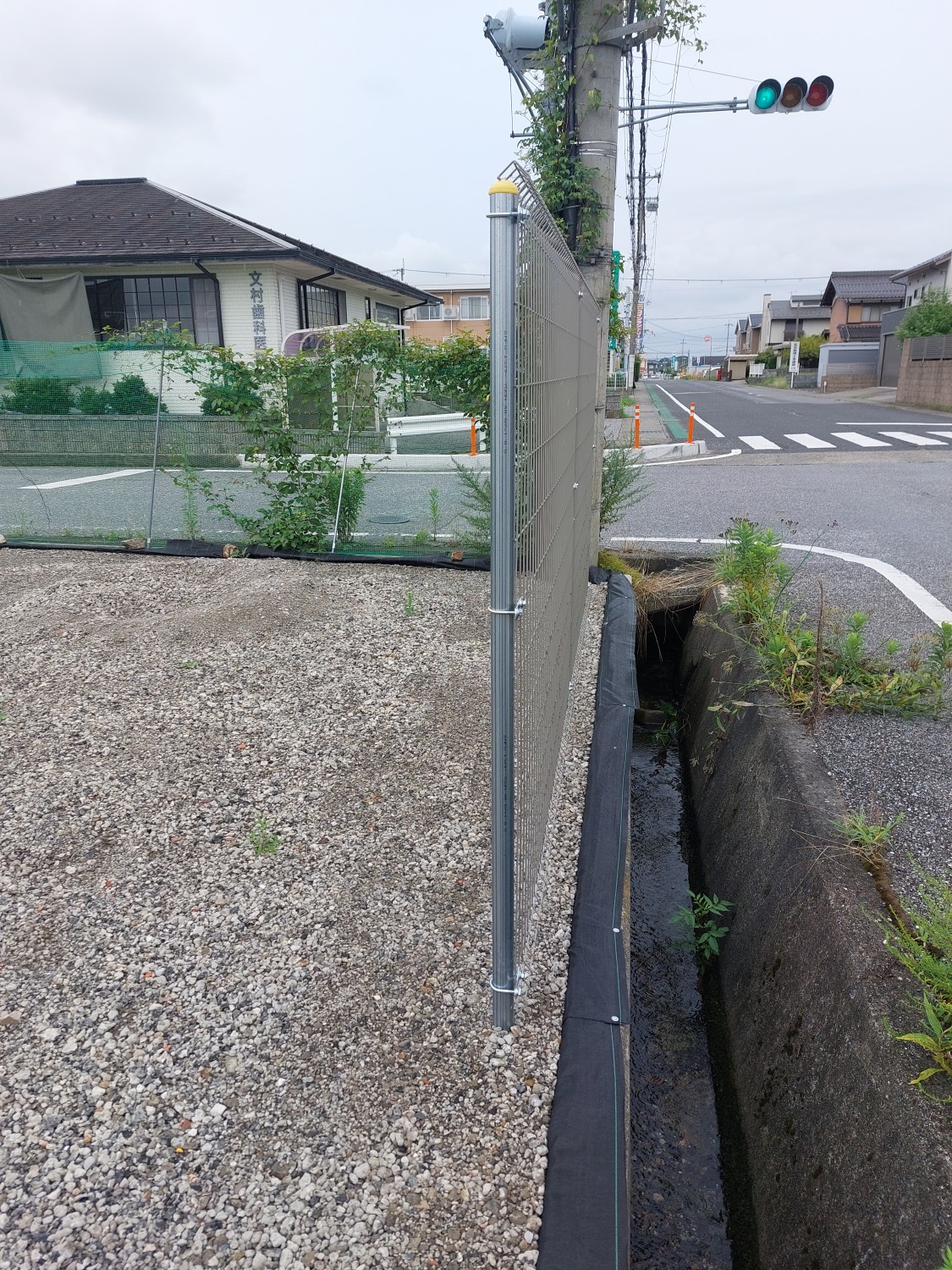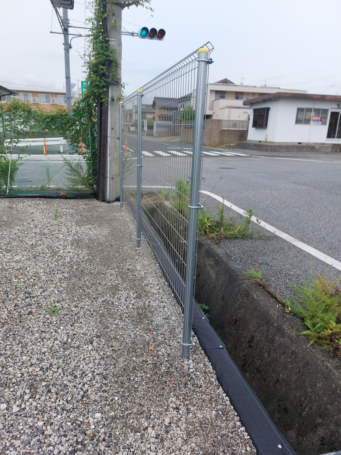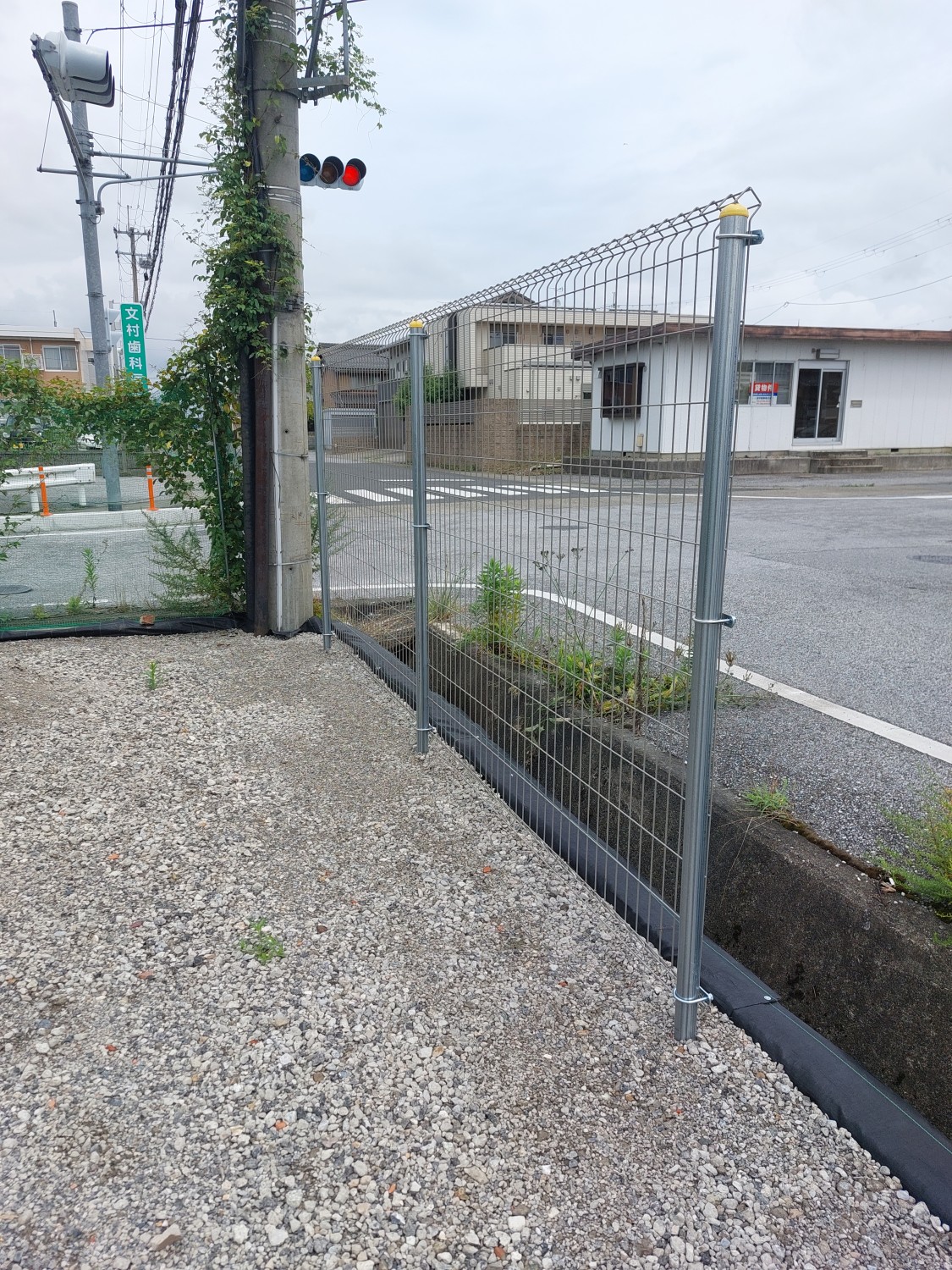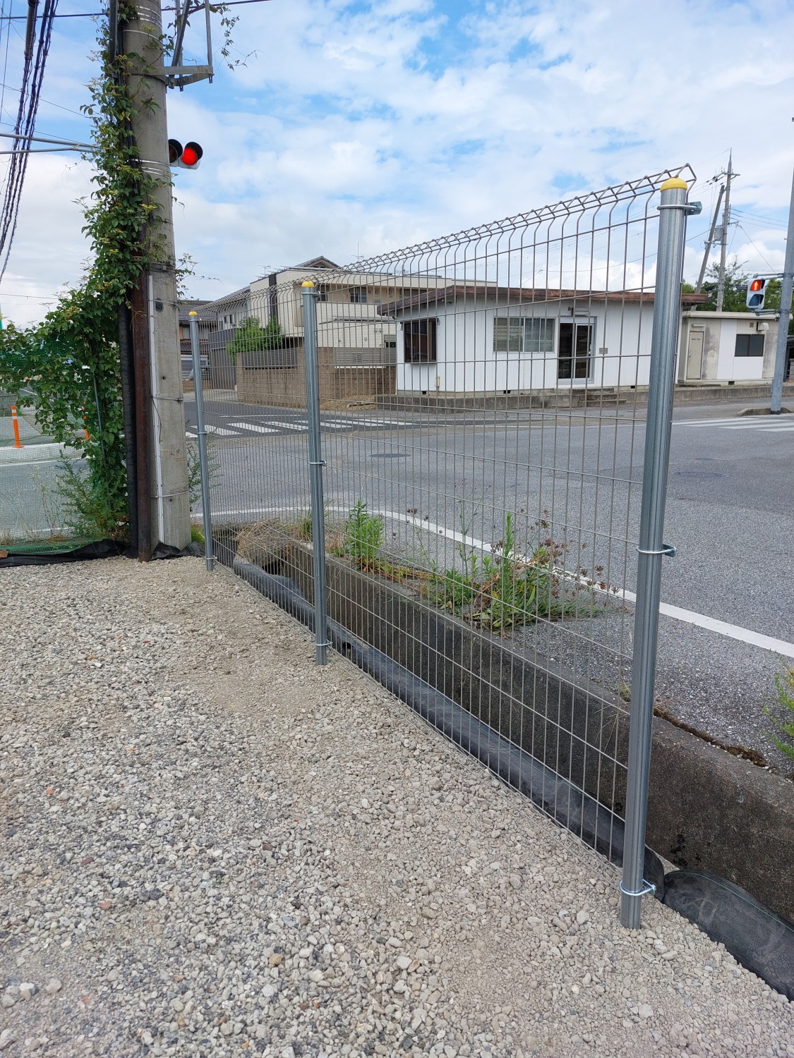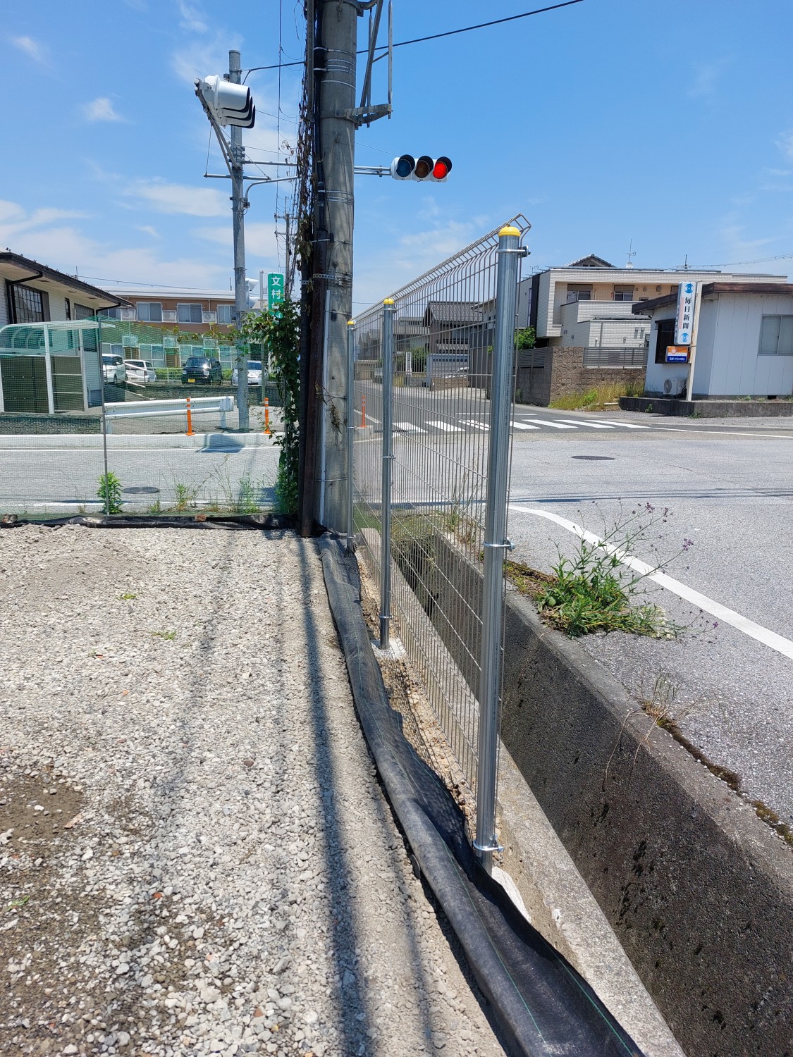 そしてフェンス本体の取り付けを行い、その後に土及び防草シート・砕石を戻し、敷均しを行ってからプレートにて転圧を施して仕上げました。