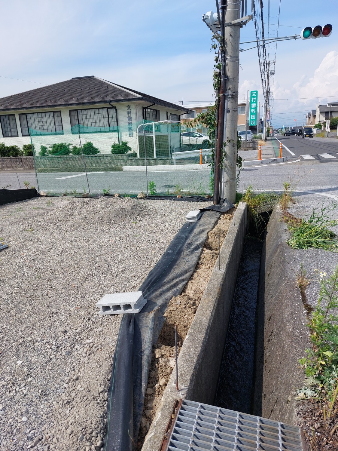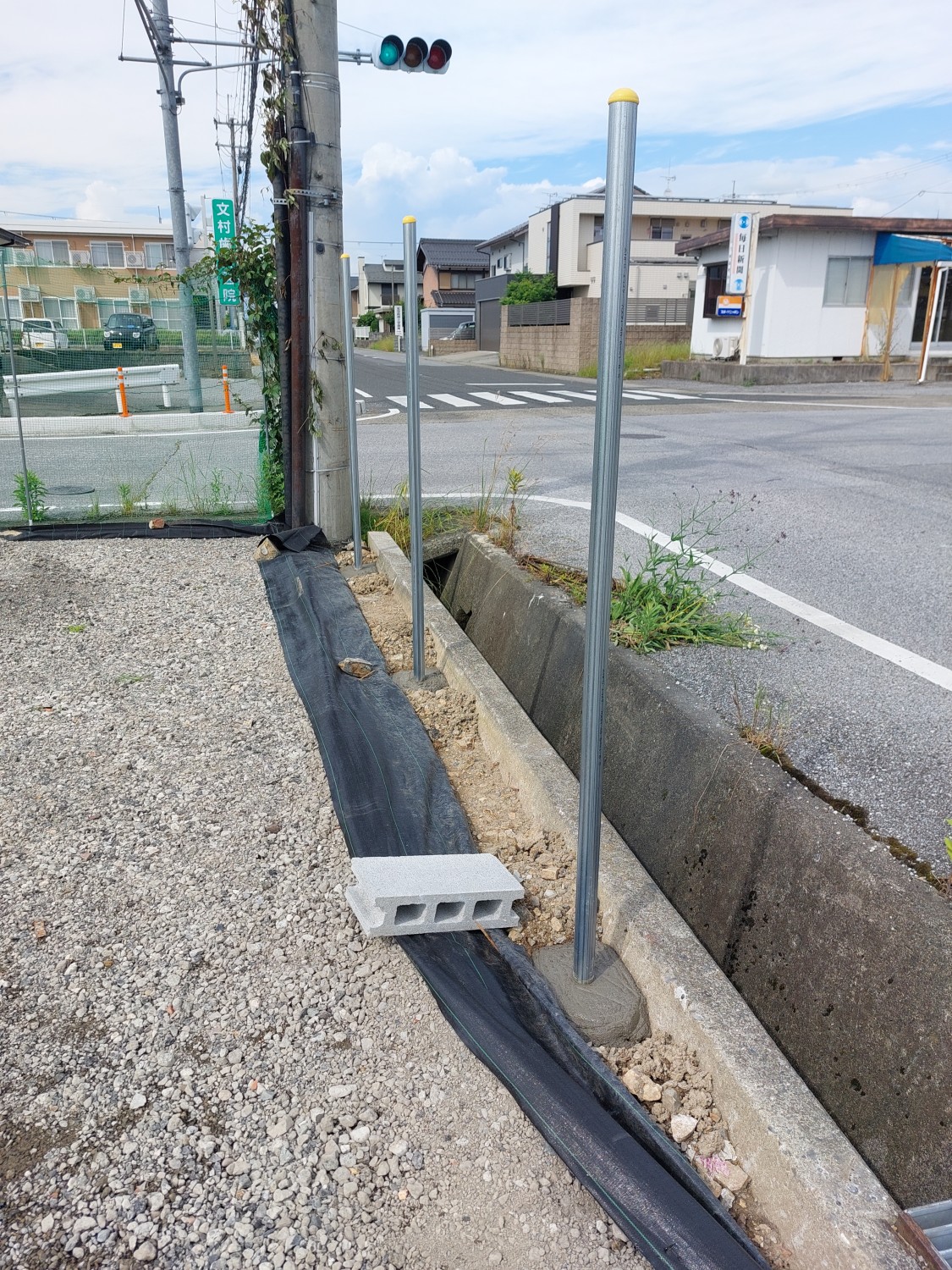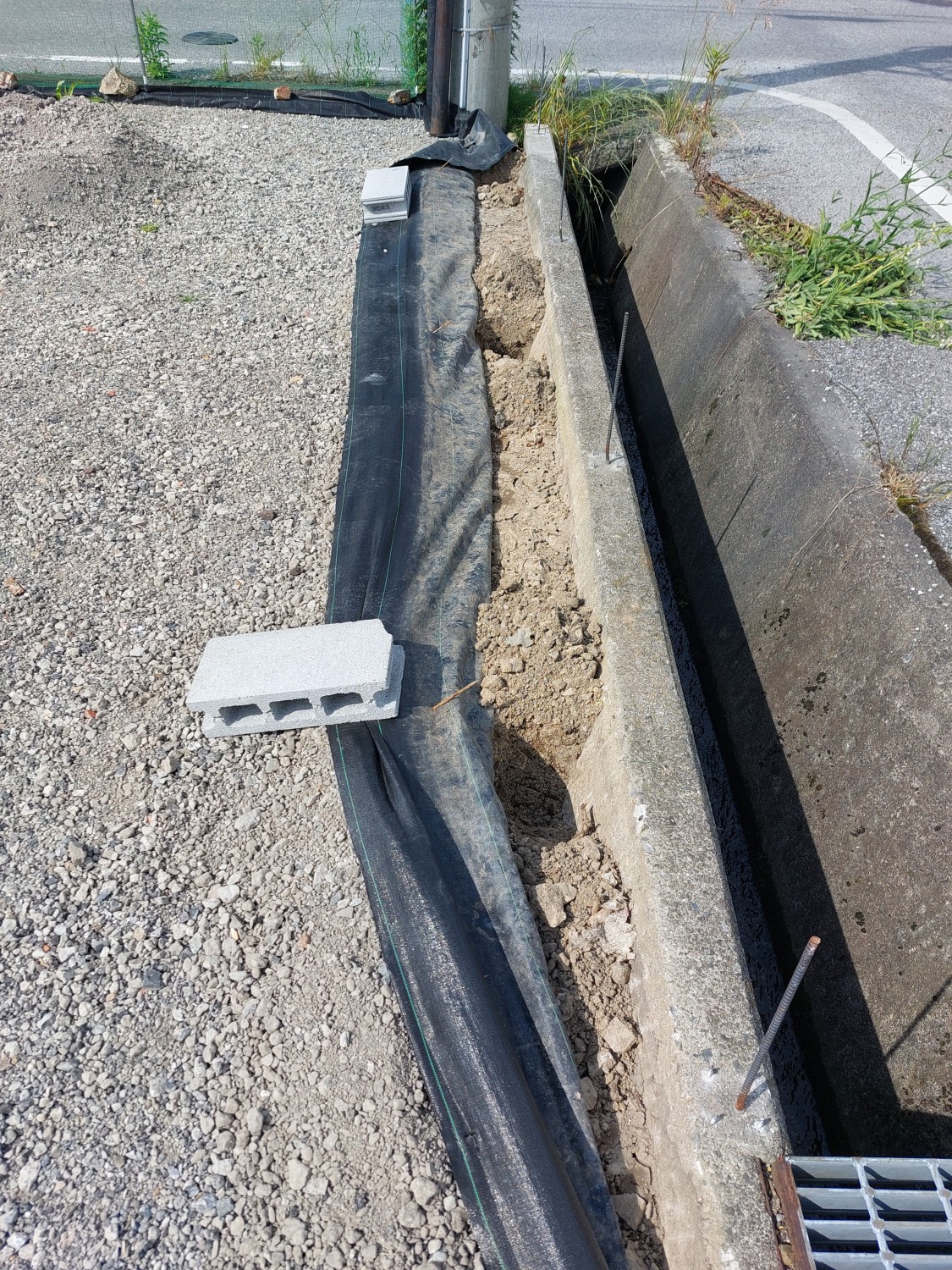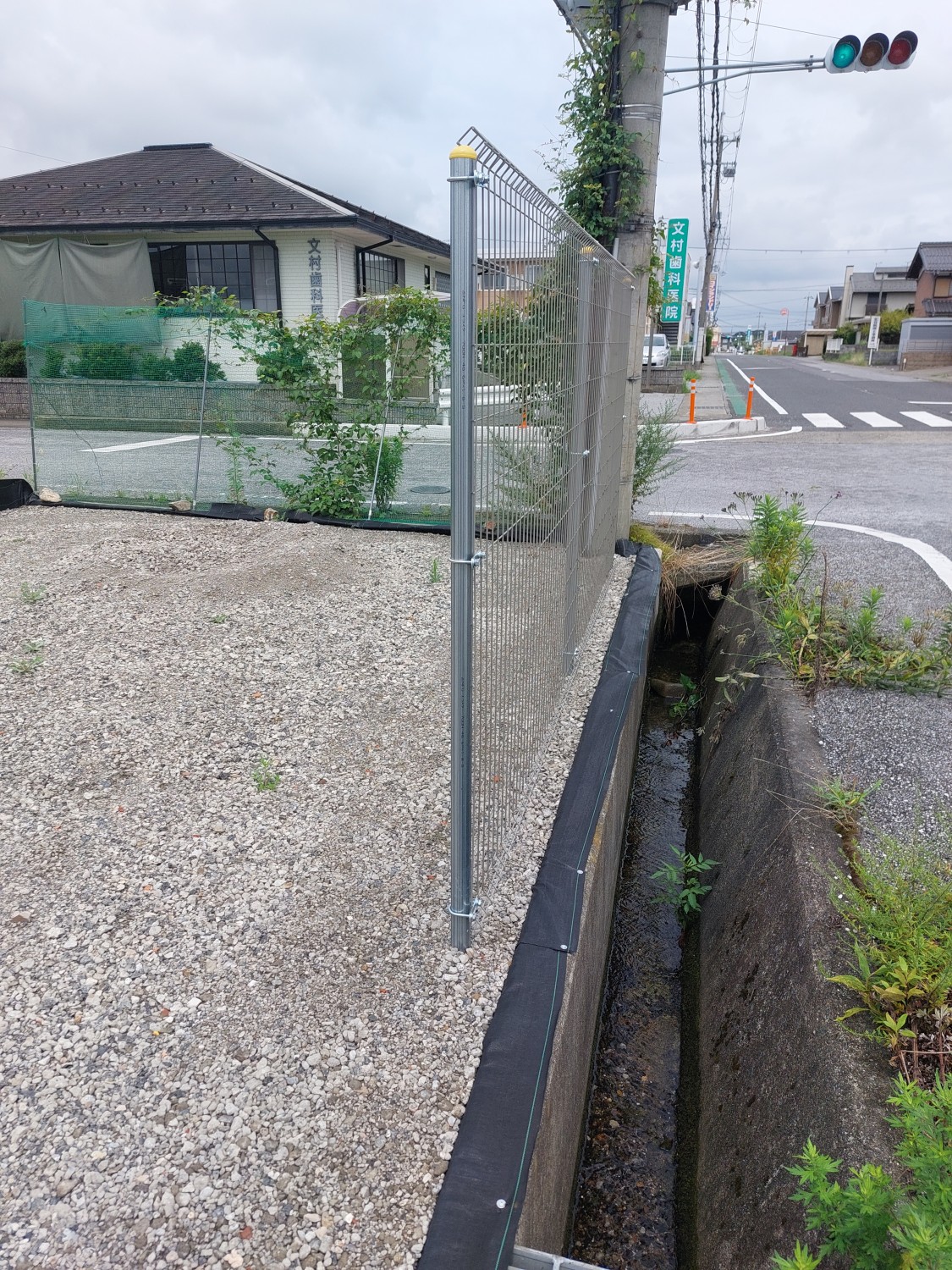 そしてフェンス本体の取り付けを行い、その後に土及び防草シート・砕石を戻し、敷均しを行ってからプレートにて転圧を施して仕上げました。