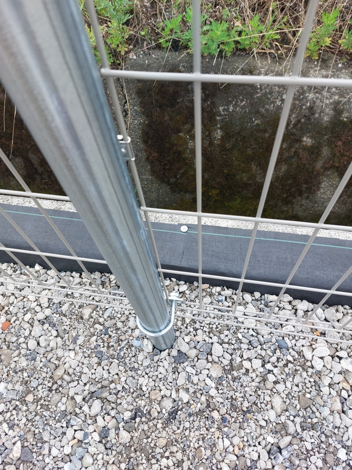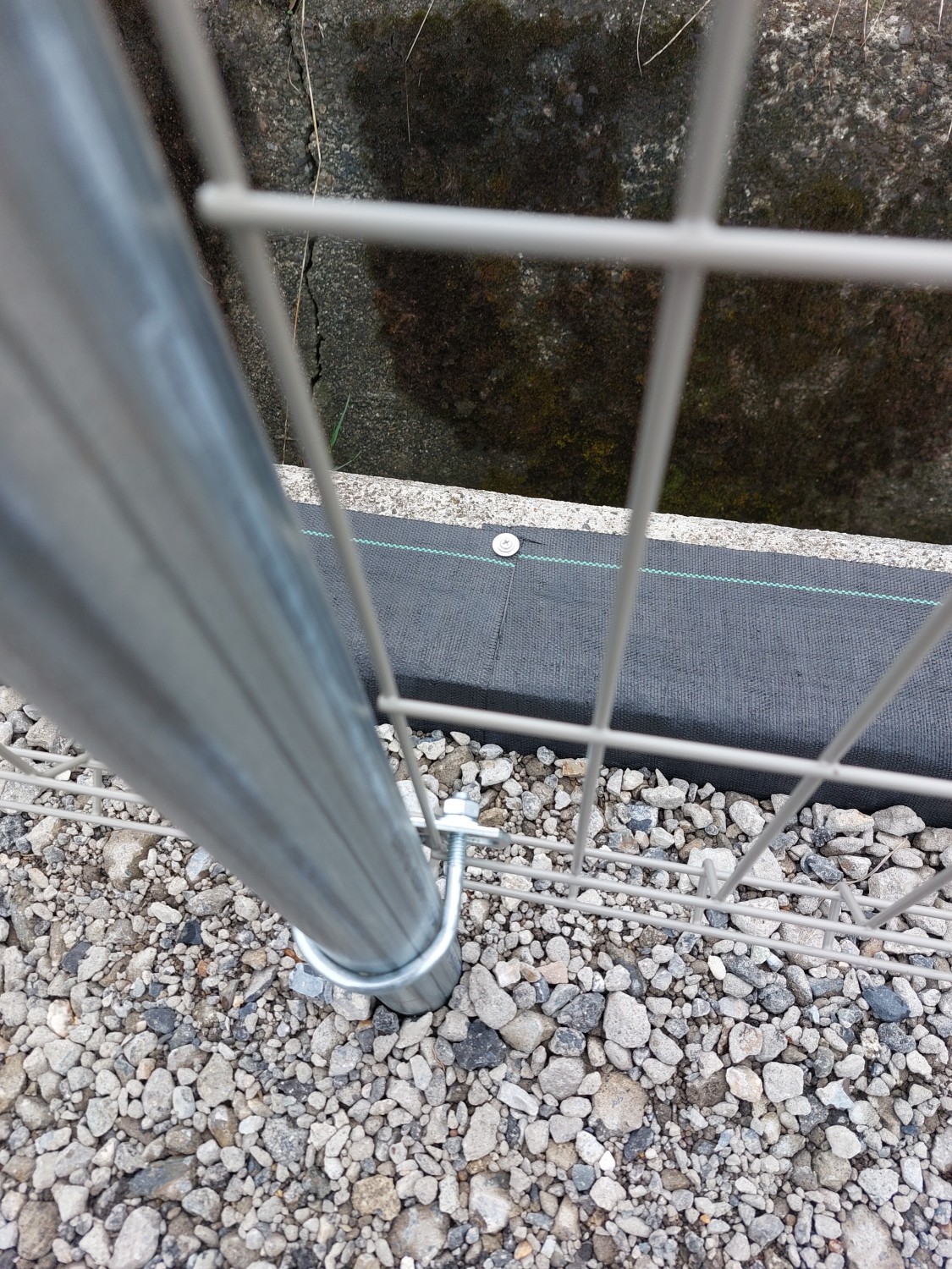 防草シートの端を擁壁基礎のコンクリート面に、コンクリートビスにて固定しました。