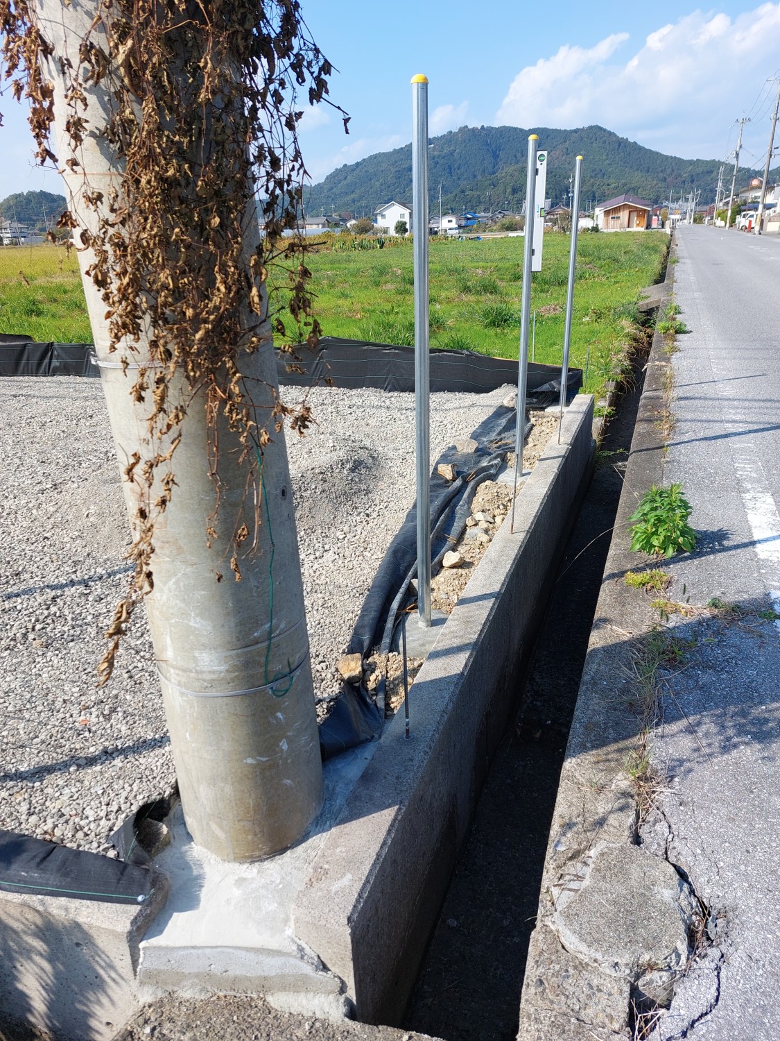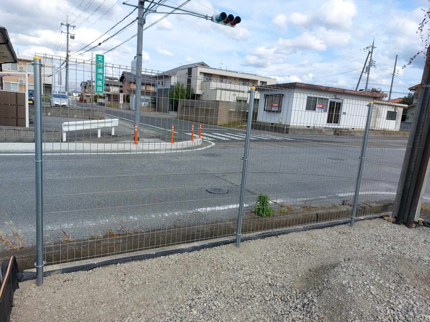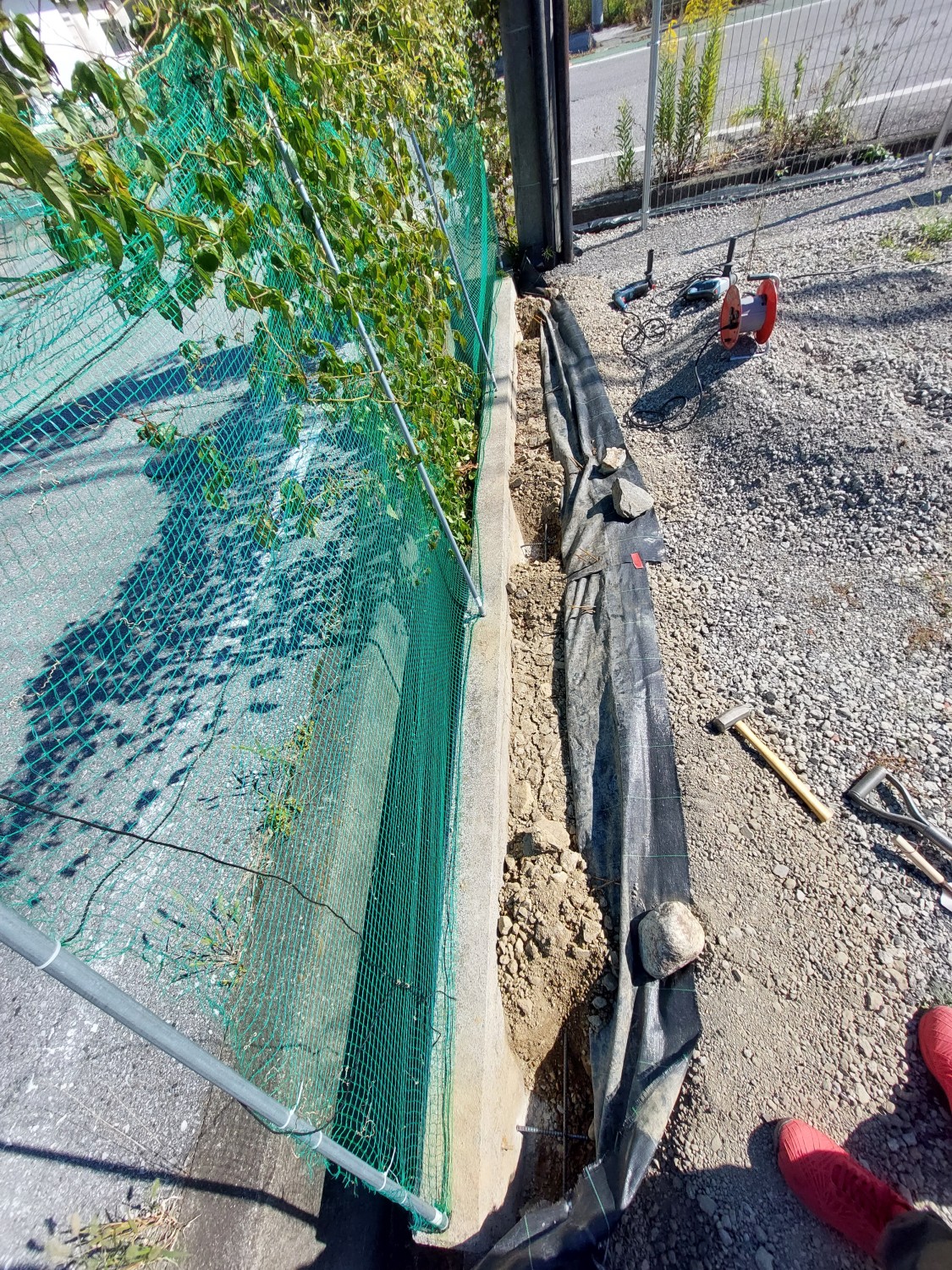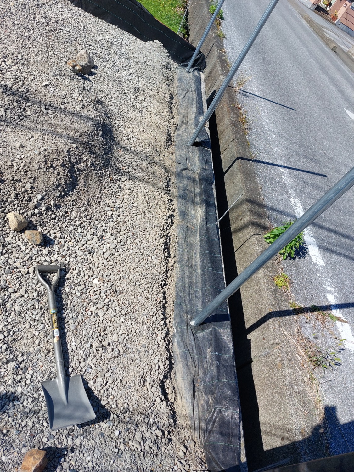 その後、固まってから土及び防草シート・砕石を敷き戻し、プレートにて転圧を行ってからフェンス本体を取り付けました。