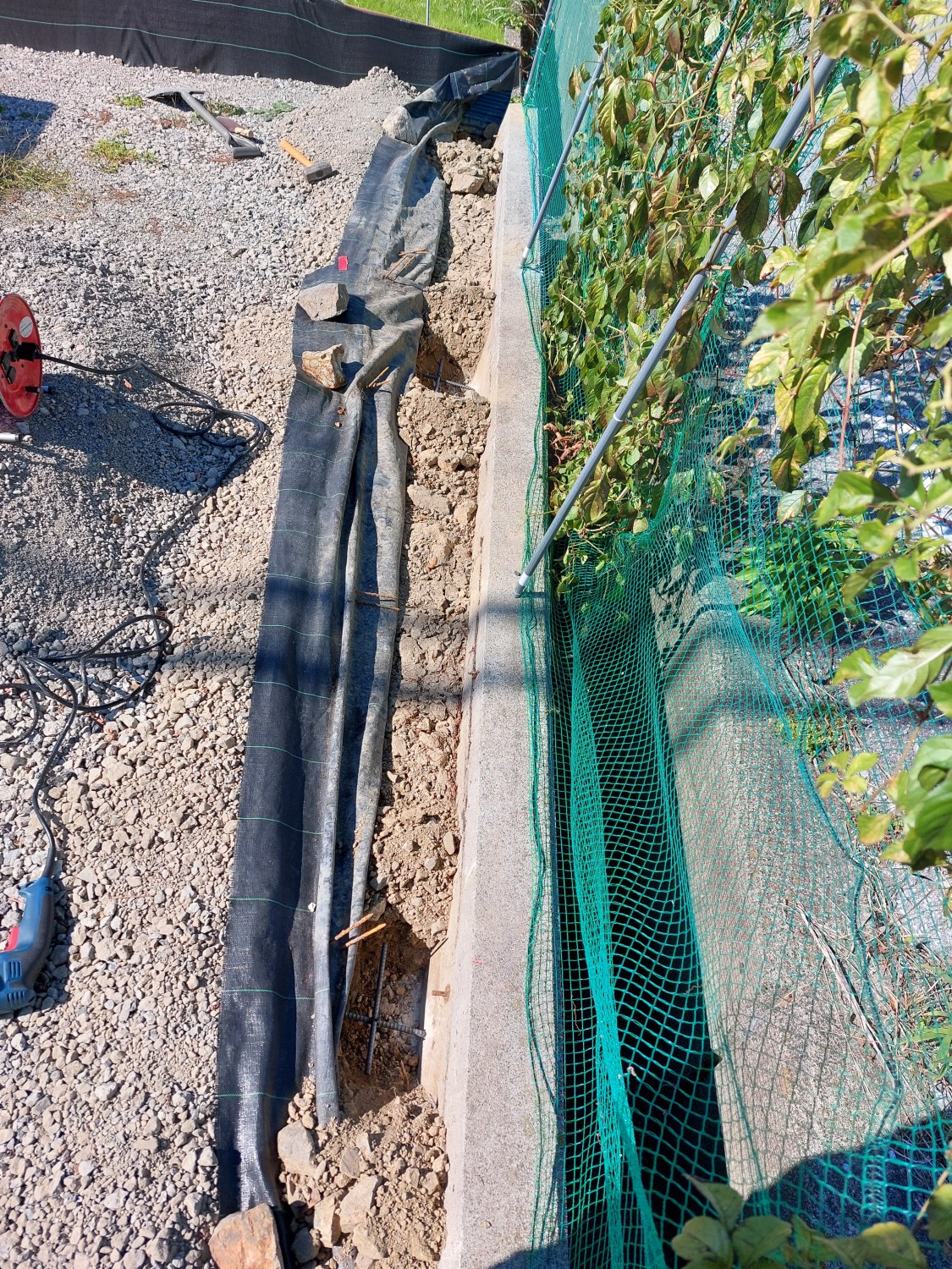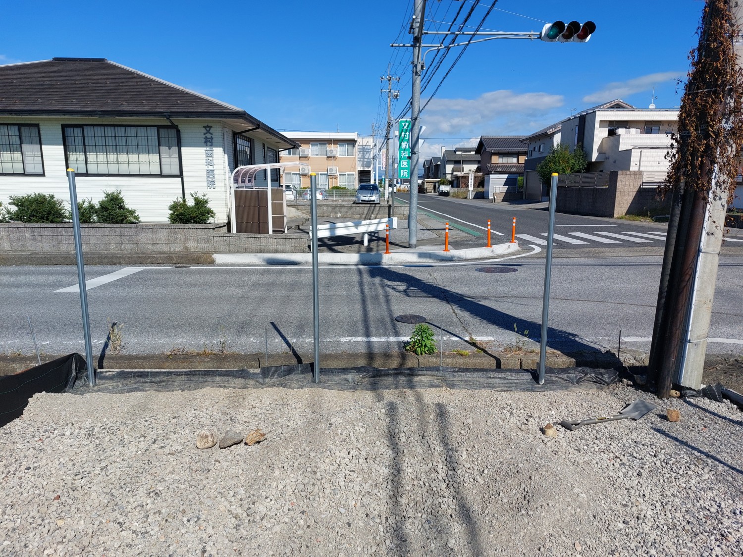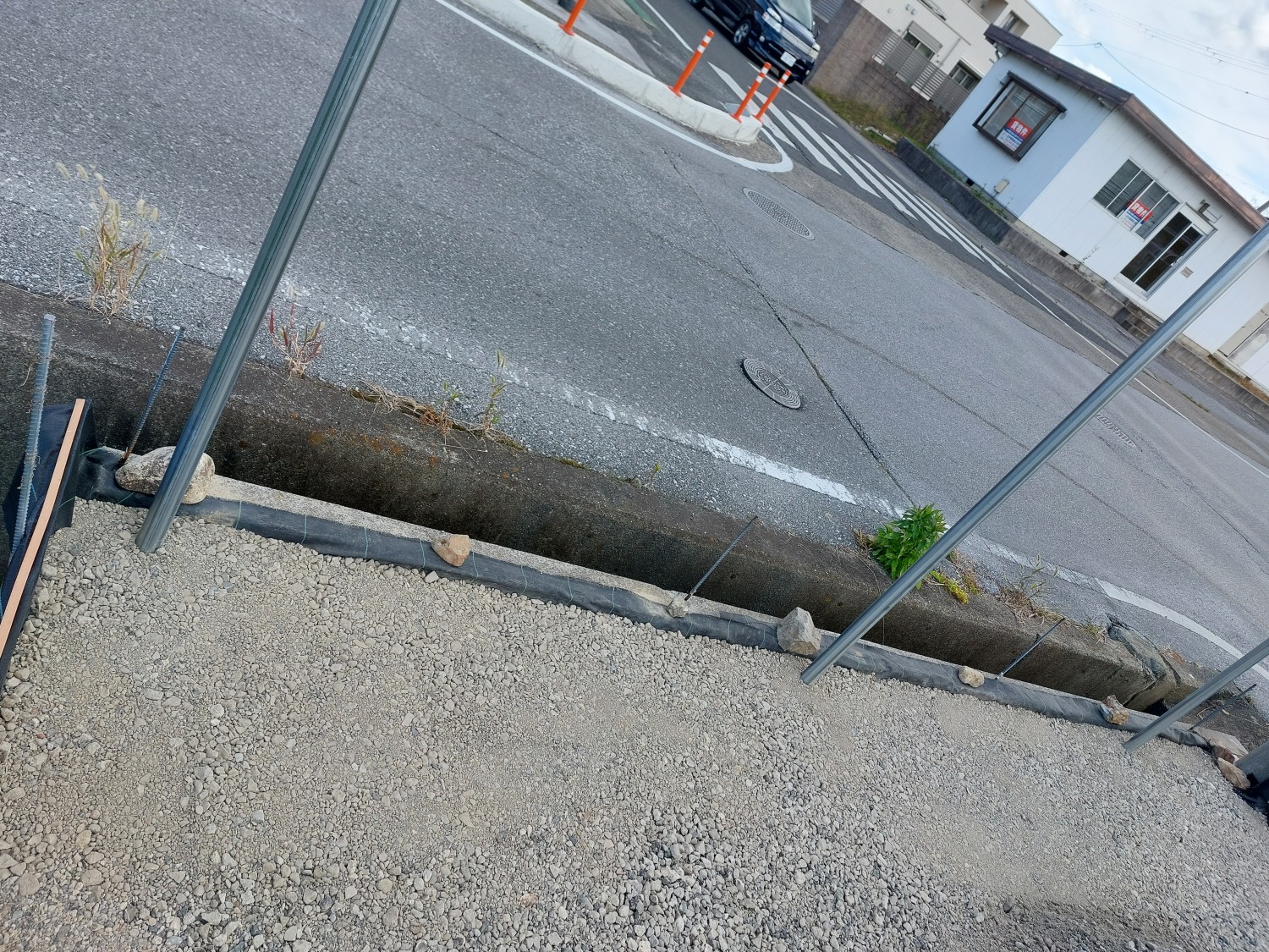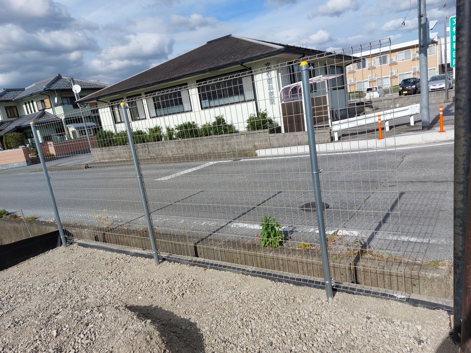 その後、固まってから土及び防草シート・砕石を敷き戻し、プレートにて転圧を行ってからフェンス本体を取り付けました。