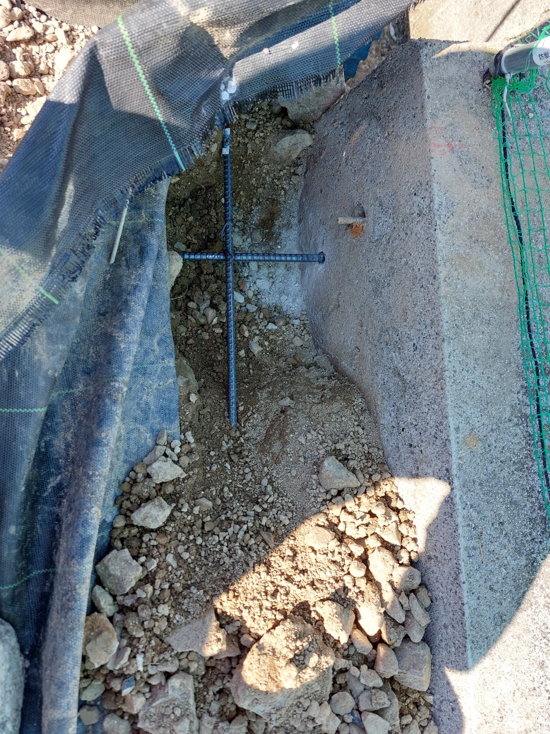 オートレベルにて高さを出し、均一に穴を掘ってそこに差筋アンカー及び鉄筋にて、補強及び擁壁基礎との一体化となるようにしました。
