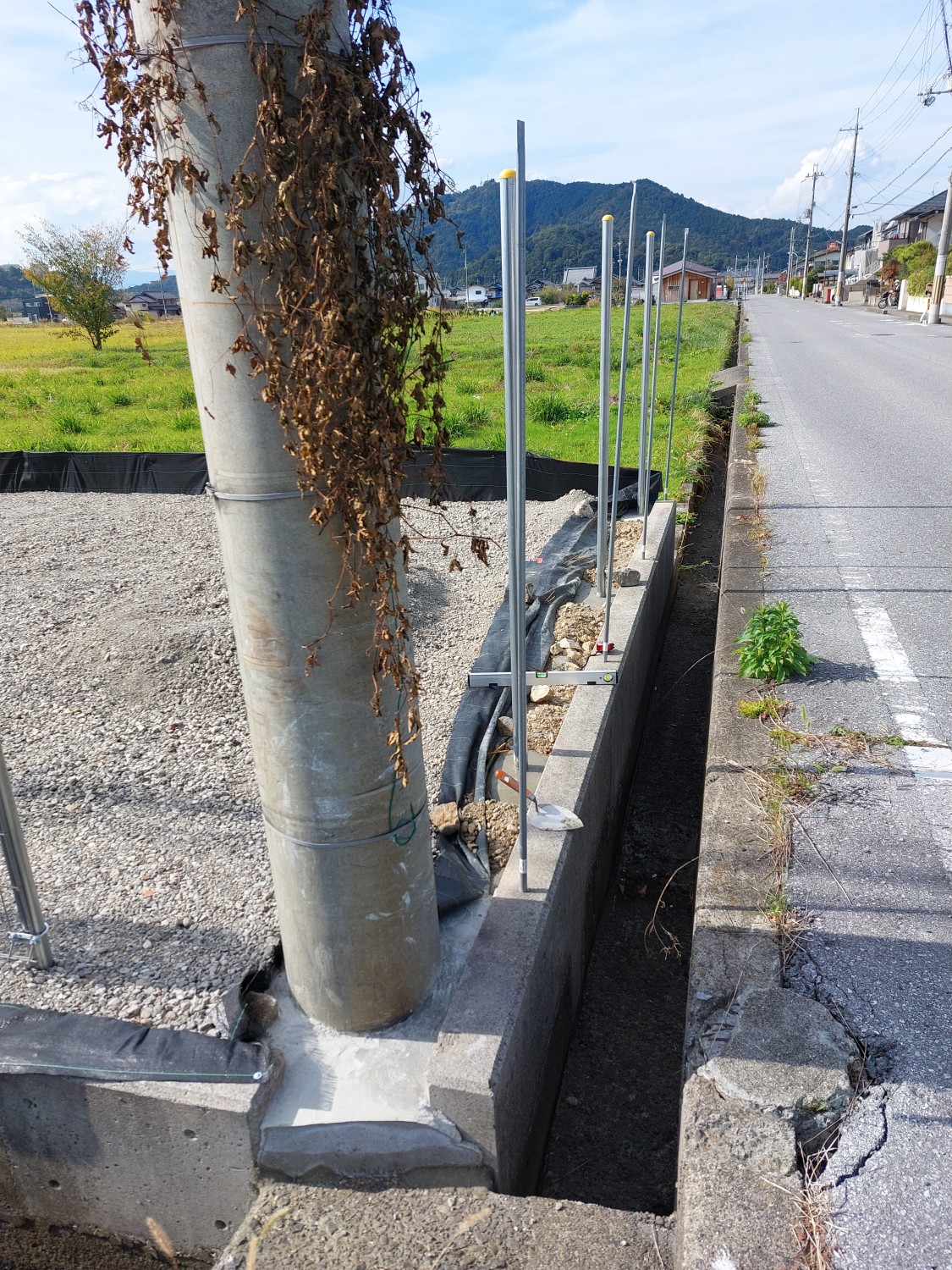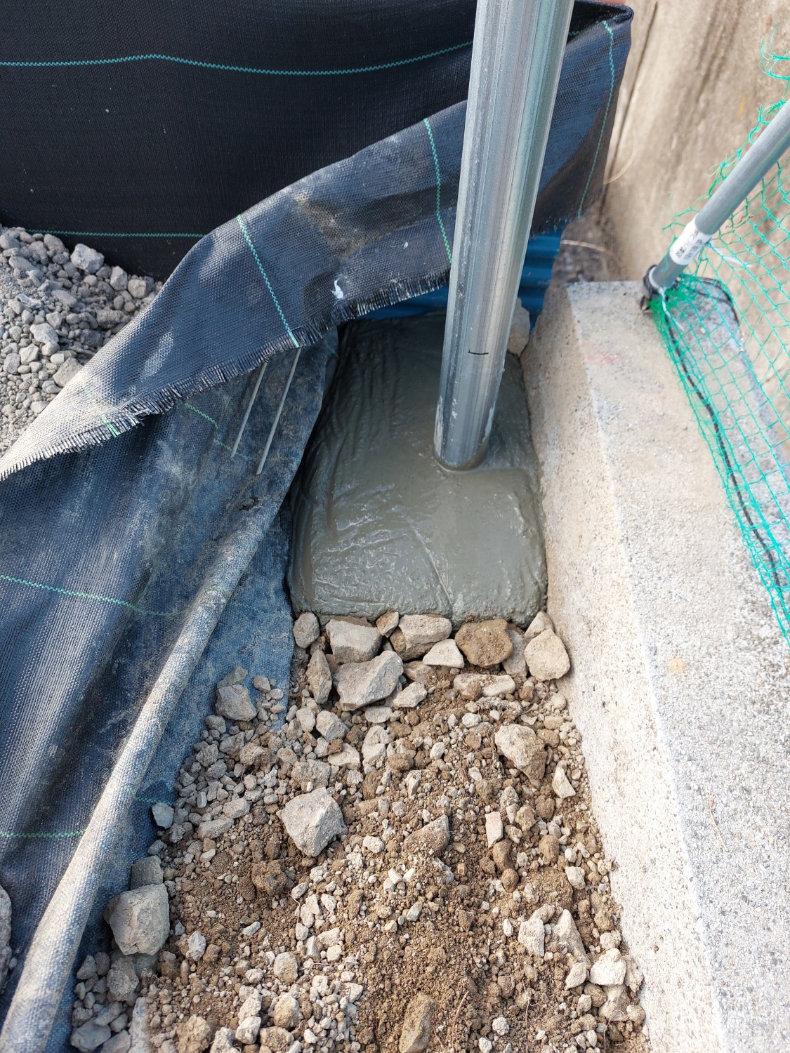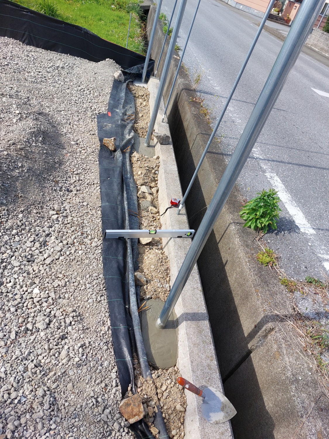 そして、擁壁基礎にプライマーを塗布し、単管パイプをレベル出ししながら、モルタルにて土中に埋設して固定しました。