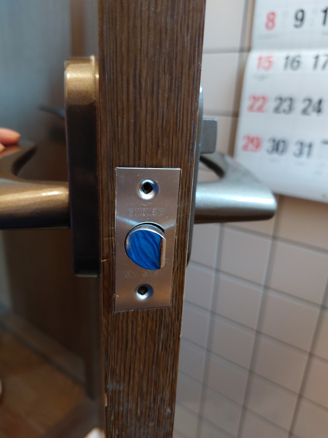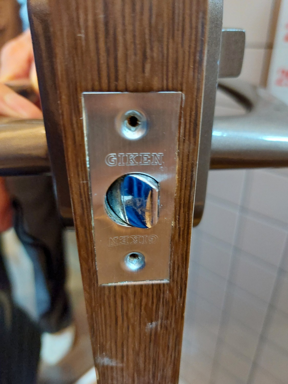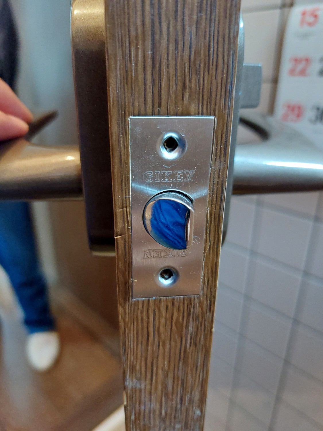 トイレのレバー式のドアノブのロック部分の出っ張りが、中に入ったまま戻って来なくなった為、ドアを閉めた時にドアが止まらず開いてきてしまうと連絡を受けまして、一度確認に伺いその日のうちにドアの部品を用意して、中の部品を交換致しました。