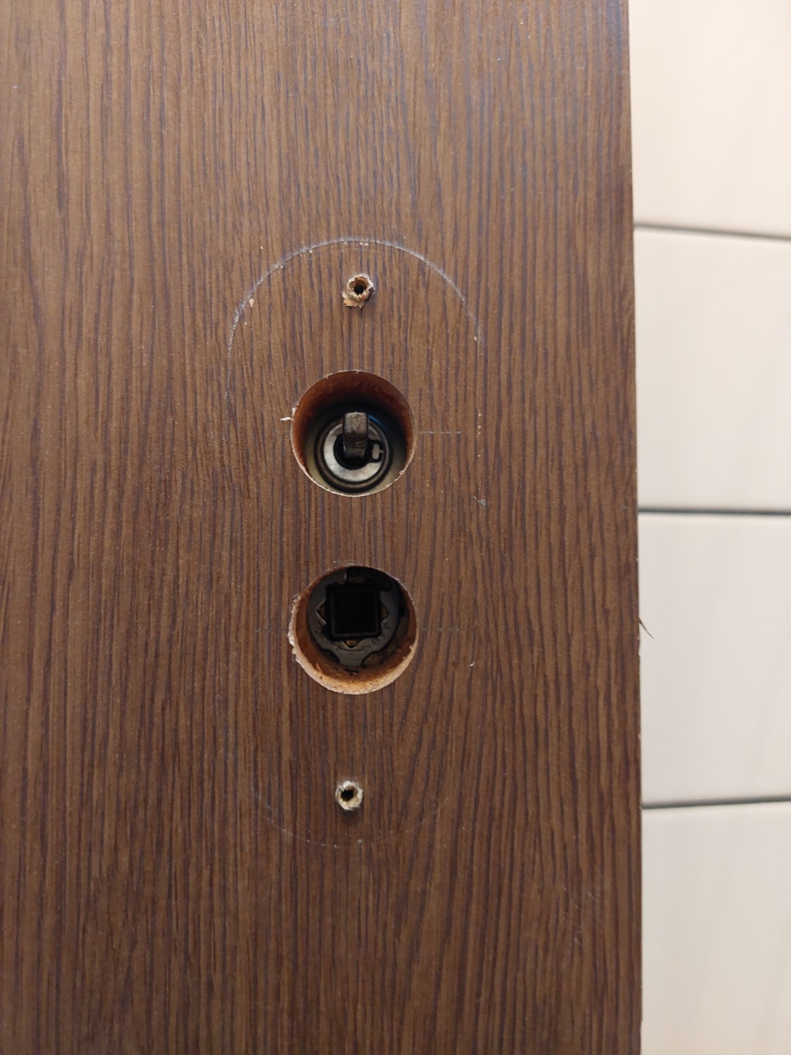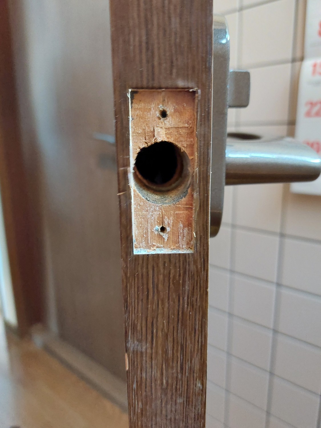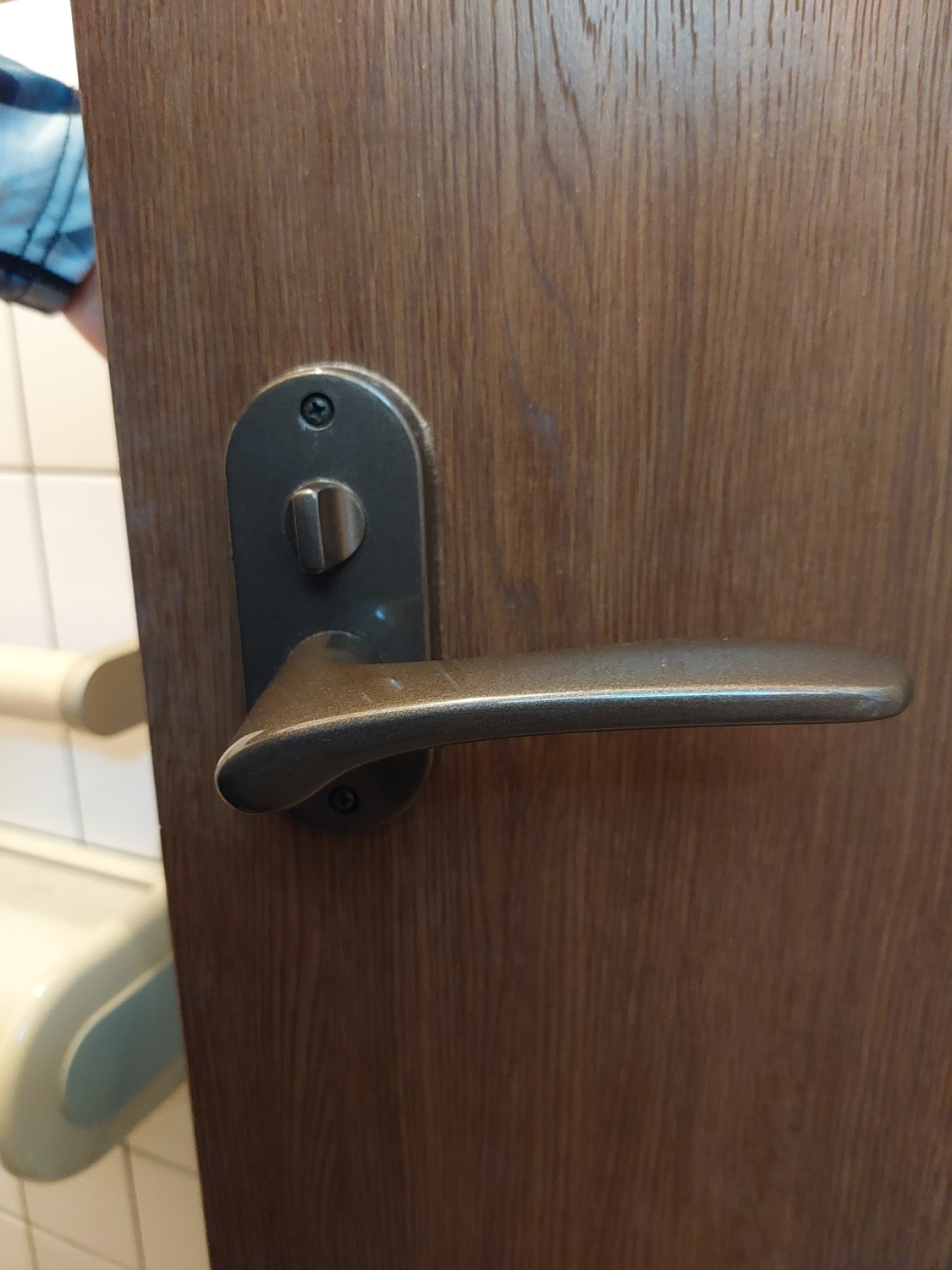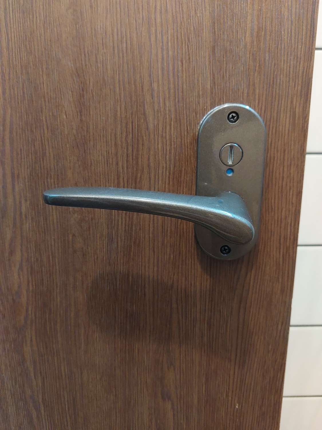 トイレのレバー式のドアノブのロック部分の出っ張りが、中に入ったまま戻って来なくなった為、ドアを閉めた時にドアが止まらず開いてきてしまうと連絡を受けまして、一度確認に伺いその日のうちにドアの部品を用意して、中の部品を交換致しました。