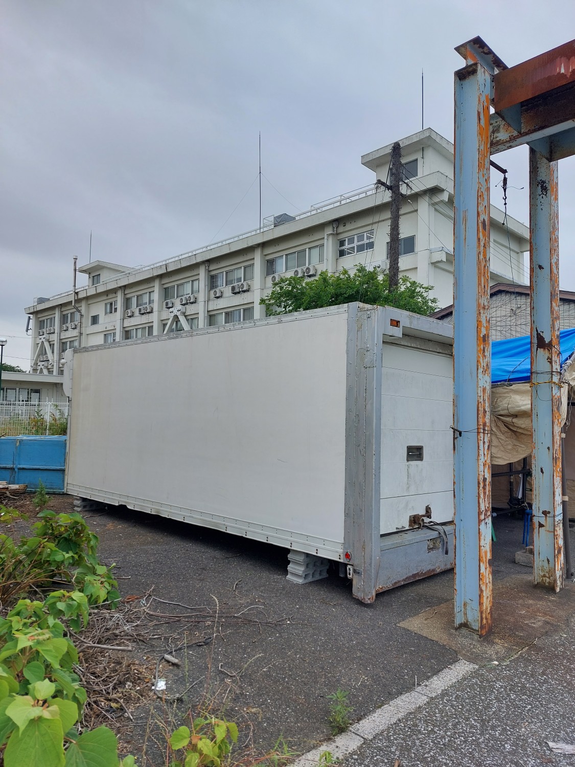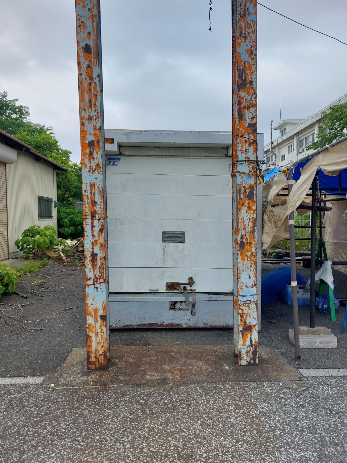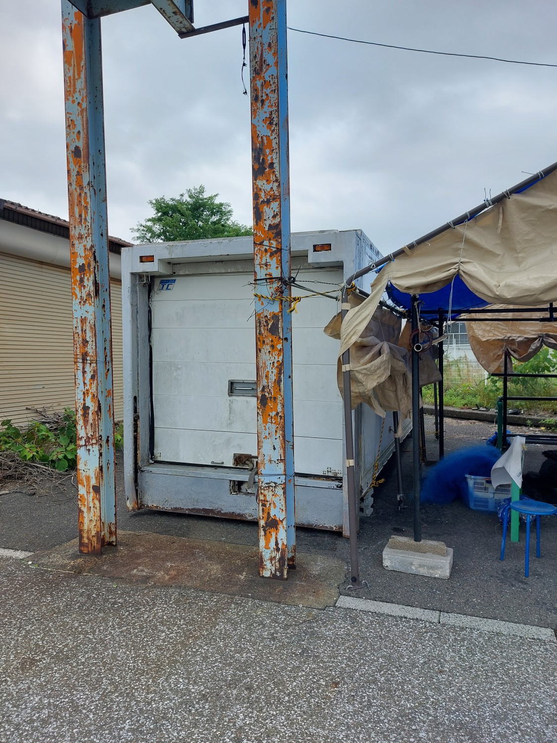 真正面から見ますと冷凍コンテナが傾いているように見えますが、手前のクレーンのH鋼(鉄骨)が左に結構傾いている為、そのように見えますが冷凍コンテナはしっかりと水平出しを行い、調整していますので真っ直ぐに設置出来ています。