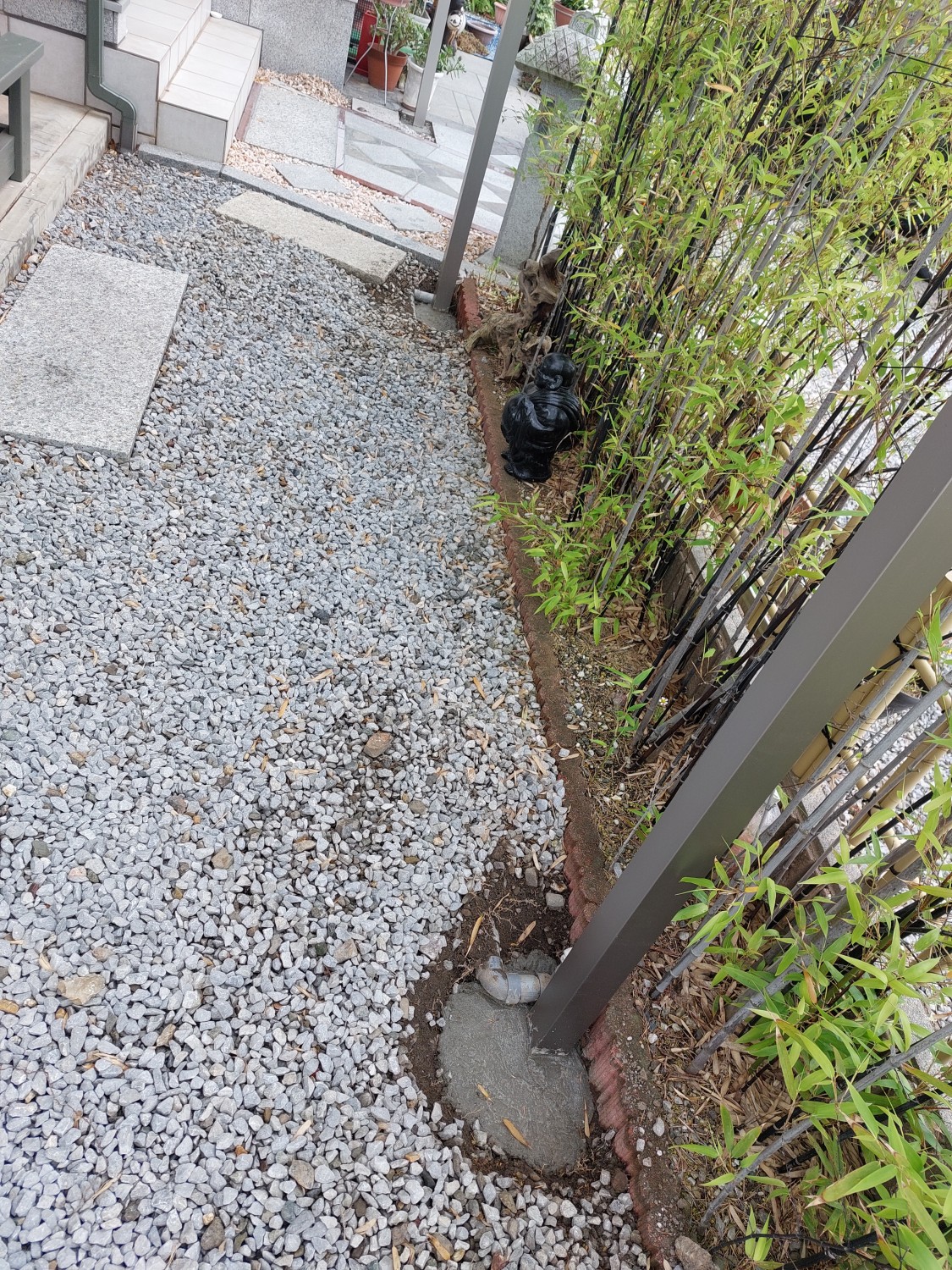 自在柱ですので、前の柱の位置へ合わせて取り付けをおこない、雨水の排水の為の埋設部の塩ビパイプ配管を、新規のテラスの雨水の竪樋に合わせて、加工・延長・接続をおこないました。
