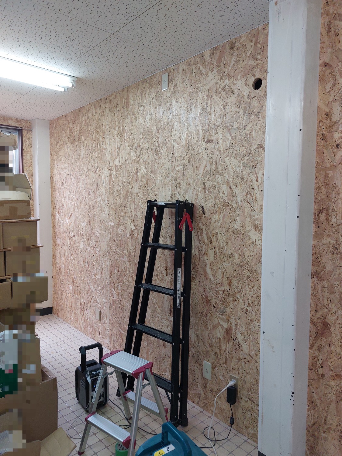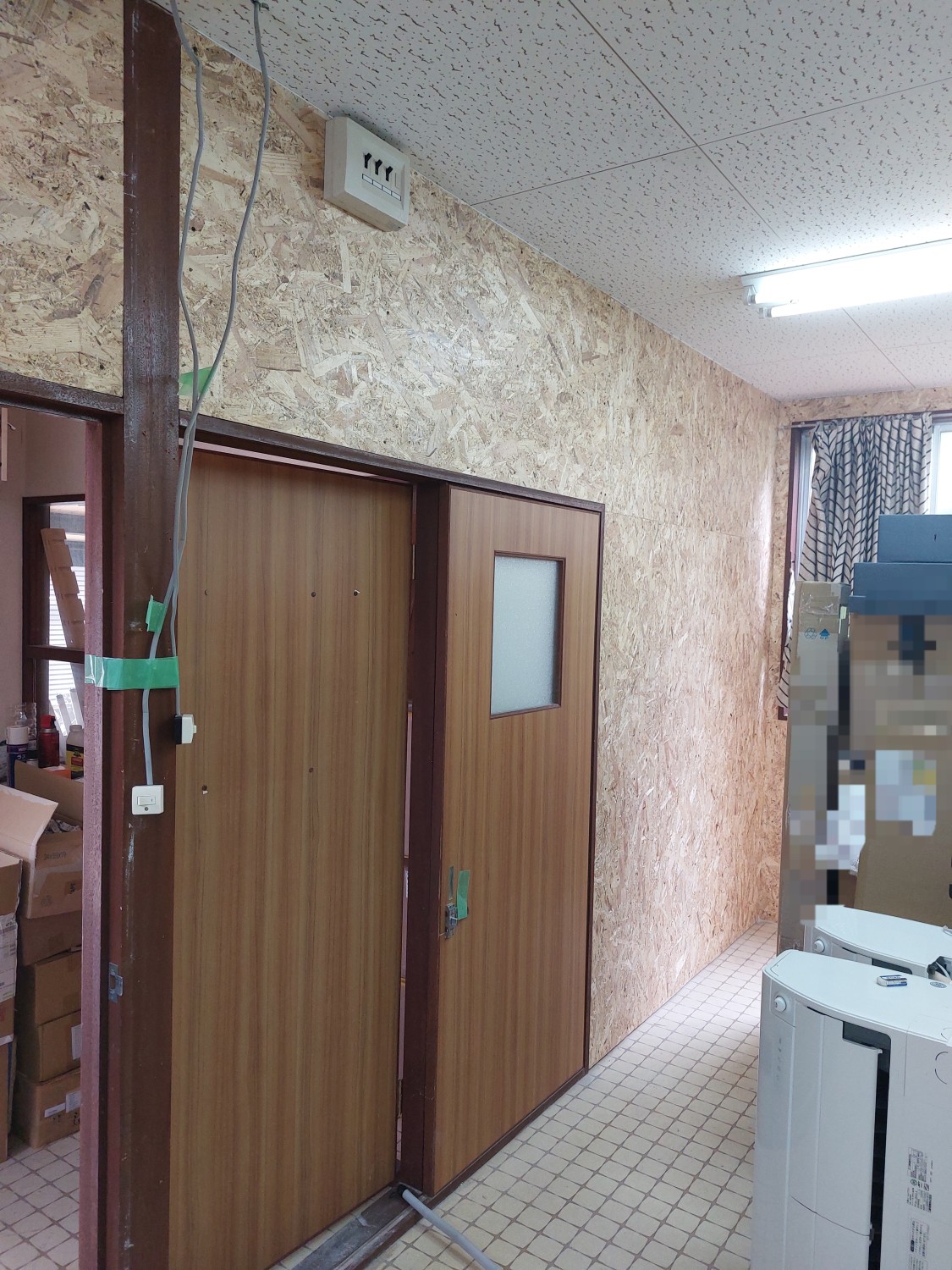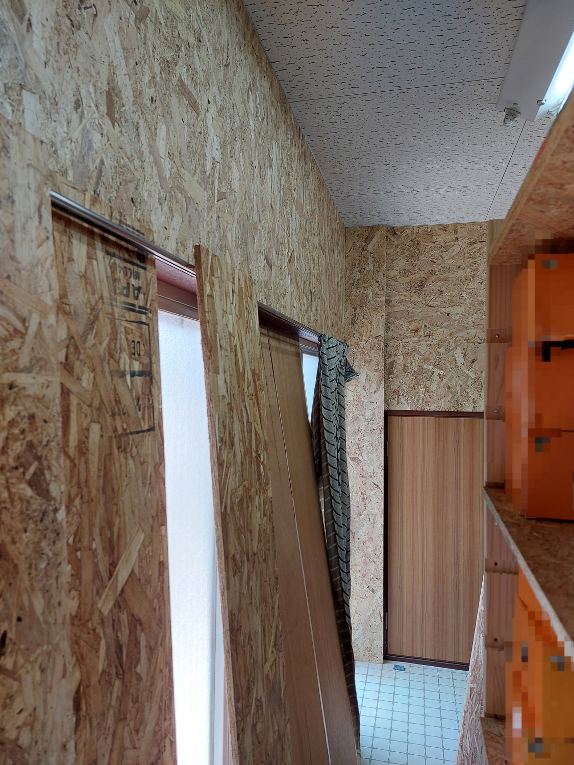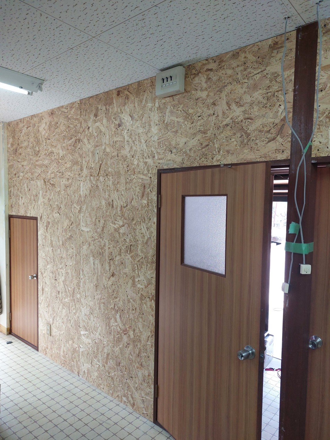 仕切り壁を解体して、2部屋を1部屋にした部屋の壁の石膏ボードもだいぶ傷んでいましたので、補強工事としましてオシャレな木地の木板を張りました。
