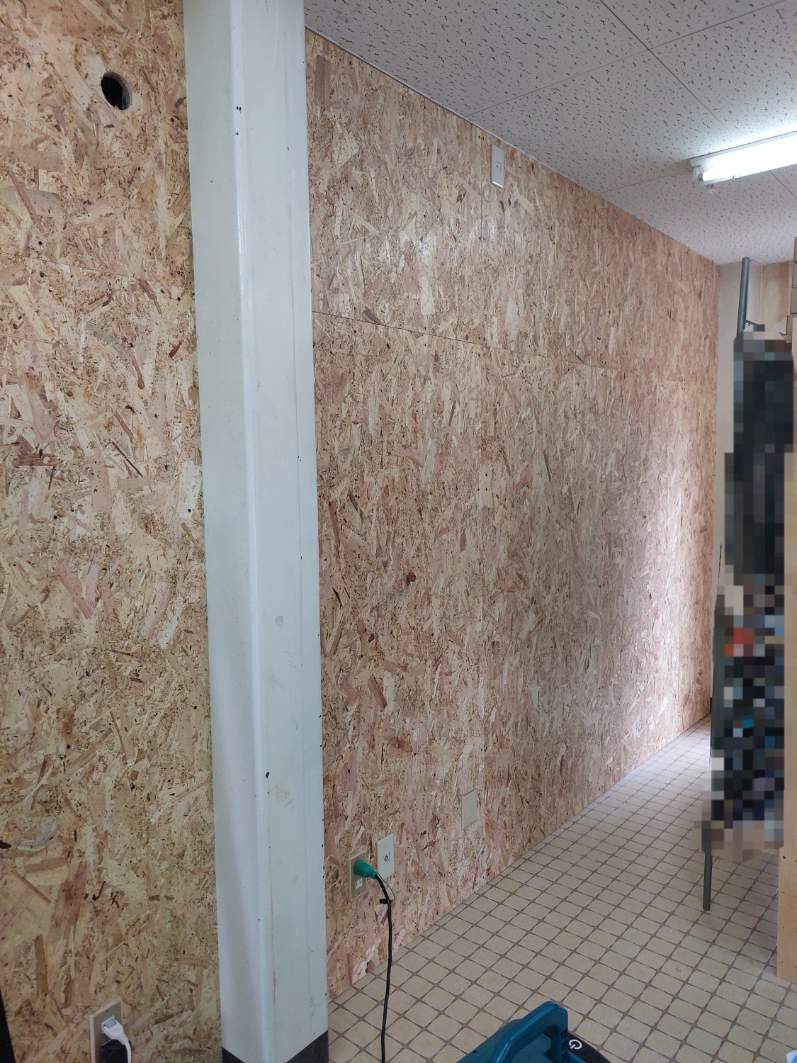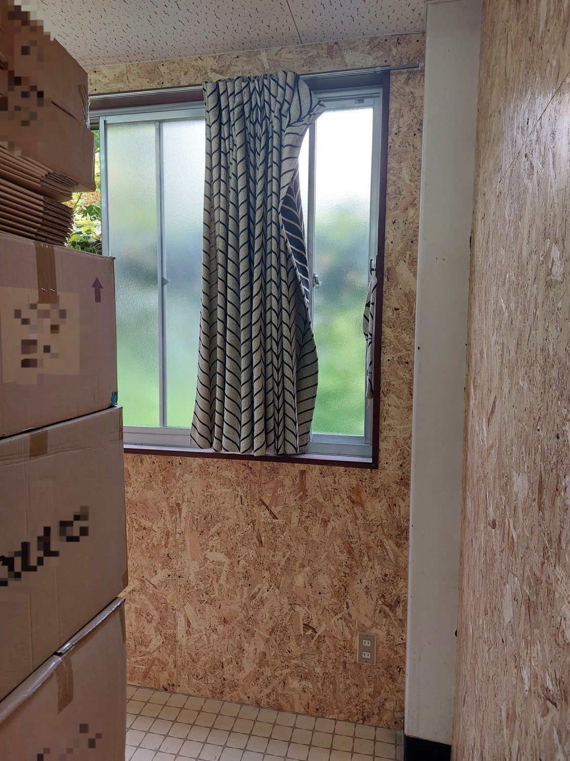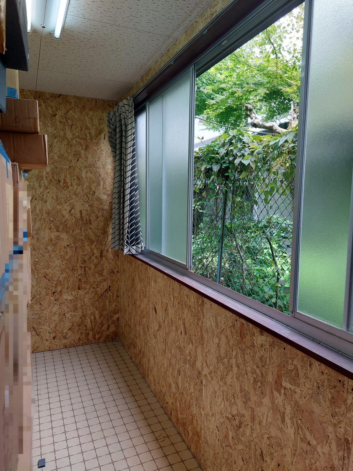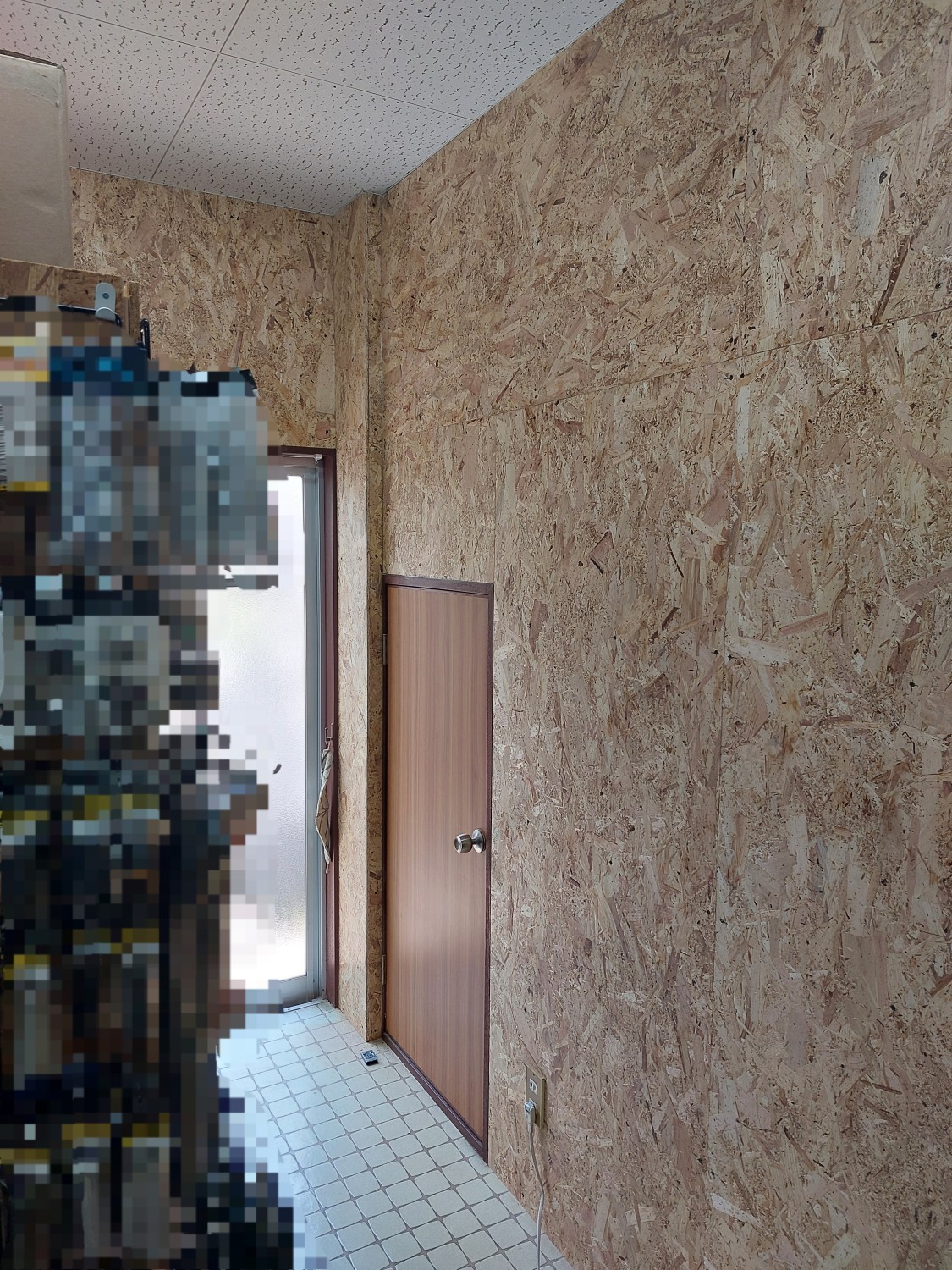 仕切り壁を解体して、2部屋を1部屋にした部屋の壁の石膏ボードもだいぶ傷んでいましたので、補強工事としましてオシャレな木地の木板を張りました。