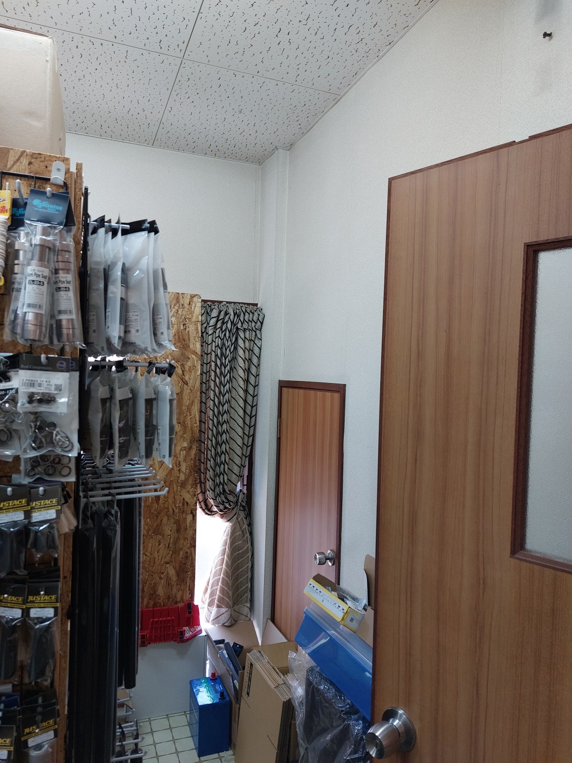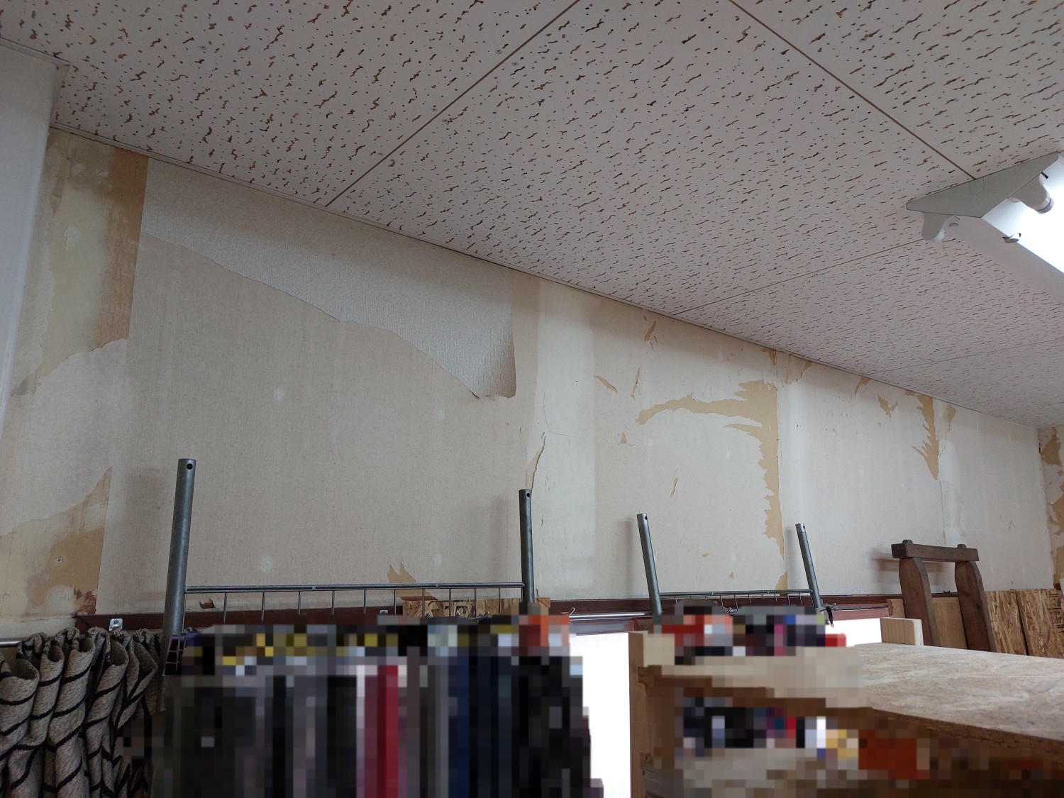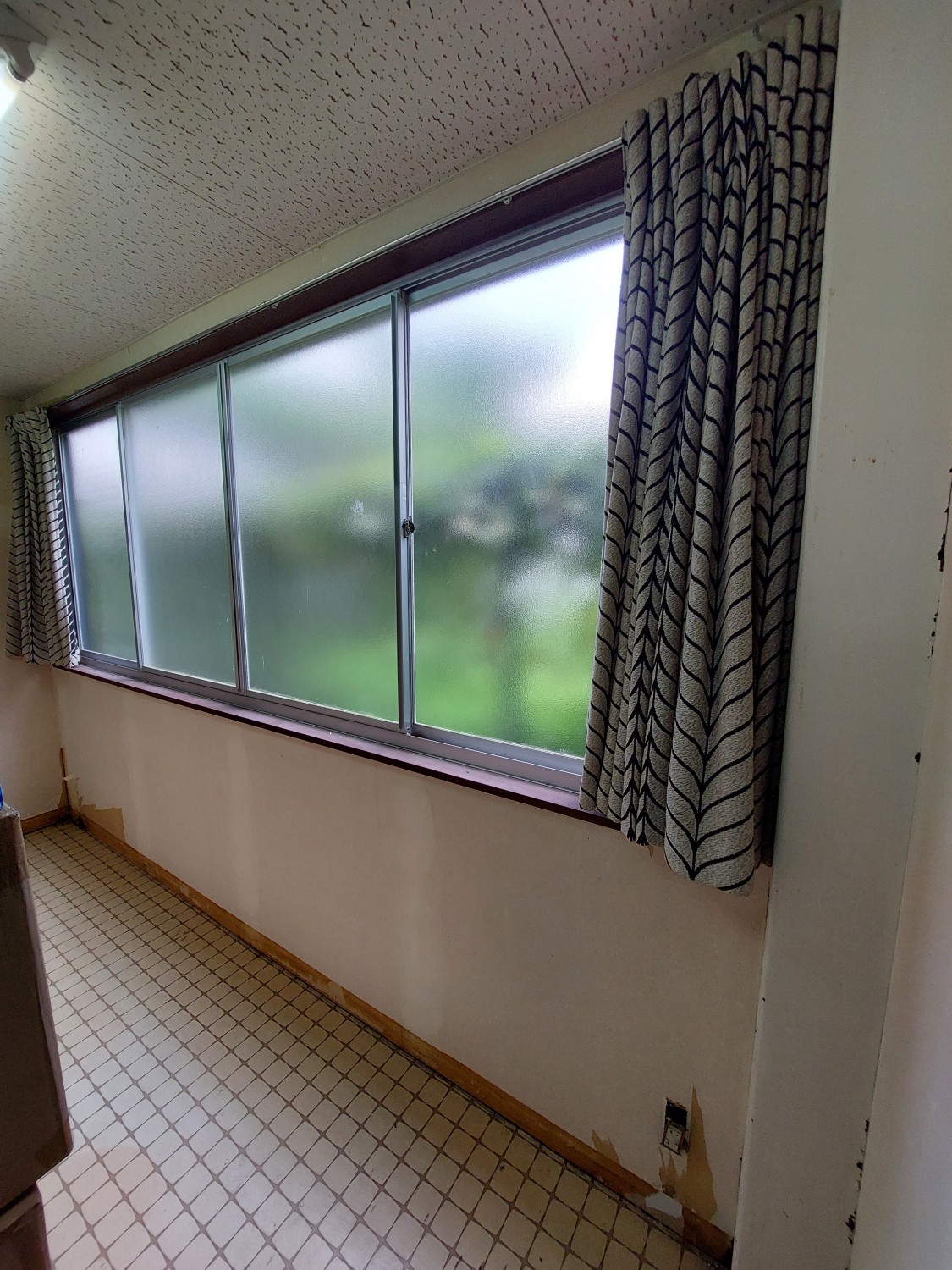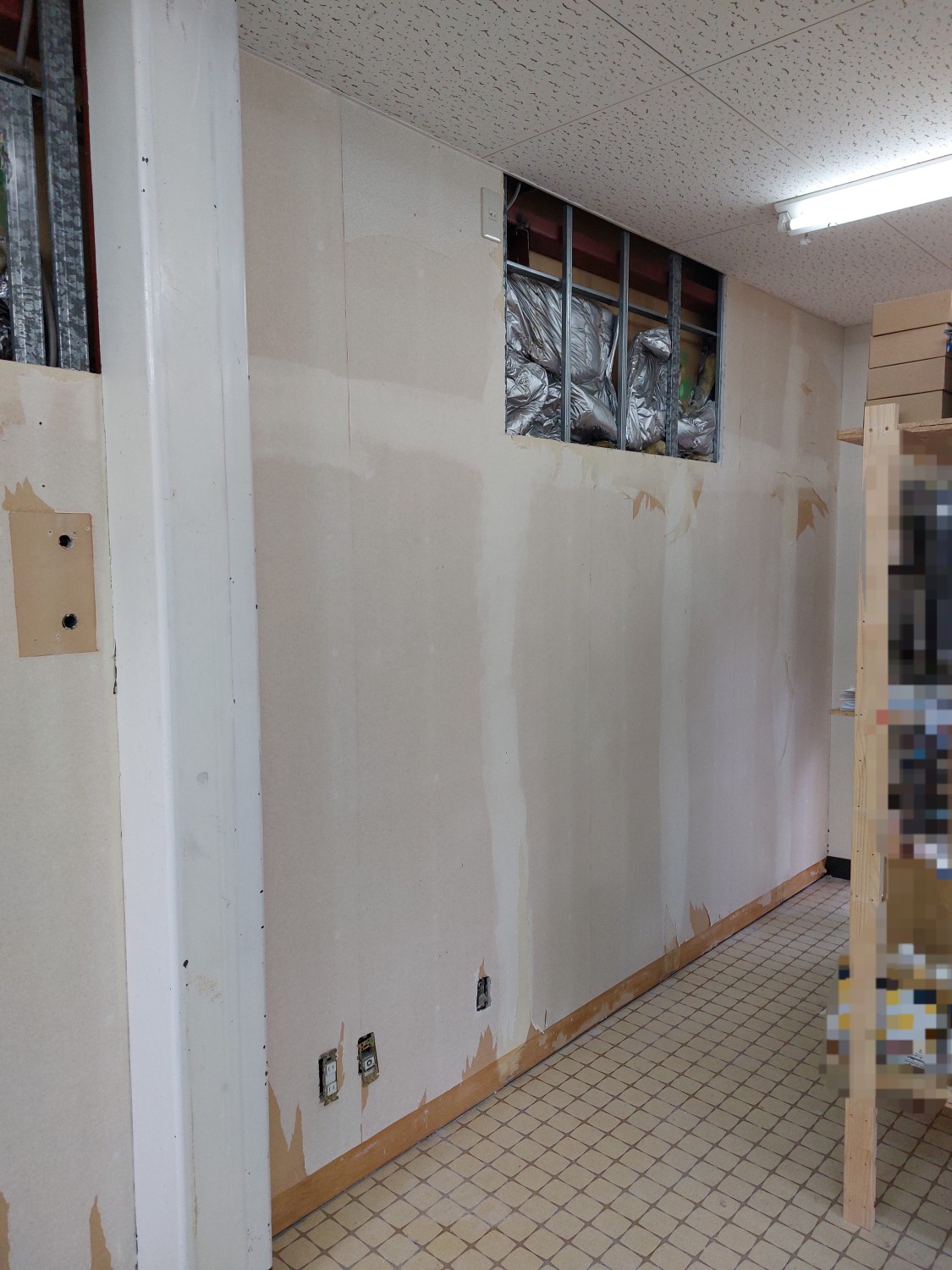 仕切り壁を解体して、2部屋を1部屋にした部屋の壁の石膏ボードもだいぶ傷んでいましたので、補強工事としましてオシャレな木地の木板を張りました。