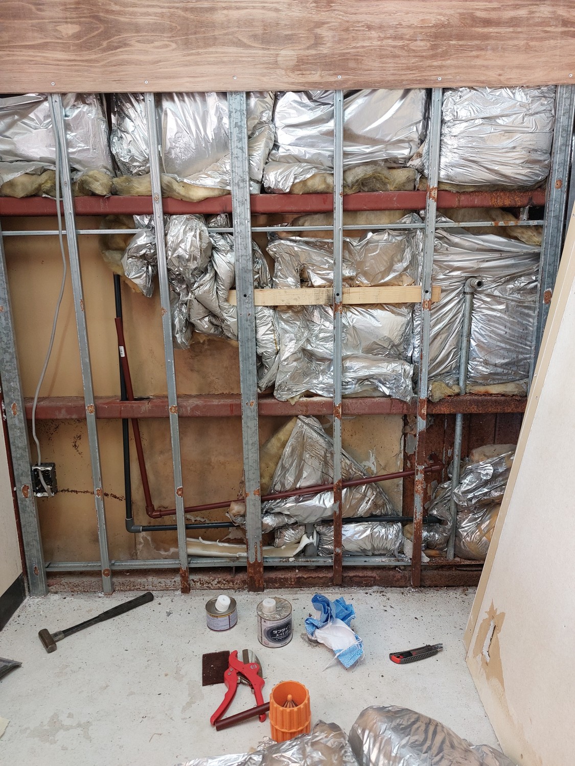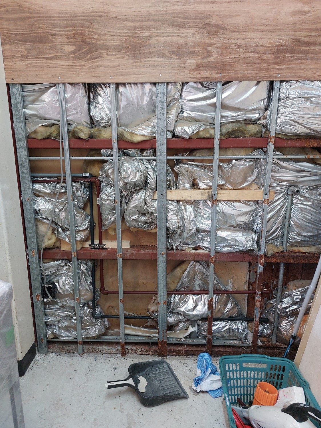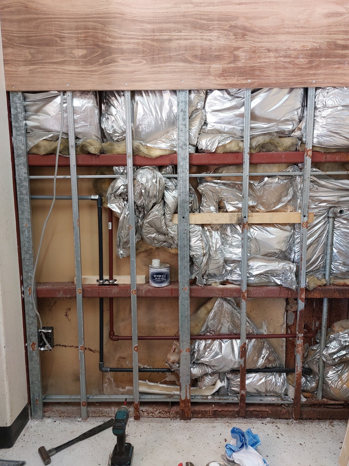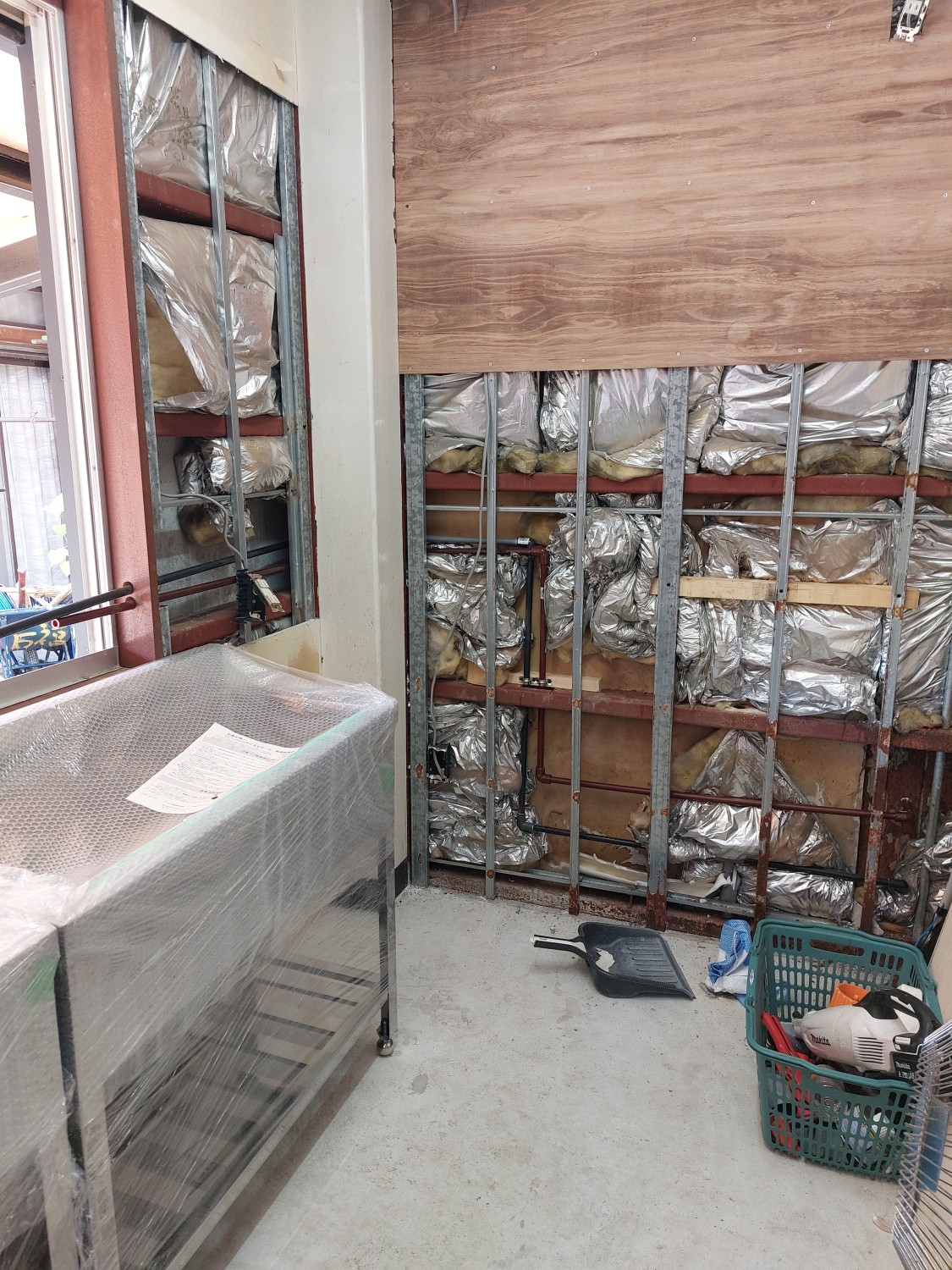 業務用キッチンのスペースの施工にて、既存の1本通っていた水道配管を分岐して、水道(水)配管の延長と給湯器へ繋げて、お湯の配管を並行に沿わして取り付けました。