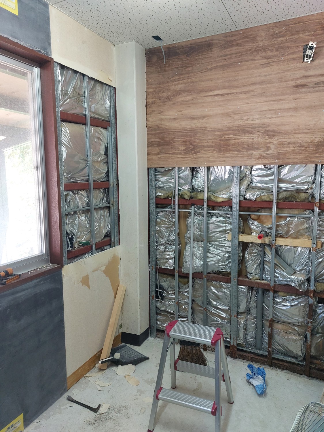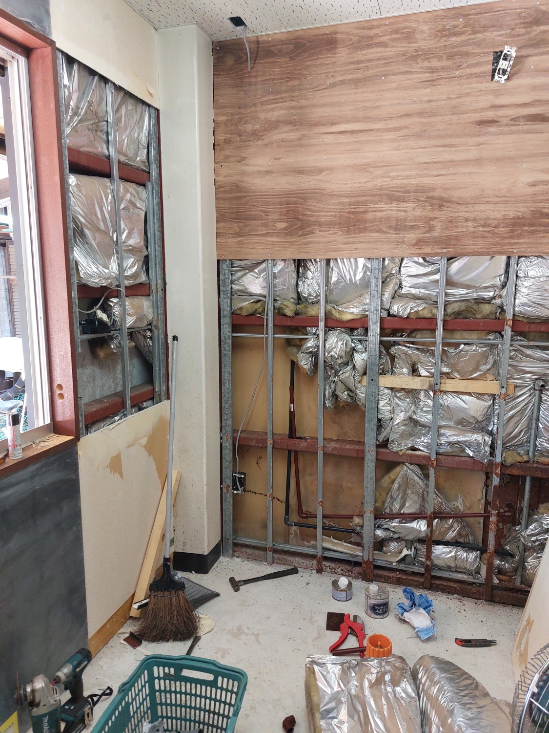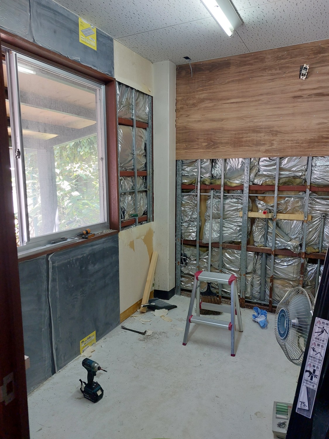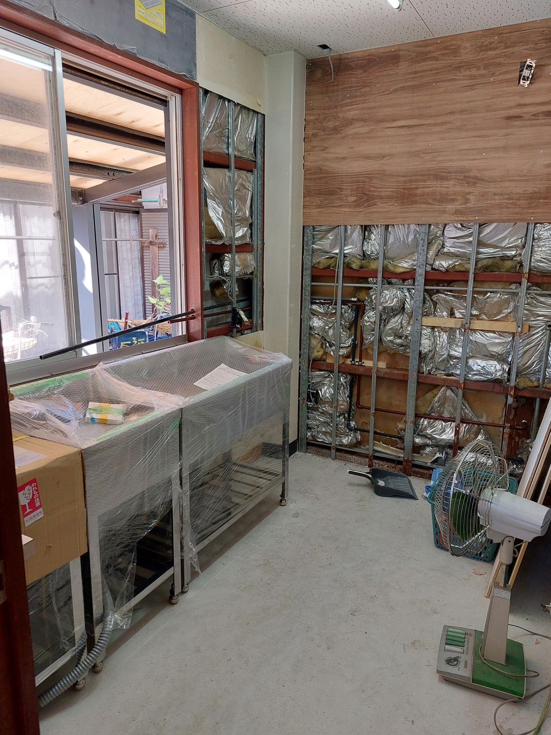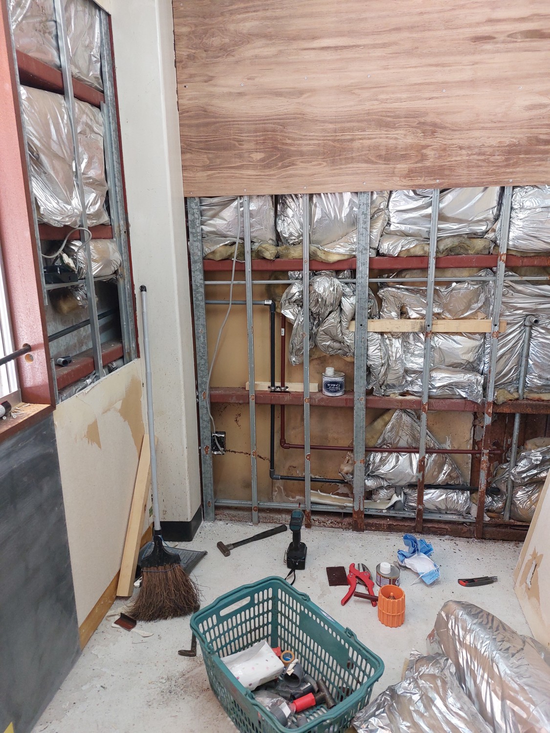 業務用キッチンのスペースの施工にて、既存の1本通っていた水道配管を分岐して、水道(水)配管の延長と給湯器へ繋げて、お湯の配管を並行に沿わして取り付けました。