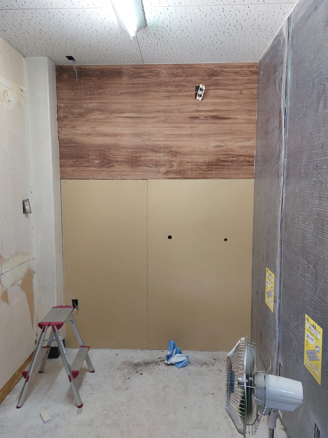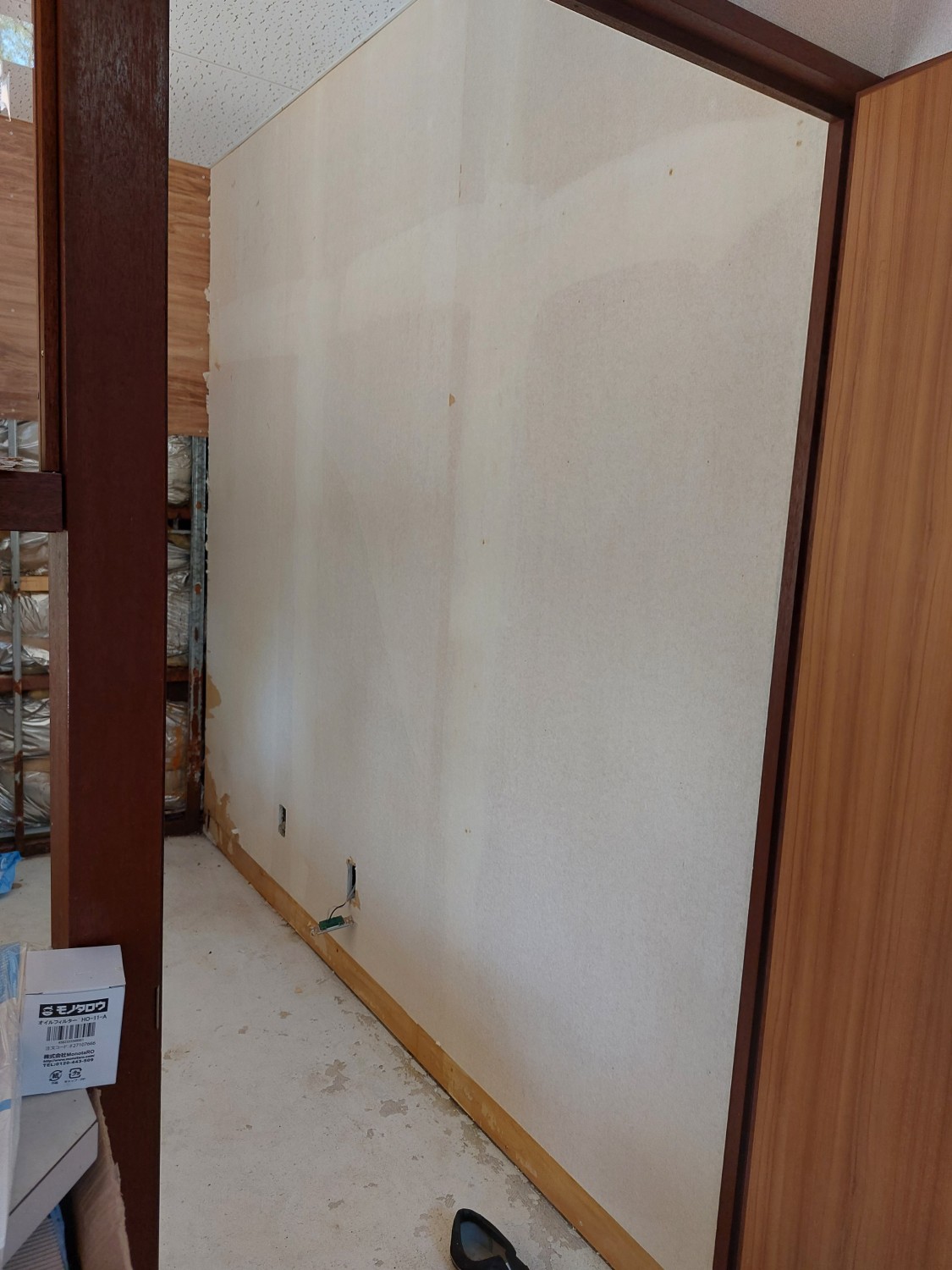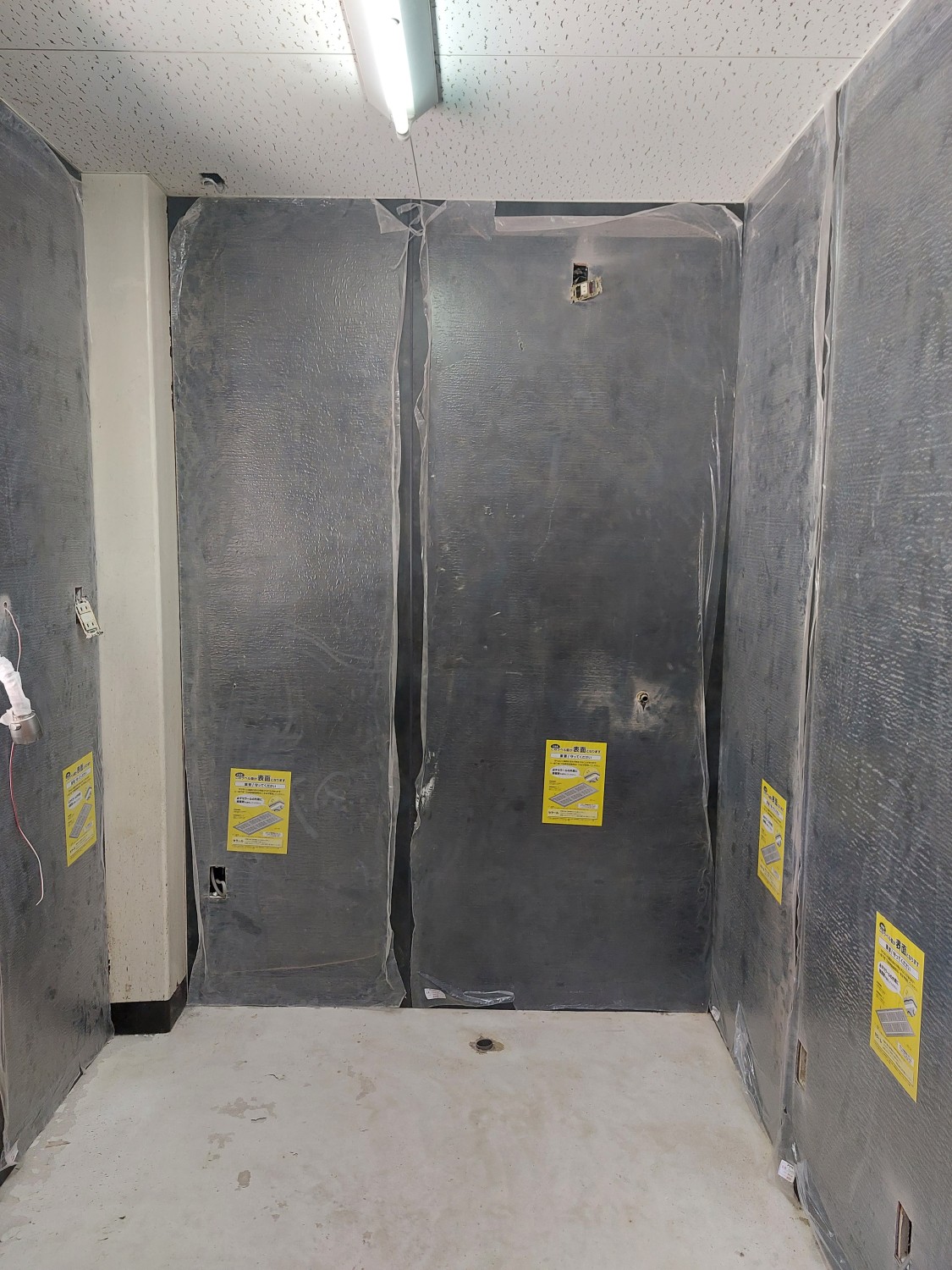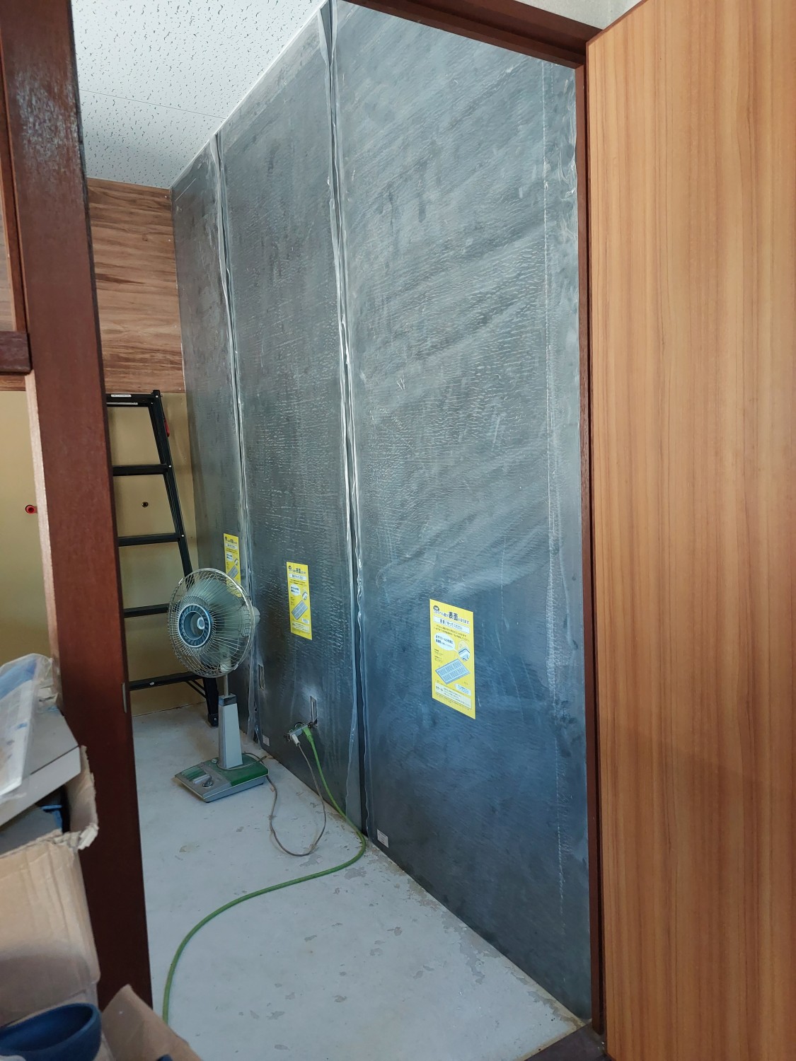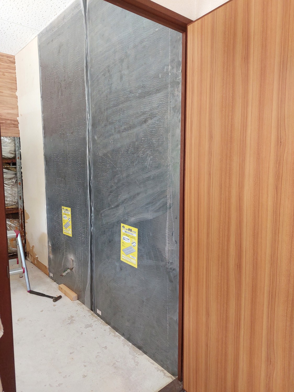 業務用キッチンのスペースの施工にて、壁のクロスをめくりキッチンパネルを全面に張りました。