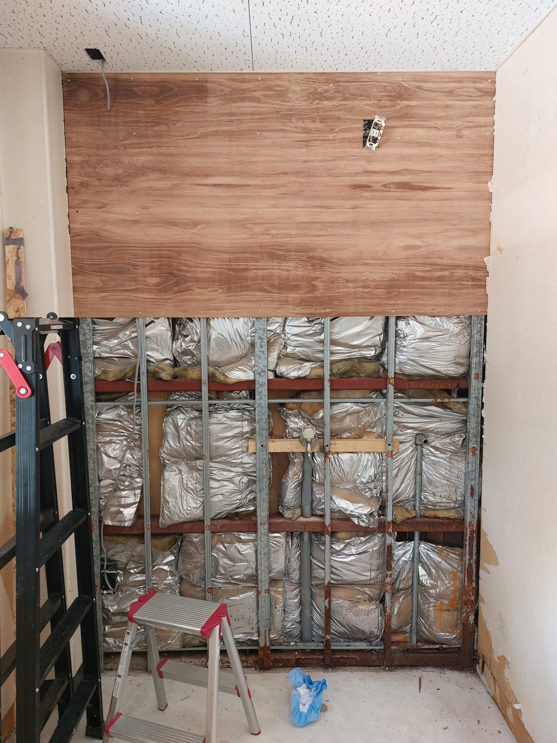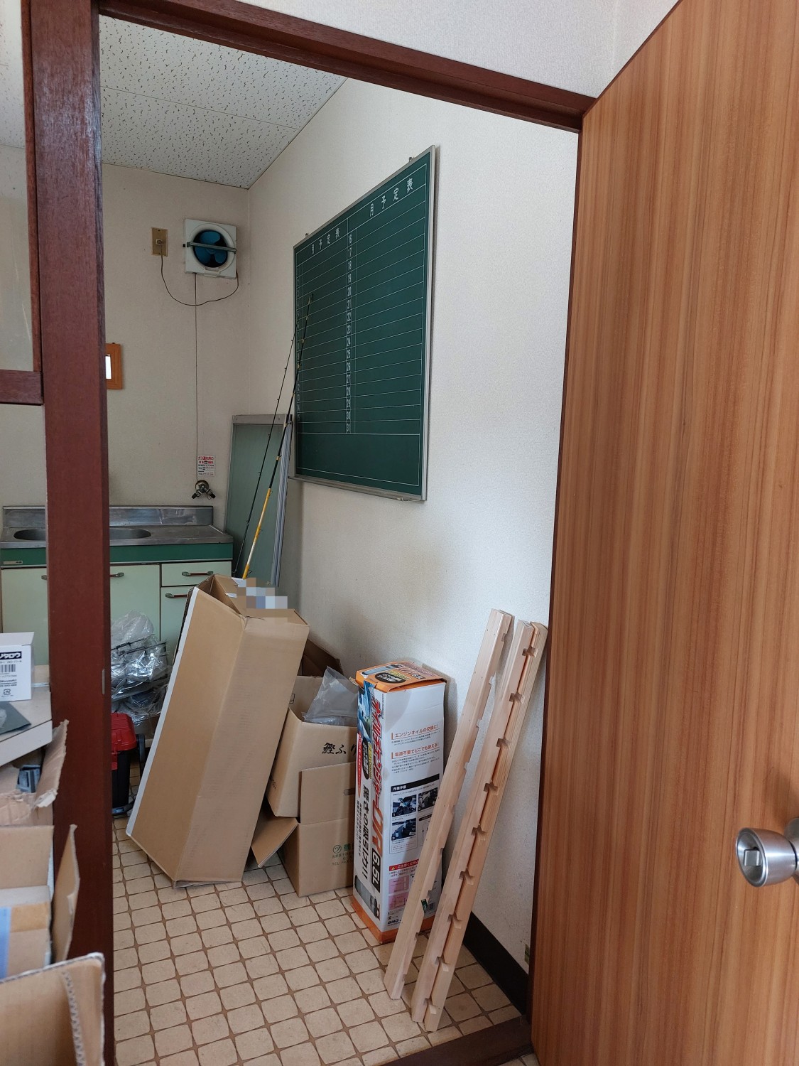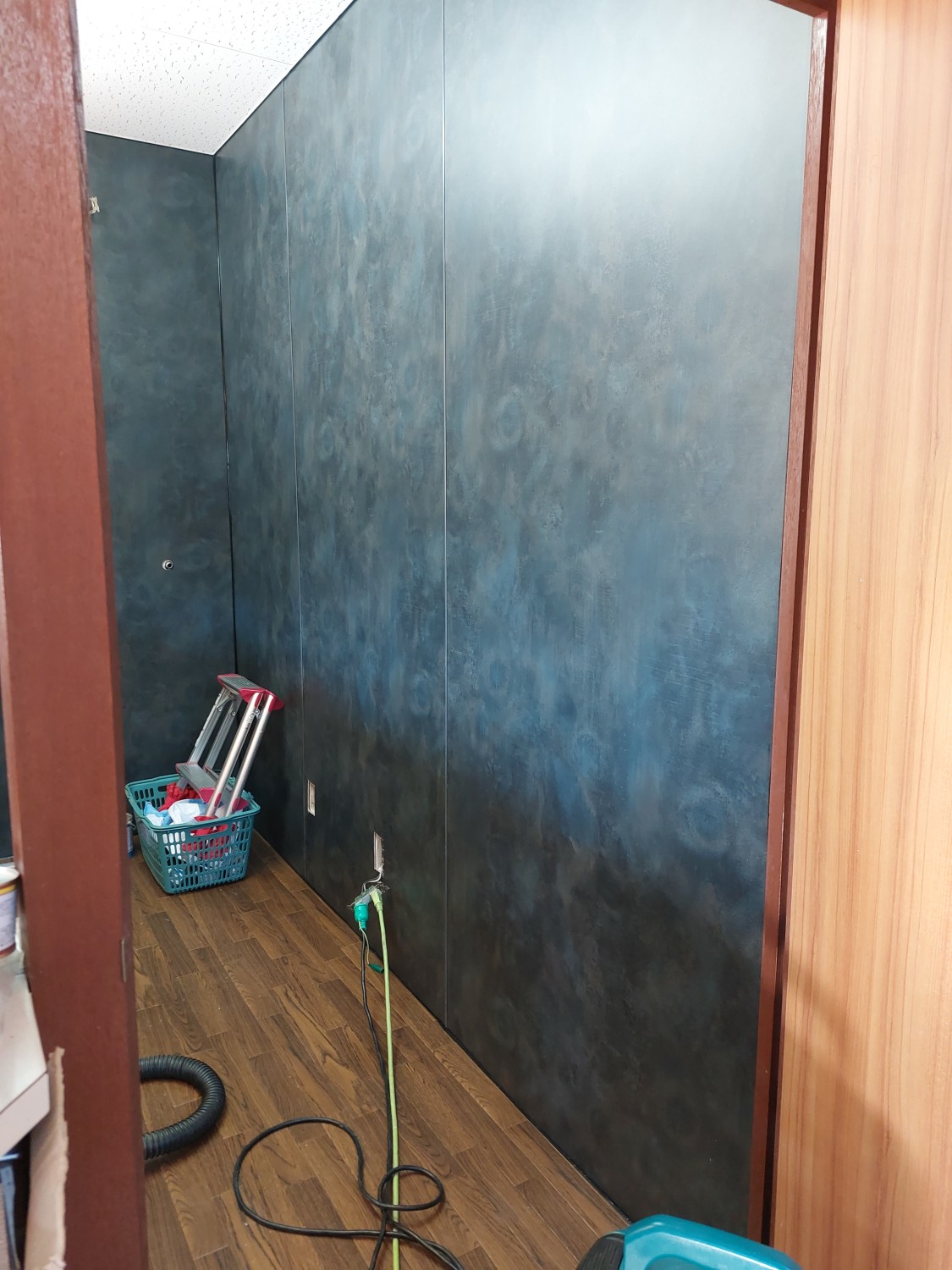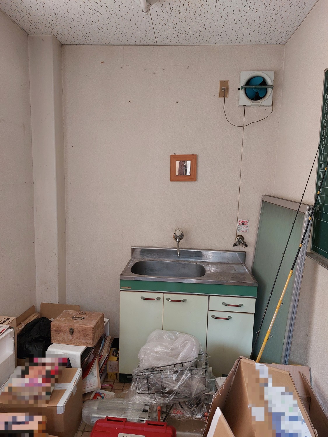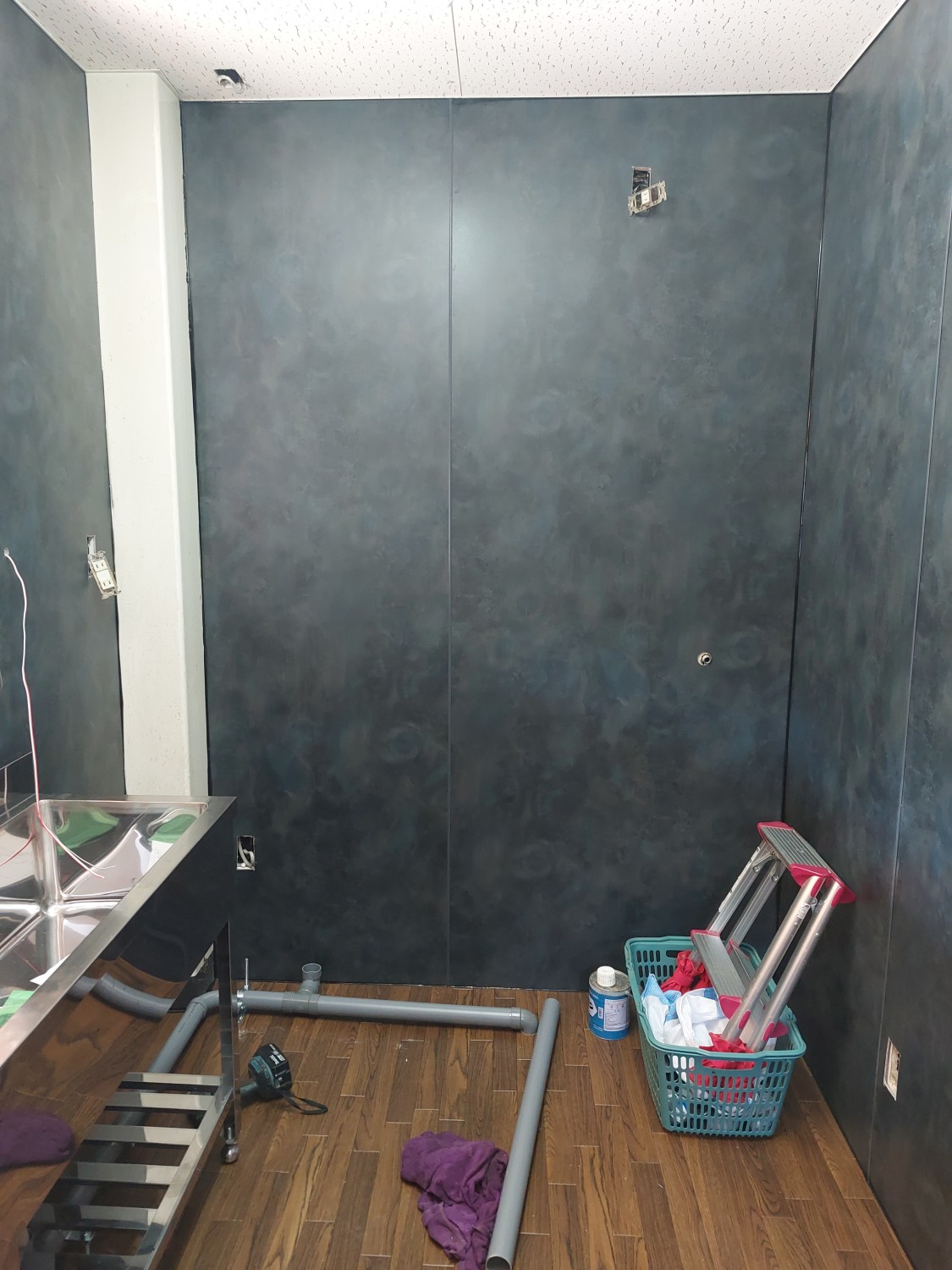 業務用キッチンのスペースの施工にて、壁のクロスをめくりキッチンパネルを全面に張りました。