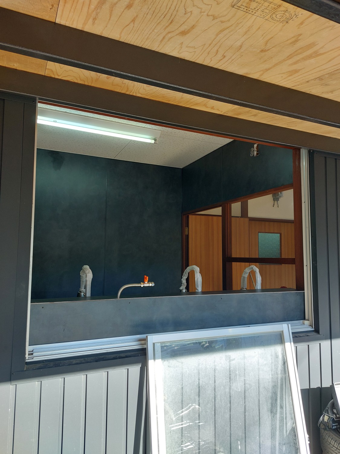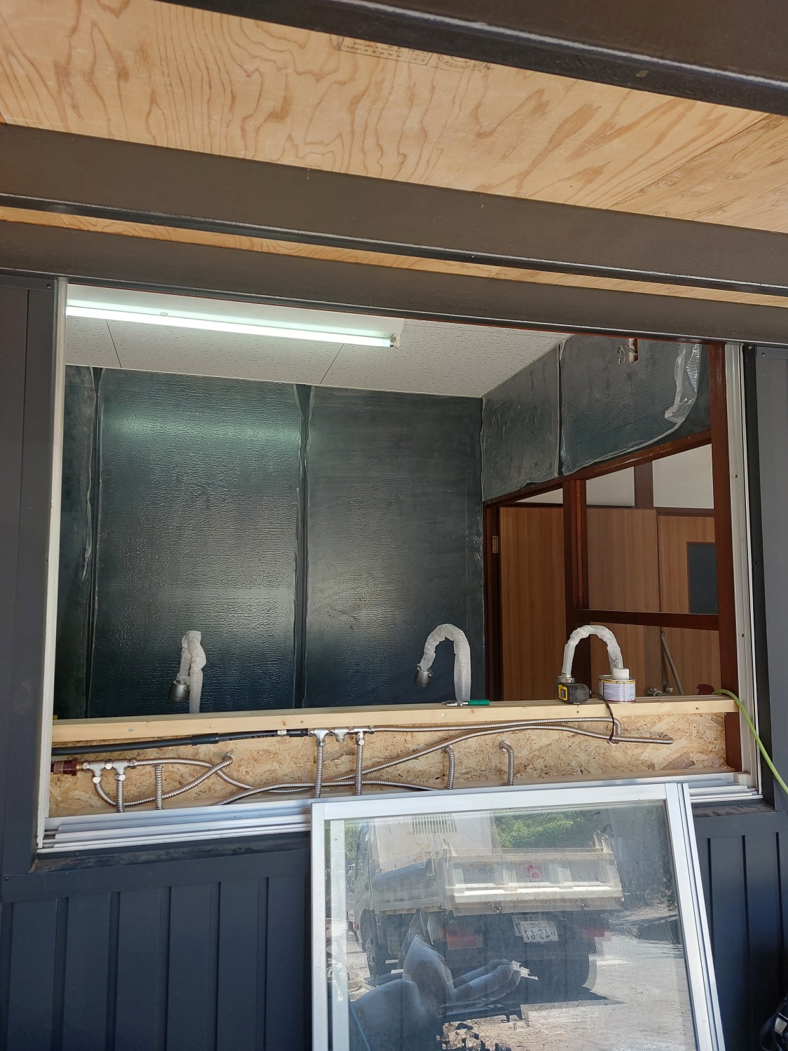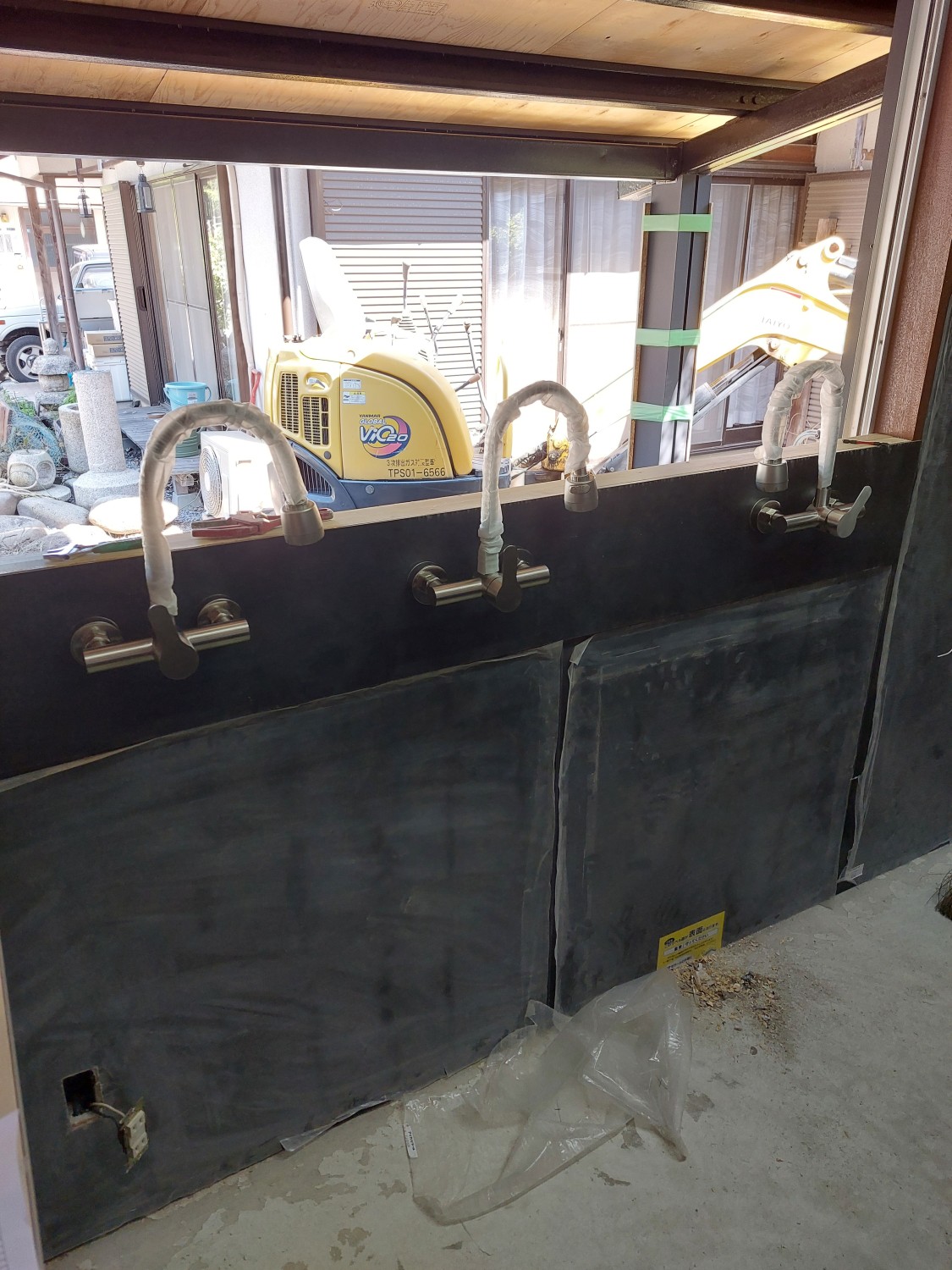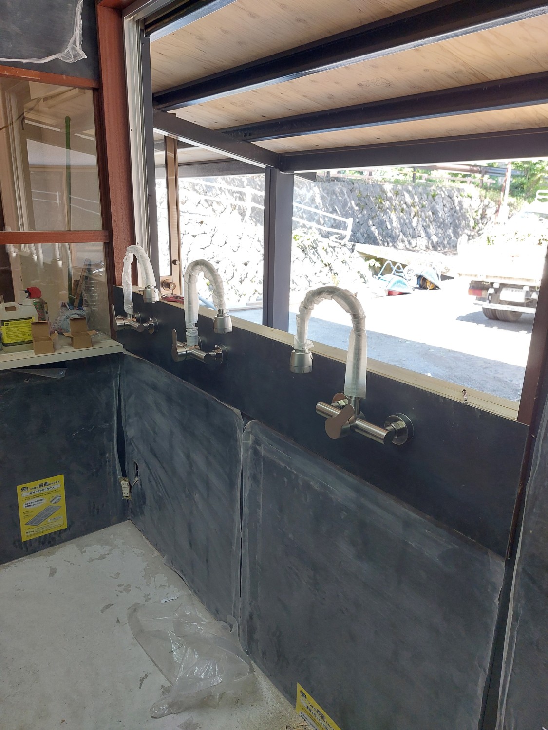 取り付けるにあたり設置場所が窓部分になるために、木板と垂木を用いて蛇口の取り付け部分を作りました。