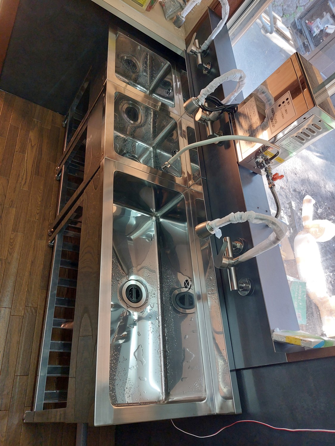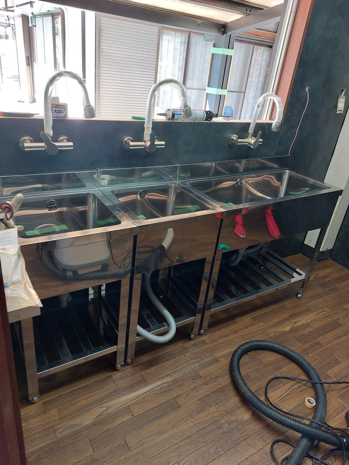 業務用キッチンの蛇口(混合栓・フレキシブルチューブ・シャワー切り替え付き)を3つ取り付けました。