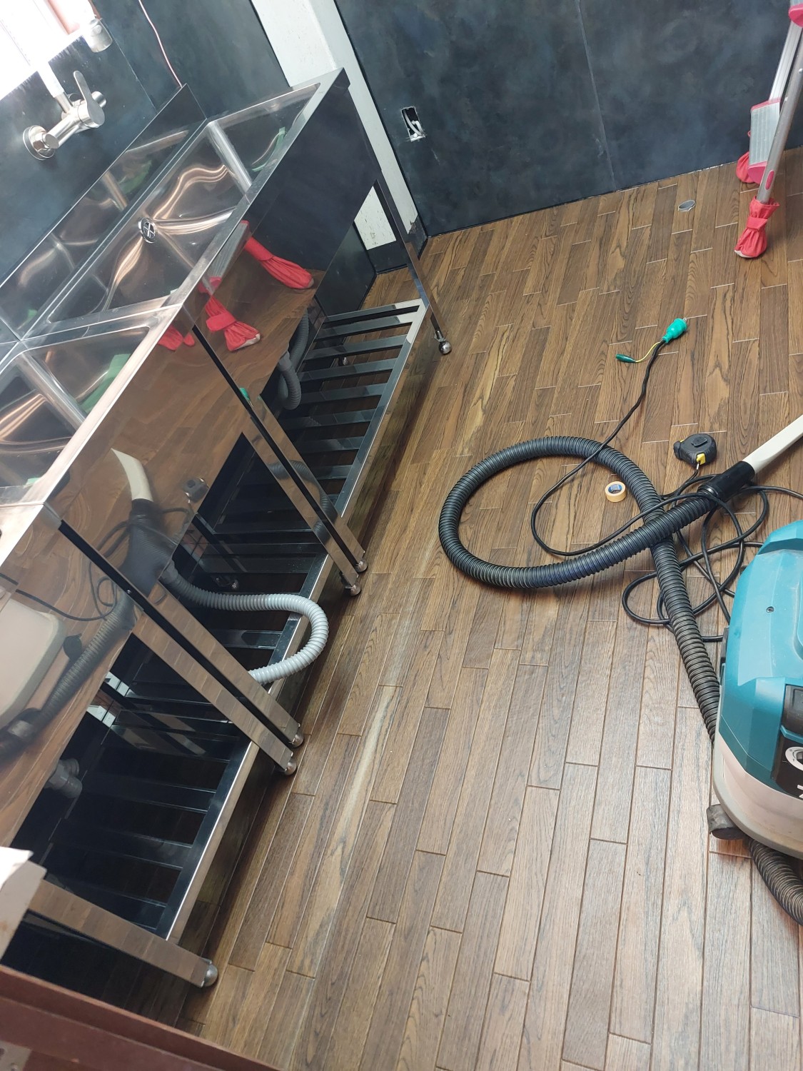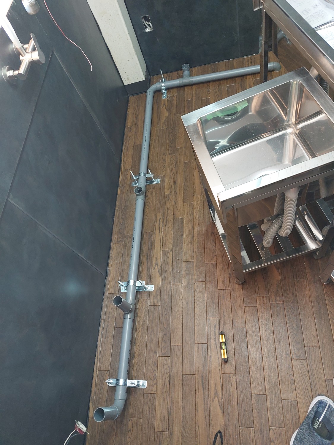 奥の排水部には、お客様自ら後日購入の業務用冷蔵庫を置かれますので、排水配管も見えないようになりまして、業務用冷蔵庫の排水も差すだけで排水できるように、配管を分岐して差し込み口を用意しておきました。