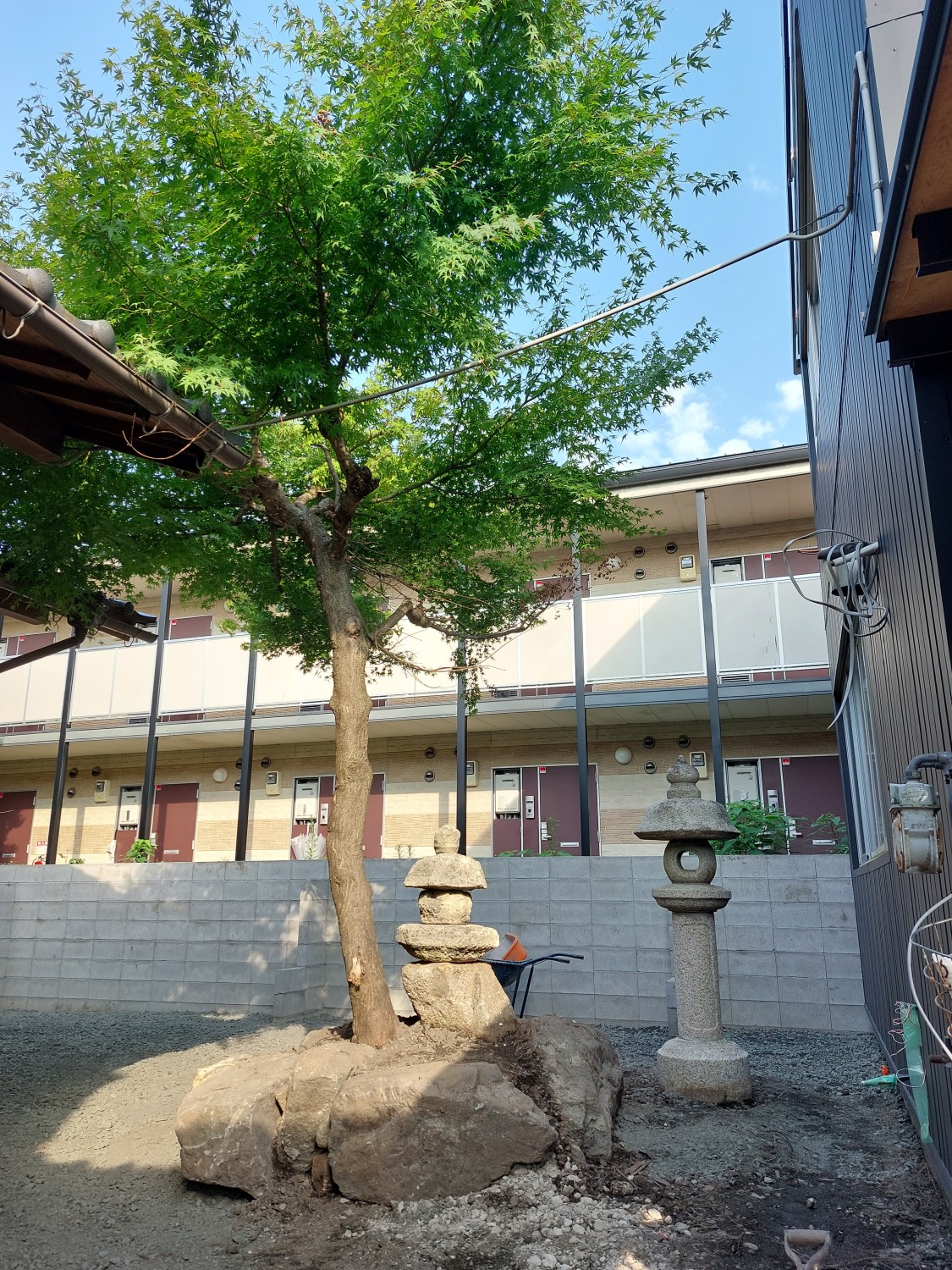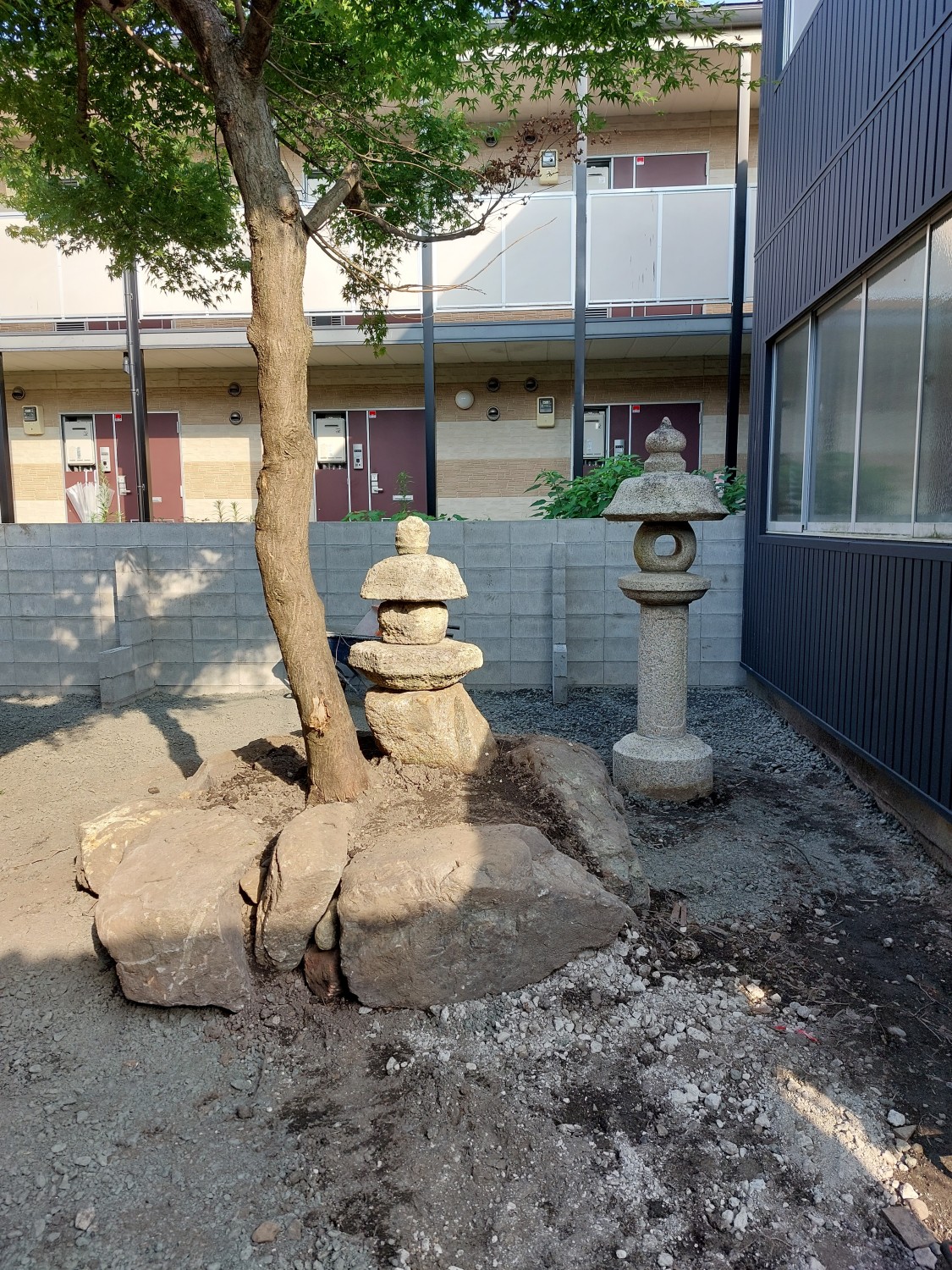 そして、表に据え付けてあった高めの灯籠を、その石の囲いの斜め後ろに据え付けました。