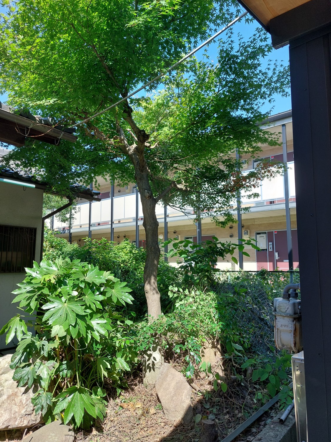 この配置で、表側から庭へ入った時や部屋の窓越しに眺めた時に、紅葉の木と灯籠2基が重なることなく眺めることができます。