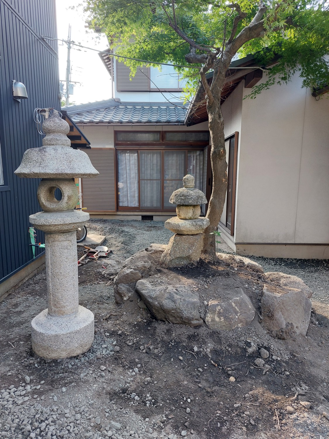 紅葉の木の下を、庭に散らばっていました大きな石で、木の根の周りを囲い土を盛って、そこに玄関先に据え付けてあった低めの灯籠を、同じ石の囲いの中に据え付けました。