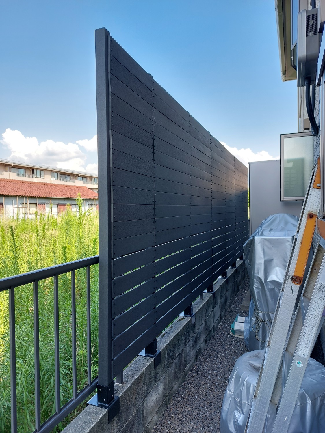 前回の人工木のウッドフェンス(高さ 2m)に、追加で延長の施工をおこないました。