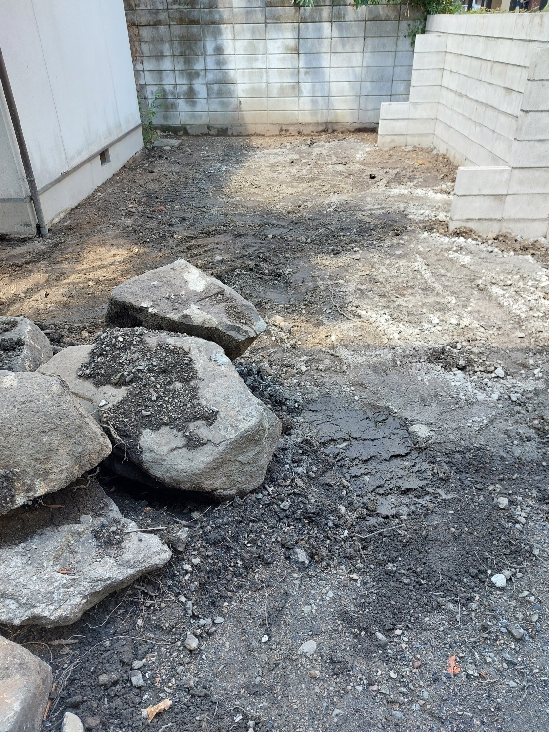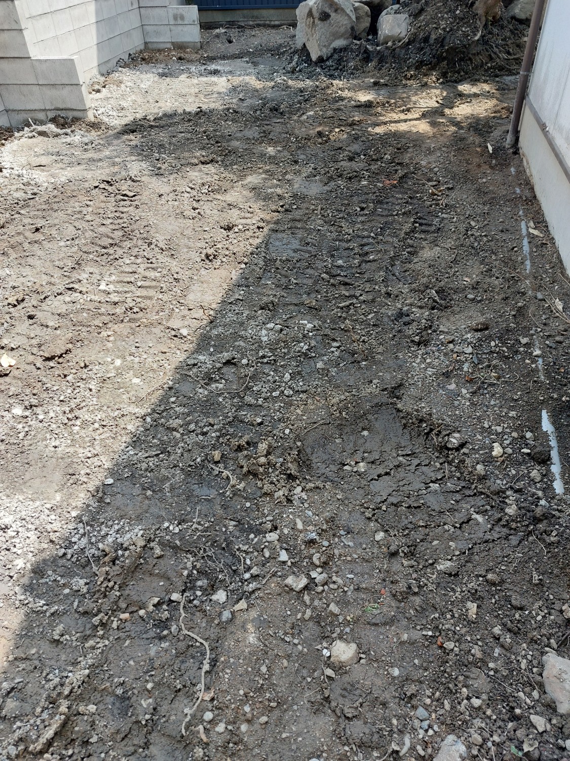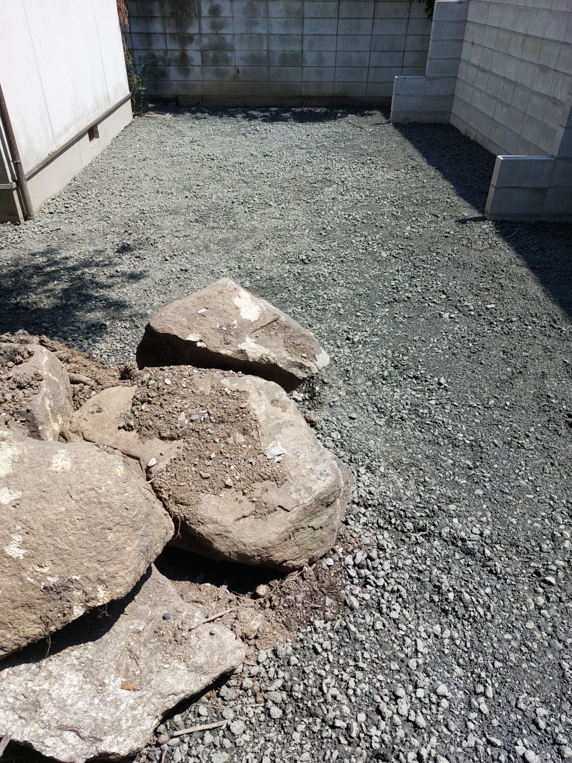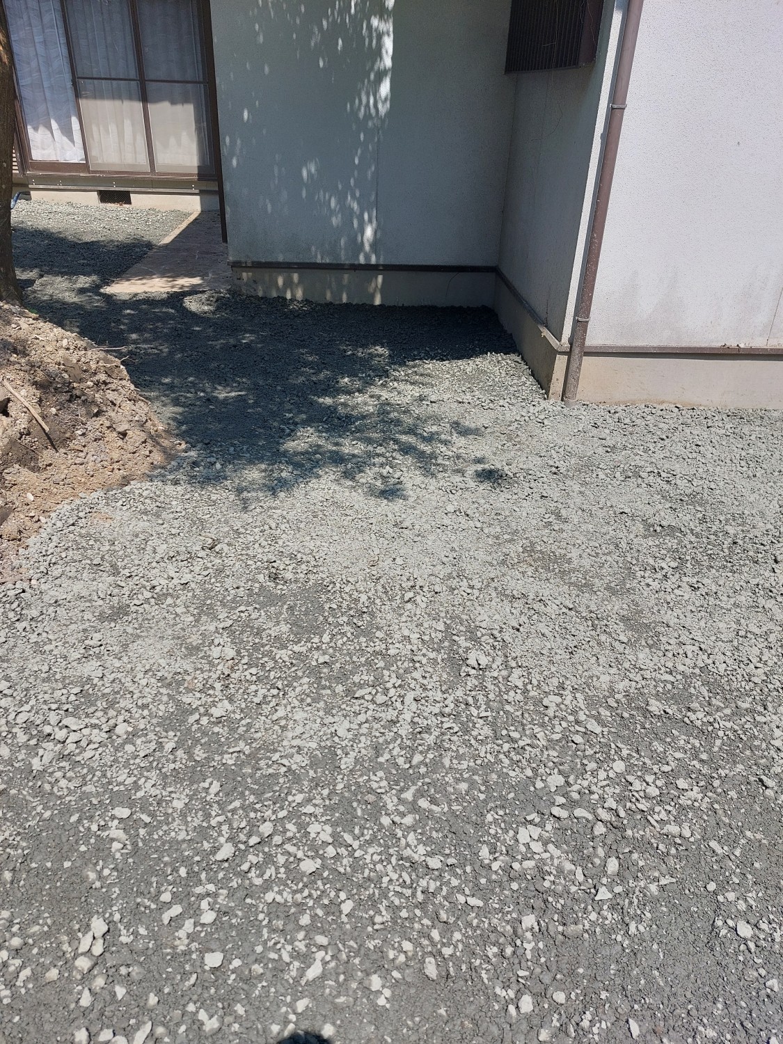 大きな岩や大木の根などを取り除き、雑草や土を鋤取り整地してから、砕石(C-30)を敷いてならしました。