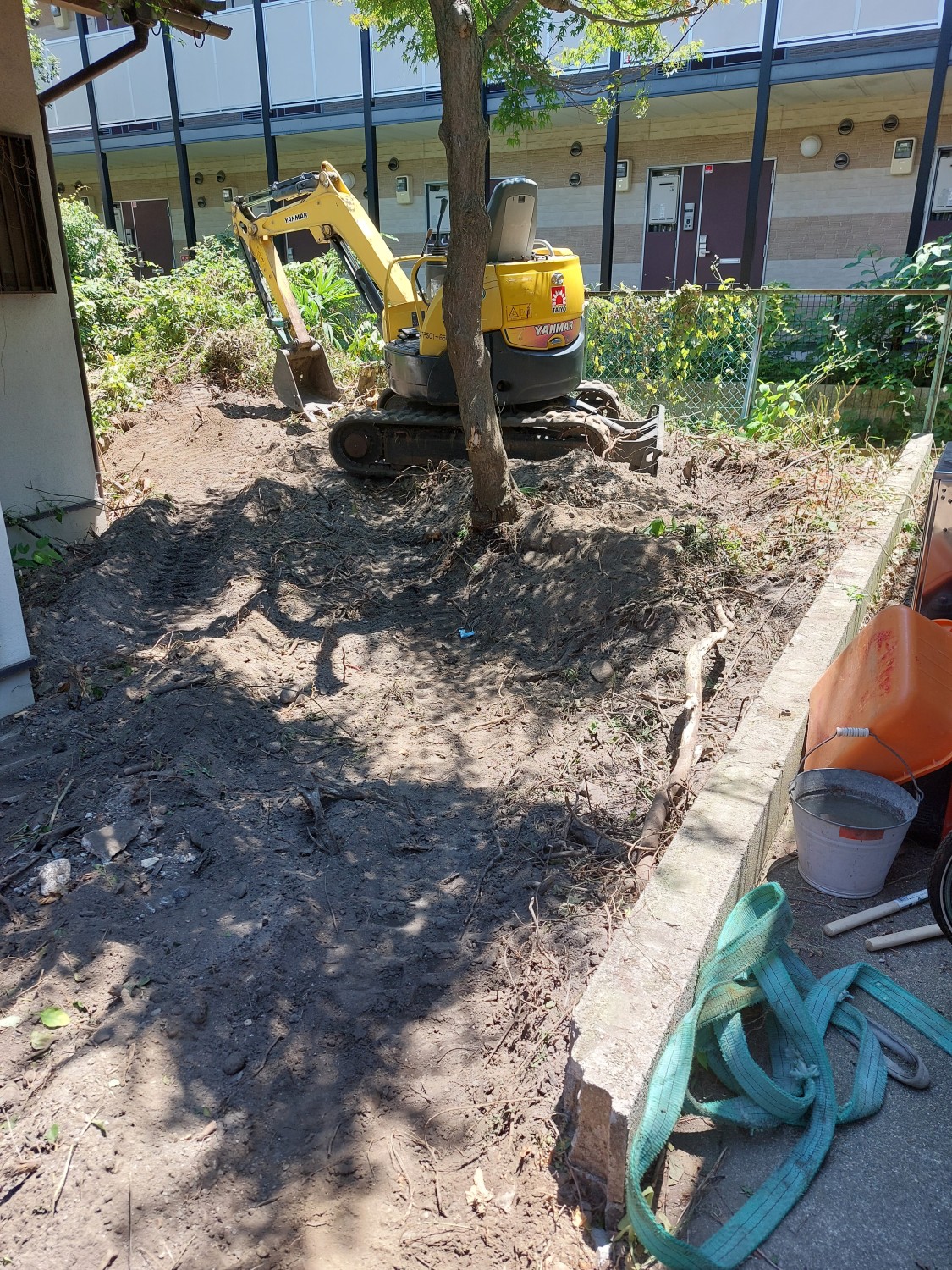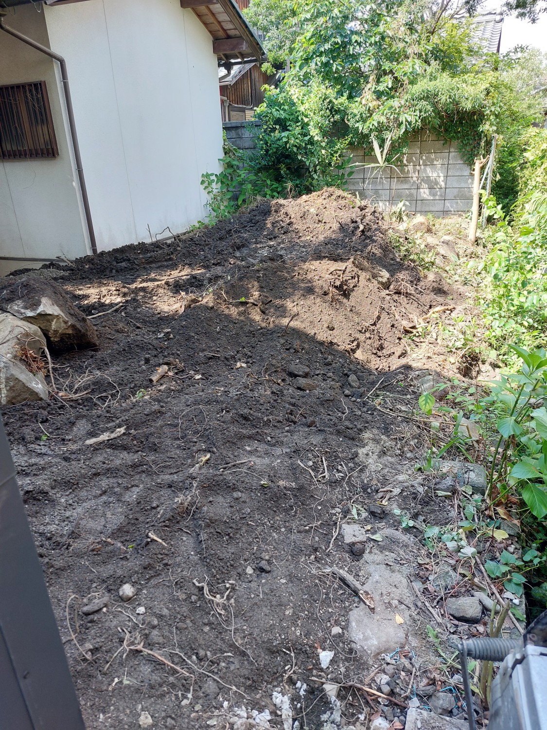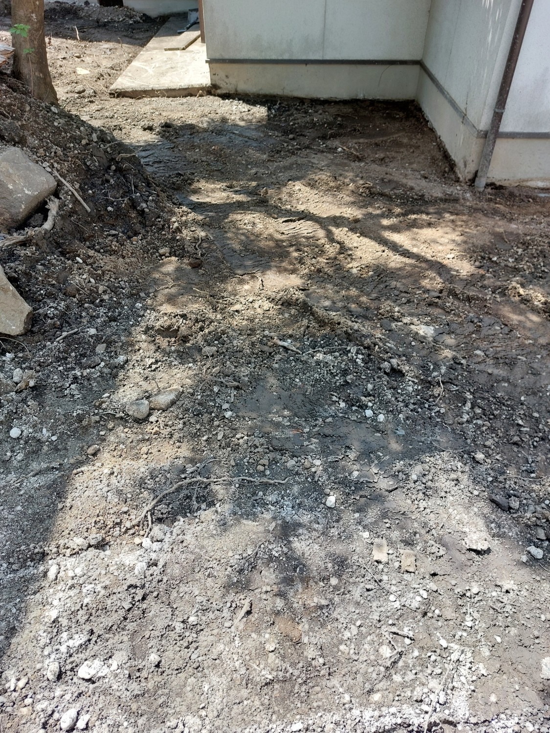 大きな岩や大木の根などを取り除き、雑草や土を鋤取り整地してから、砕石(C-30)を敷いてならしました。