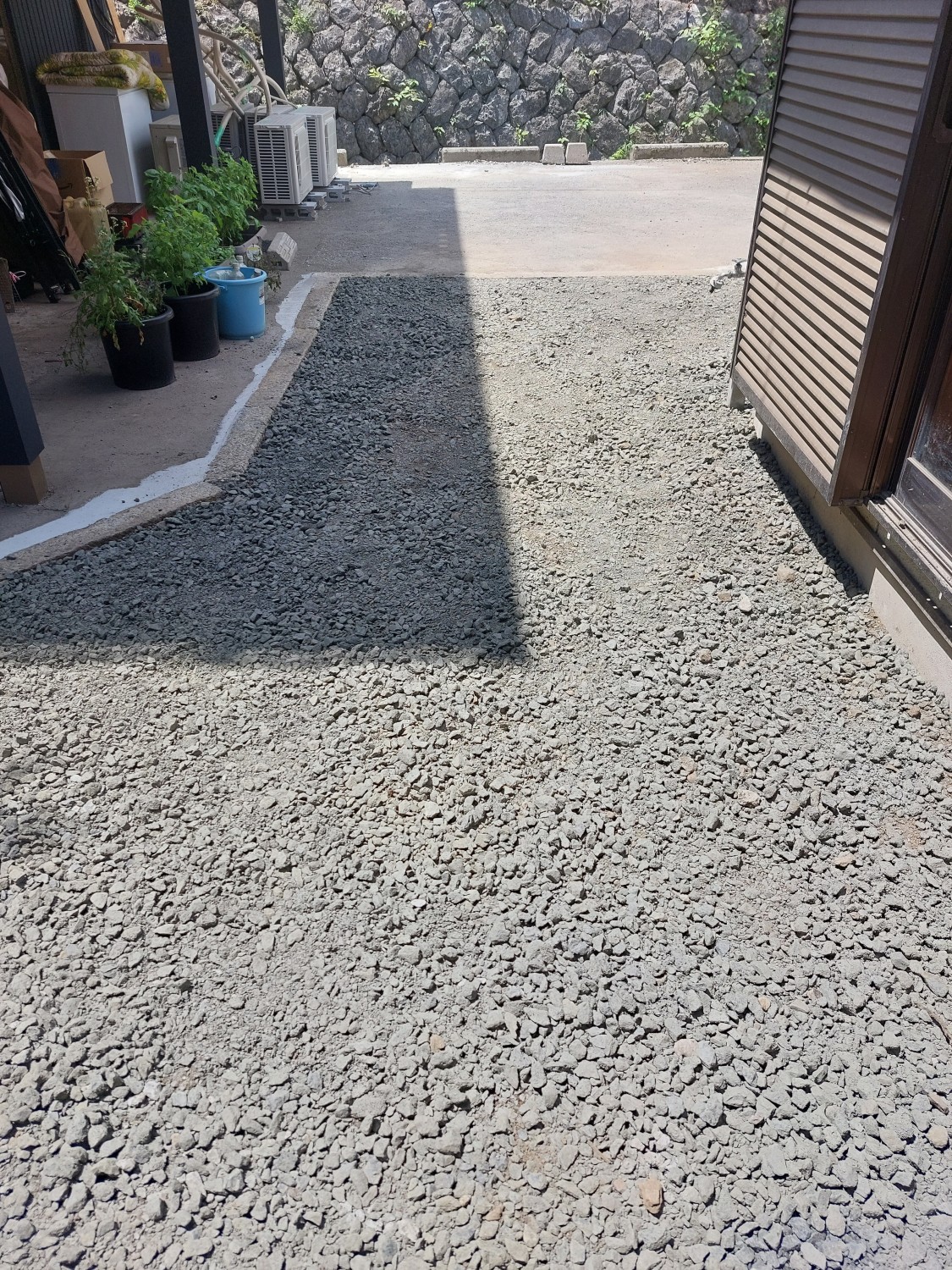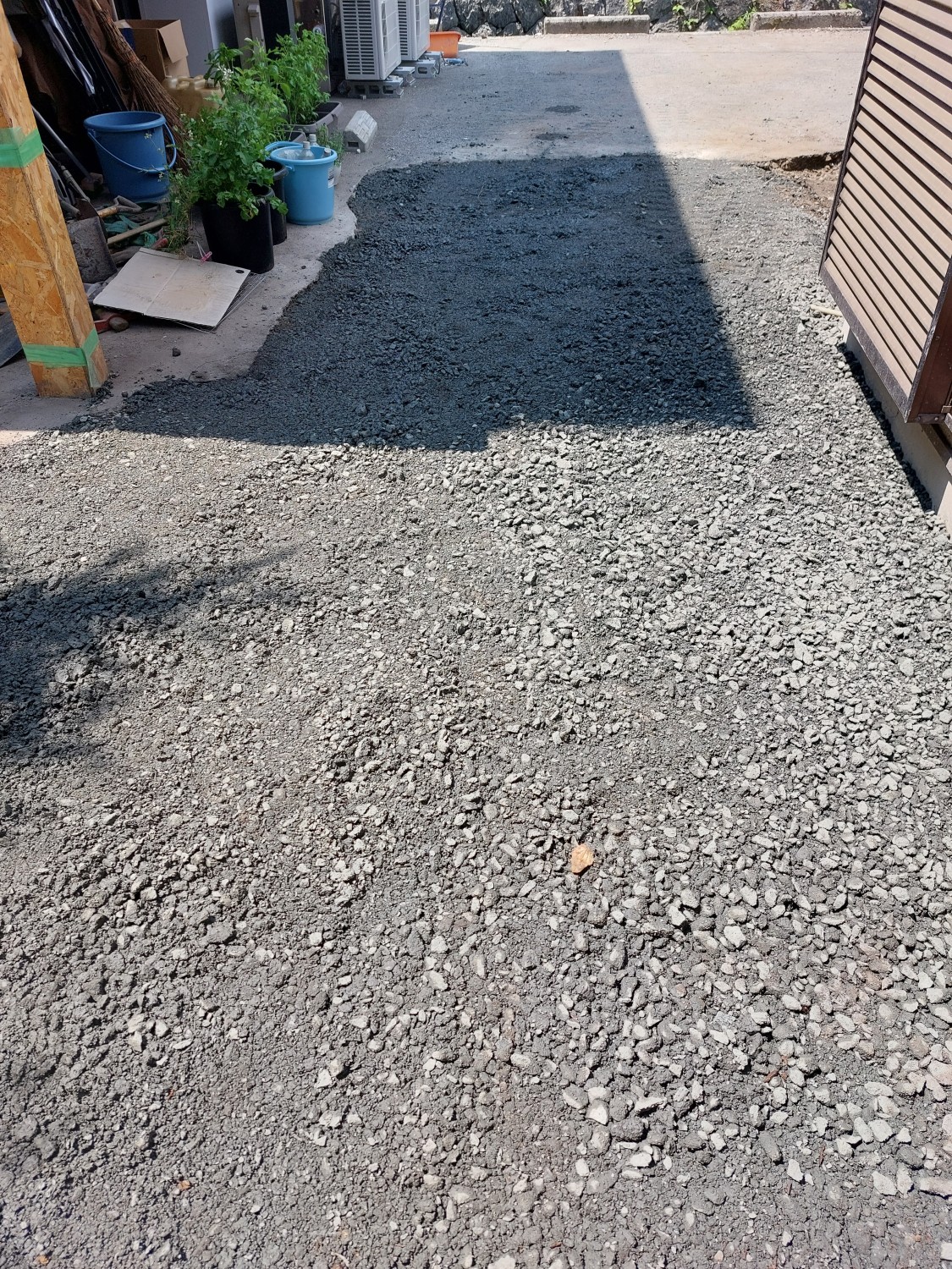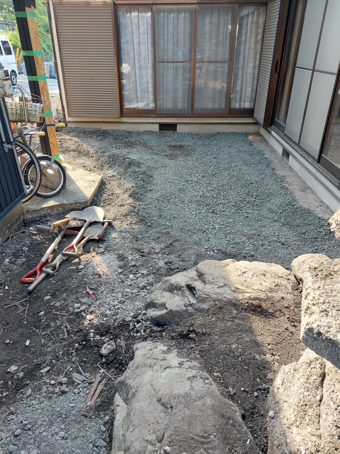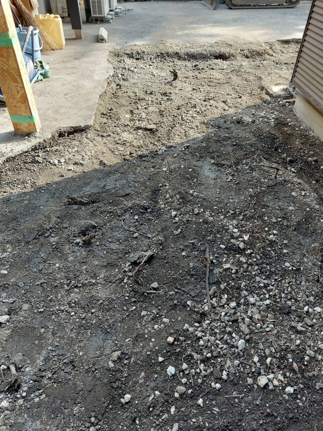 アスファルト下の陥没(地盤沈下)の修復及び埋設のブロック・飛び石・ラティス・アスファルト・垣根の撤去をおこない、土を鋤取り整地してから、砕石(C-30)を敷いてならしました。