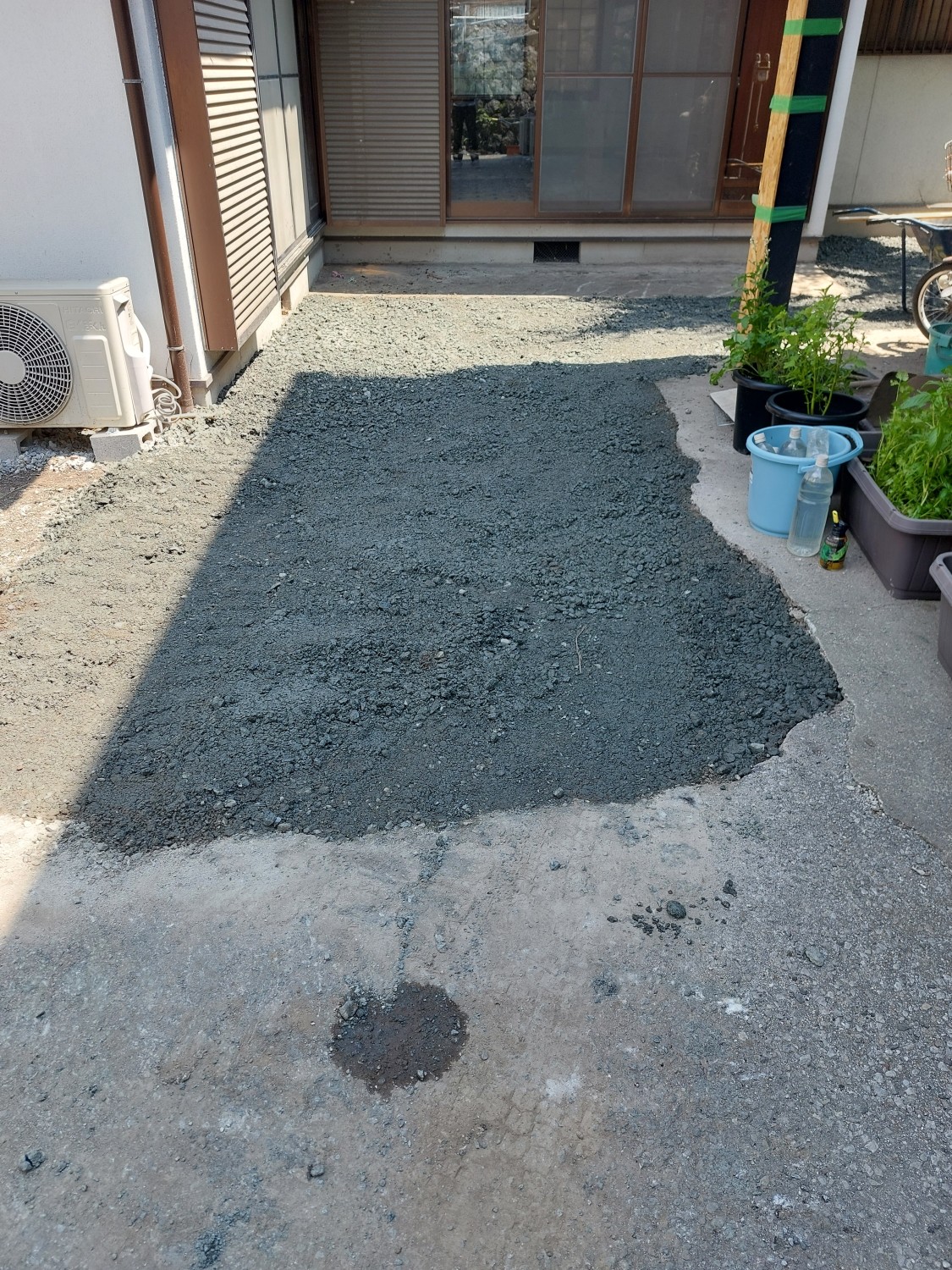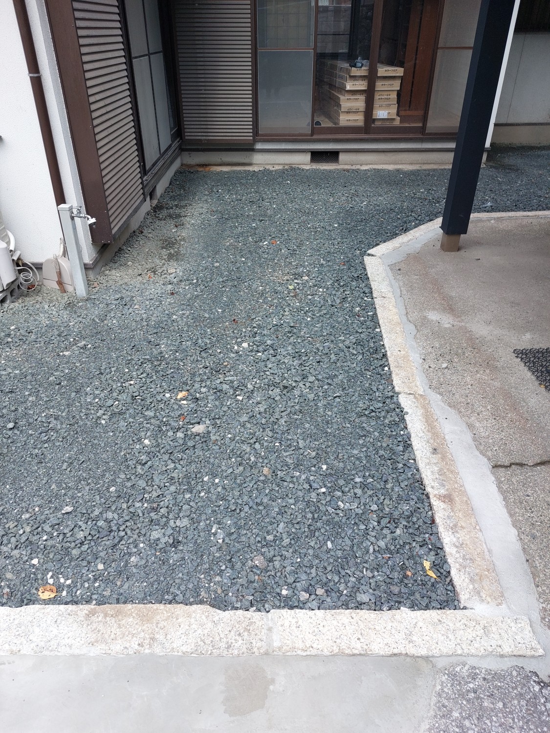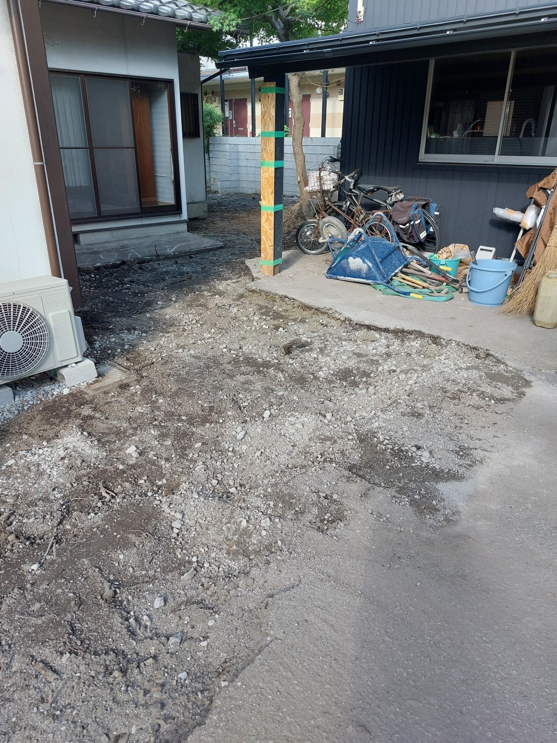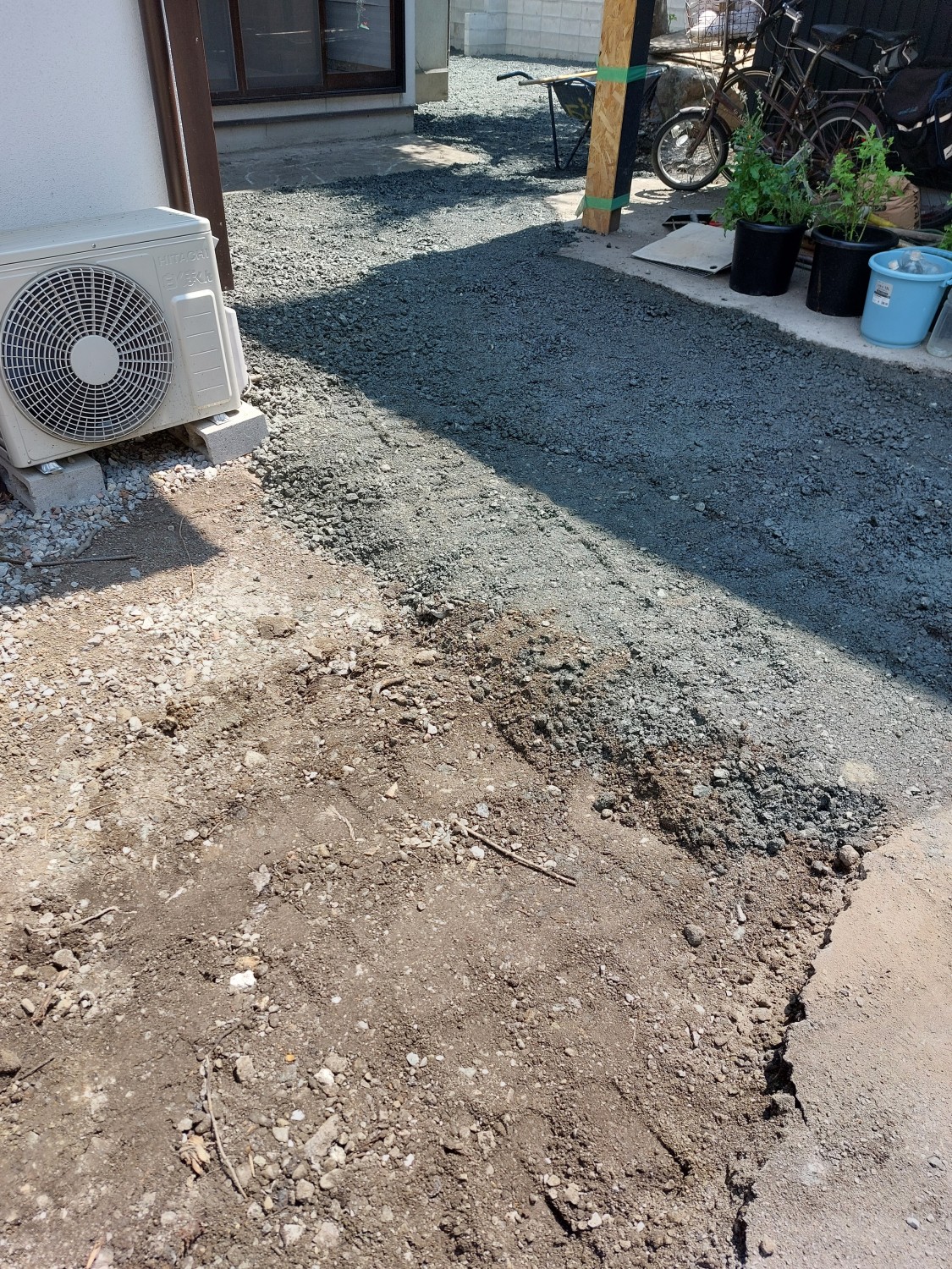アスファルト下の陥没(地盤沈下)の修復及び埋設のブロック・飛び石・ラティス・アスファルト・垣根の撤去をおこない、土を鋤取り整地してから、砕石(C-30)を敷いてならしました。