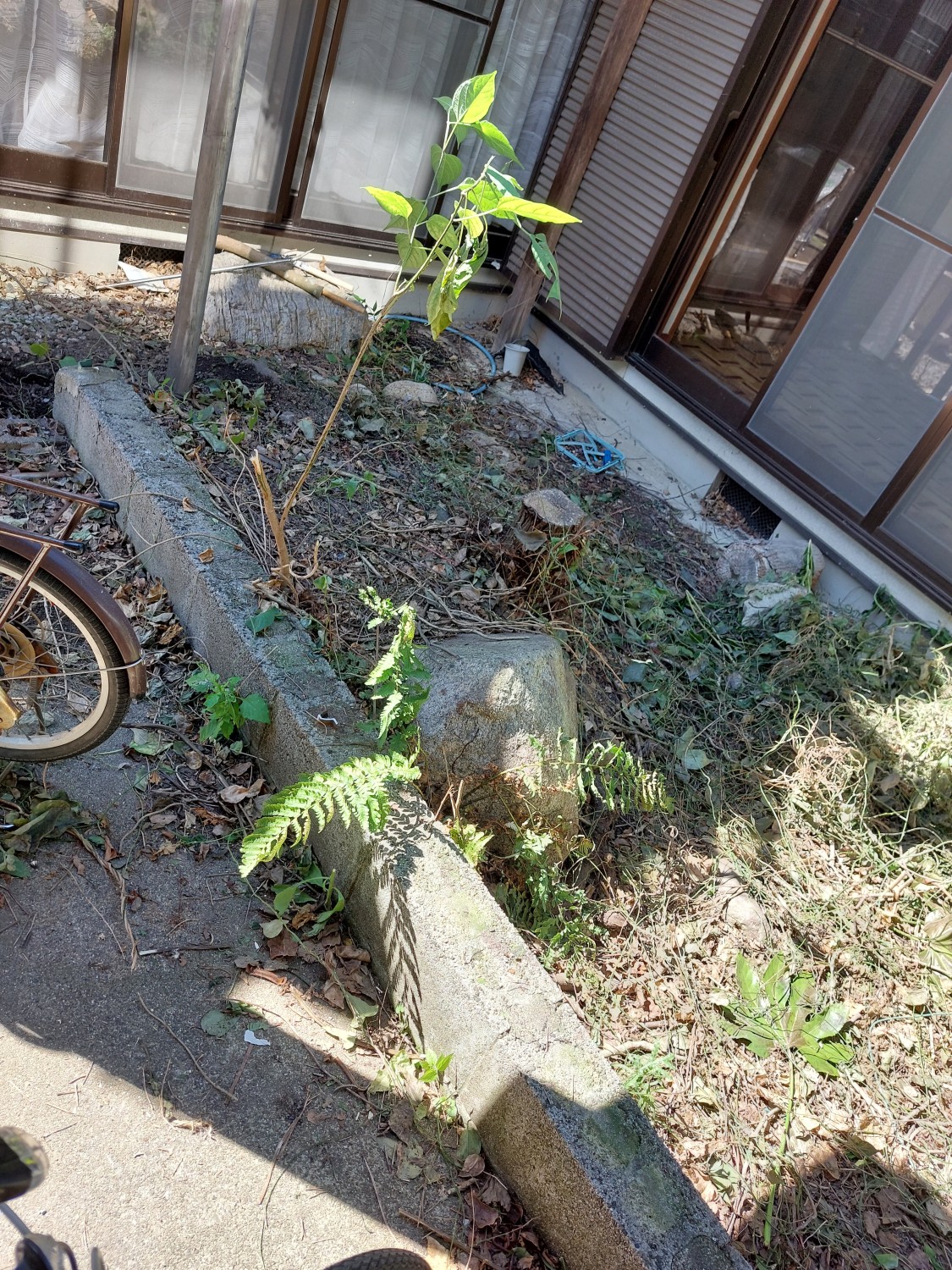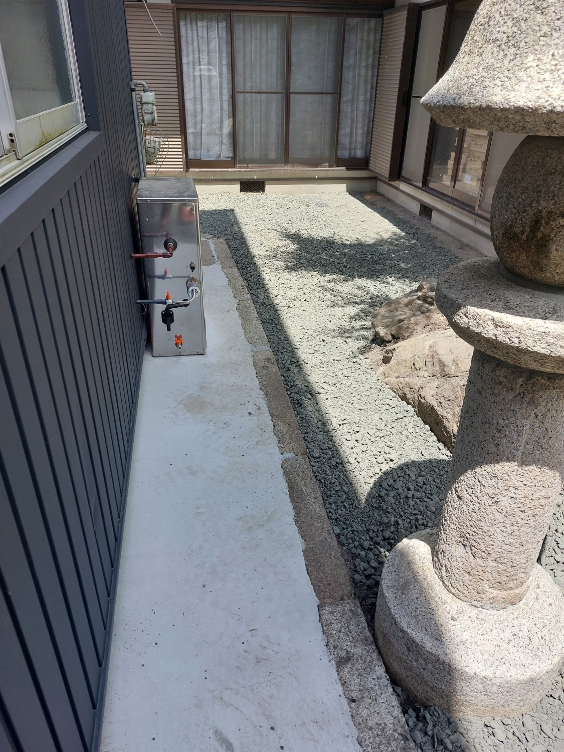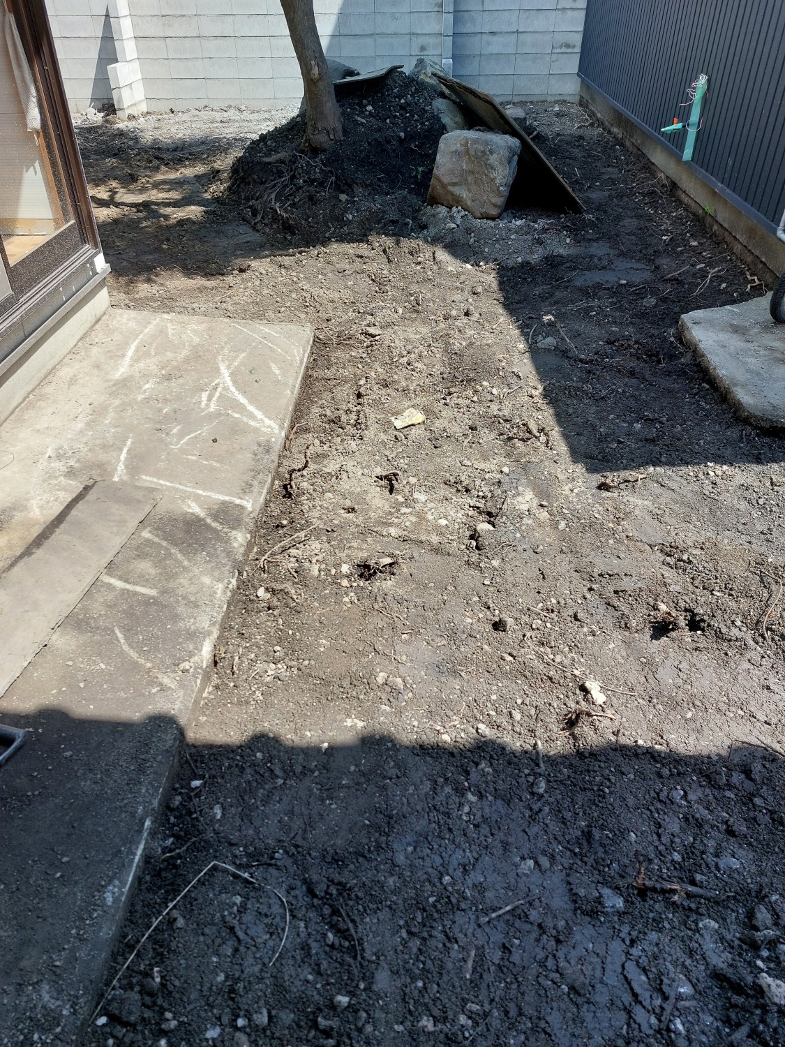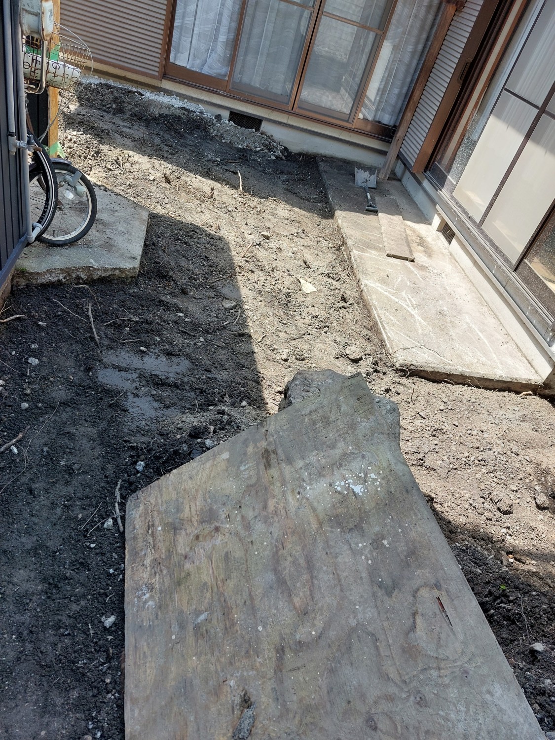 アスファルト下の陥没(地盤沈下)の修復及び埋設のブロック・飛び石・ラティス・アスファルト・垣根の撤去をおこない、土を鋤取り整地してから、砕石(C-30)を敷いてならしました。