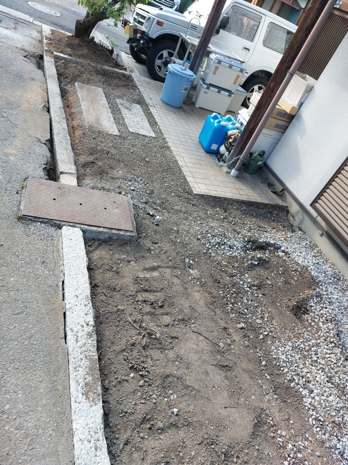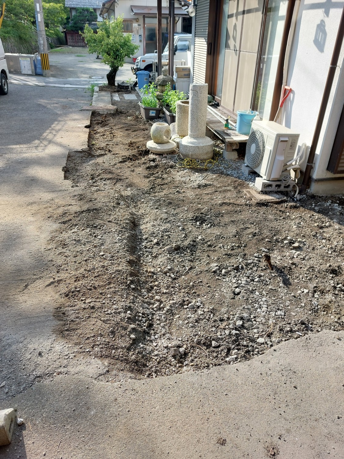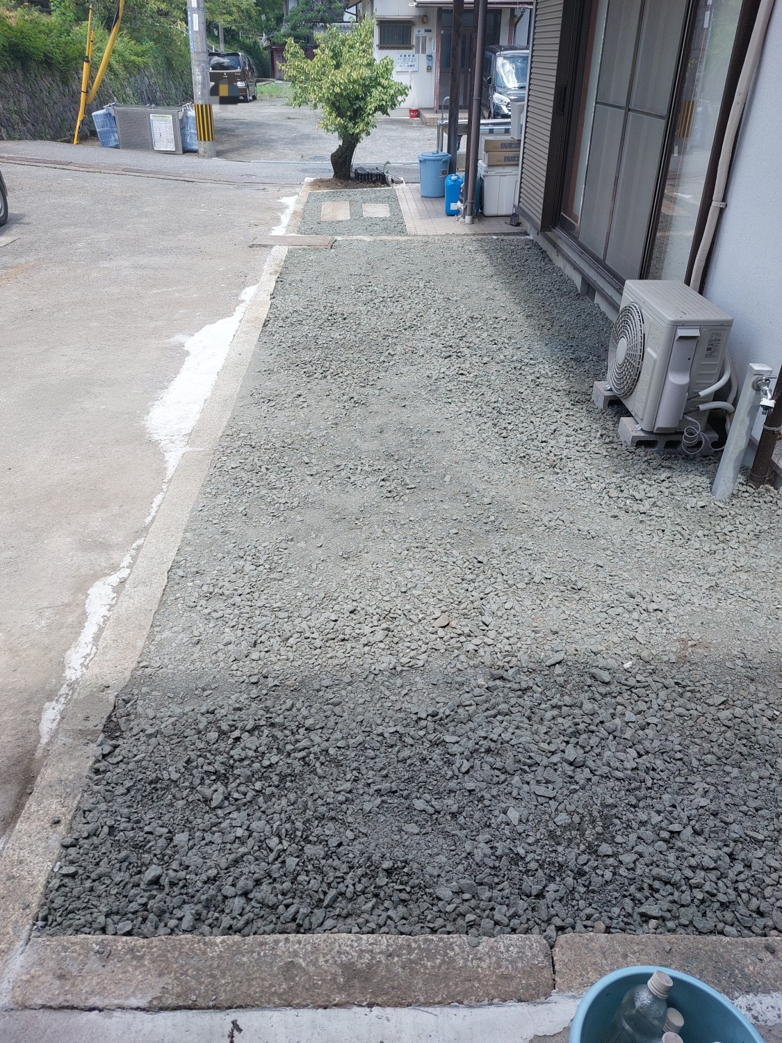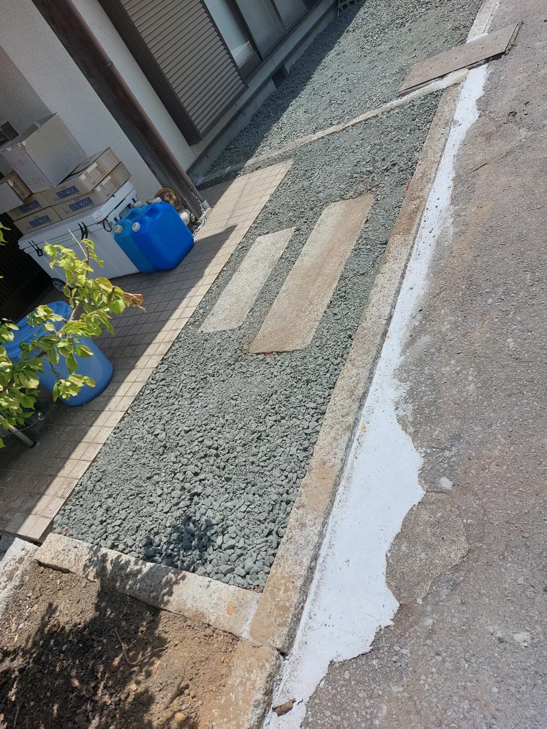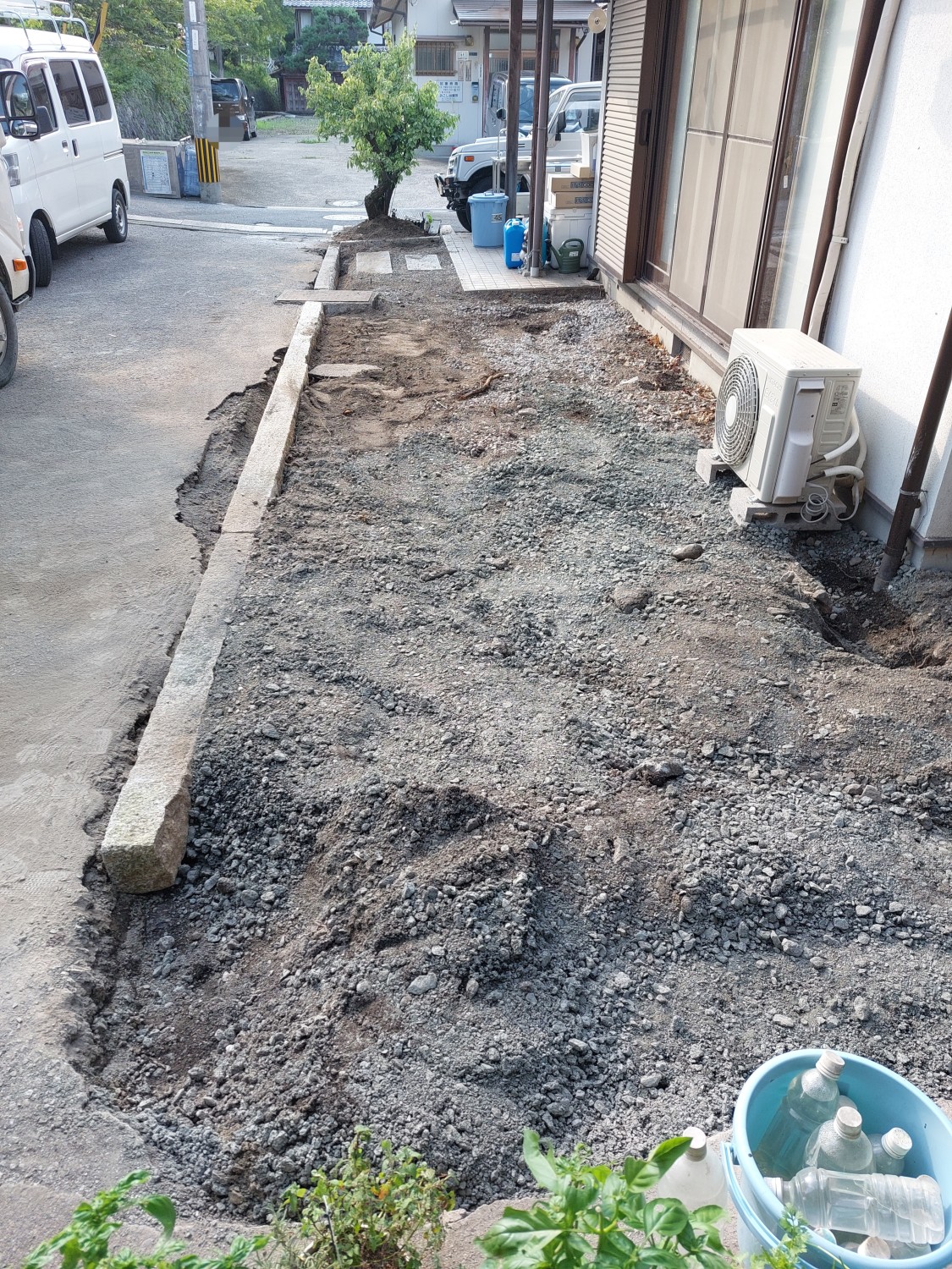 表の埋設のブロック・大きな岩・垣根・縁台・コンクリート面・木(松・南天)の撤去をおこない、土を鋤取り整地してから、砕石(C-30)を敷いてならしました。