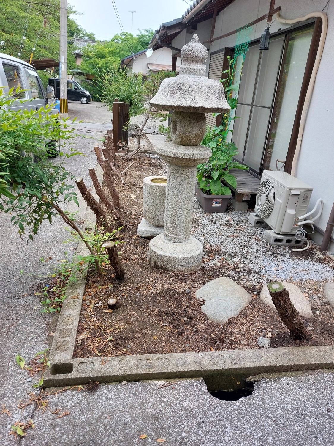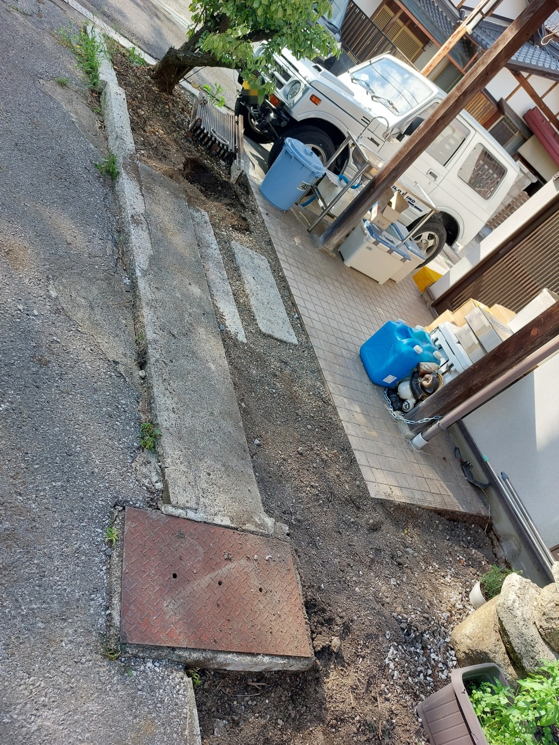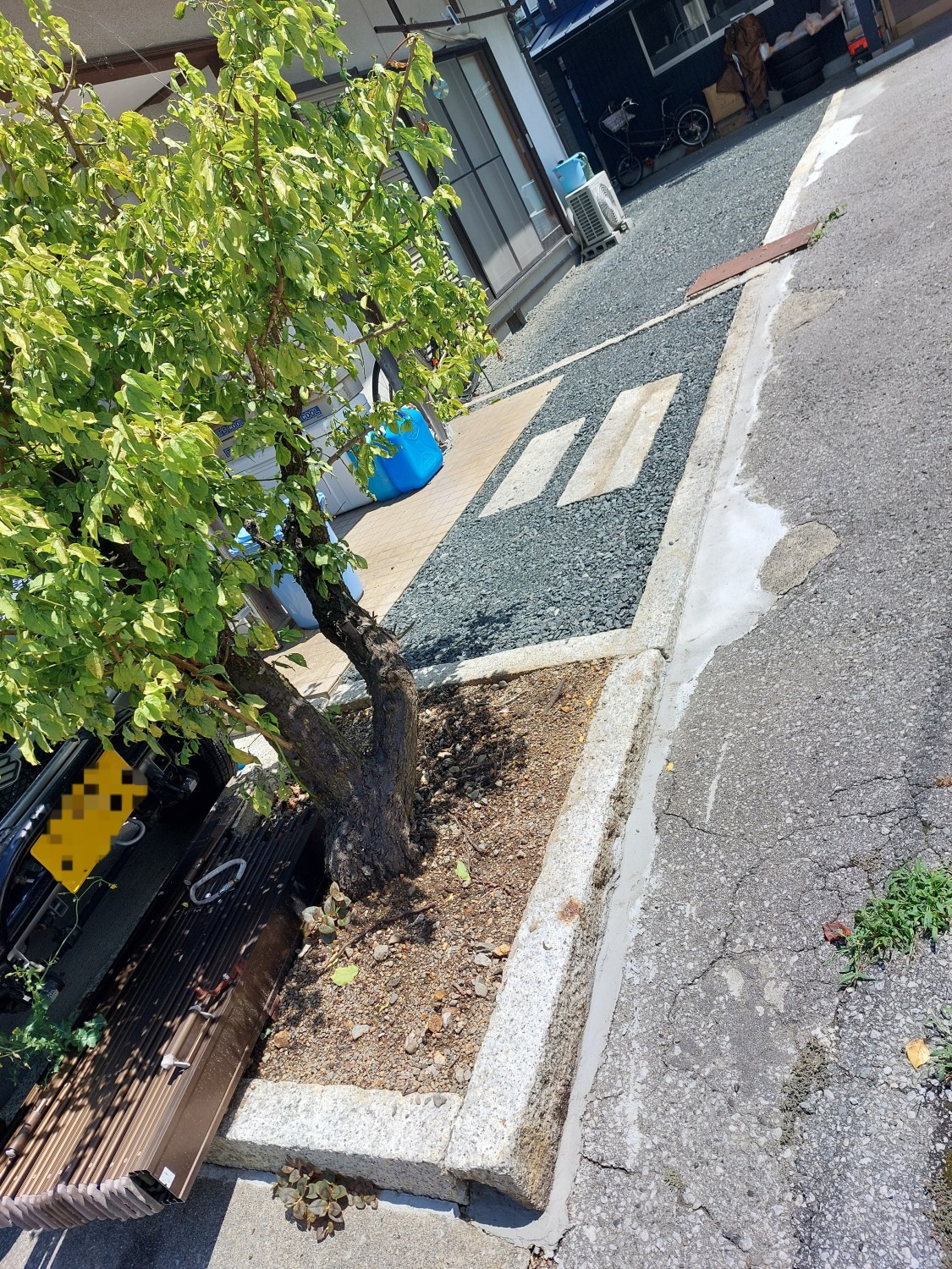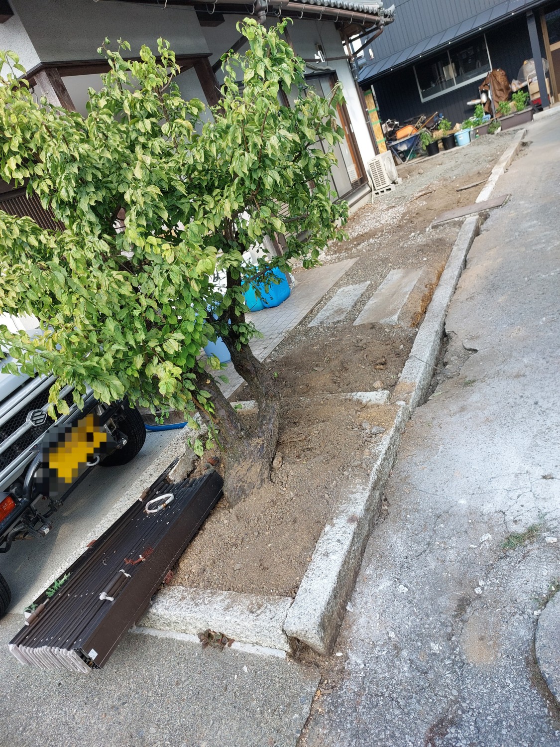 表の埋設のブロック・大きな岩・垣根・縁台・コンクリート面・木(松・南天)の撤去をおこない、土を鋤取り整地してから、砕石(C-30)を敷いてならしました。