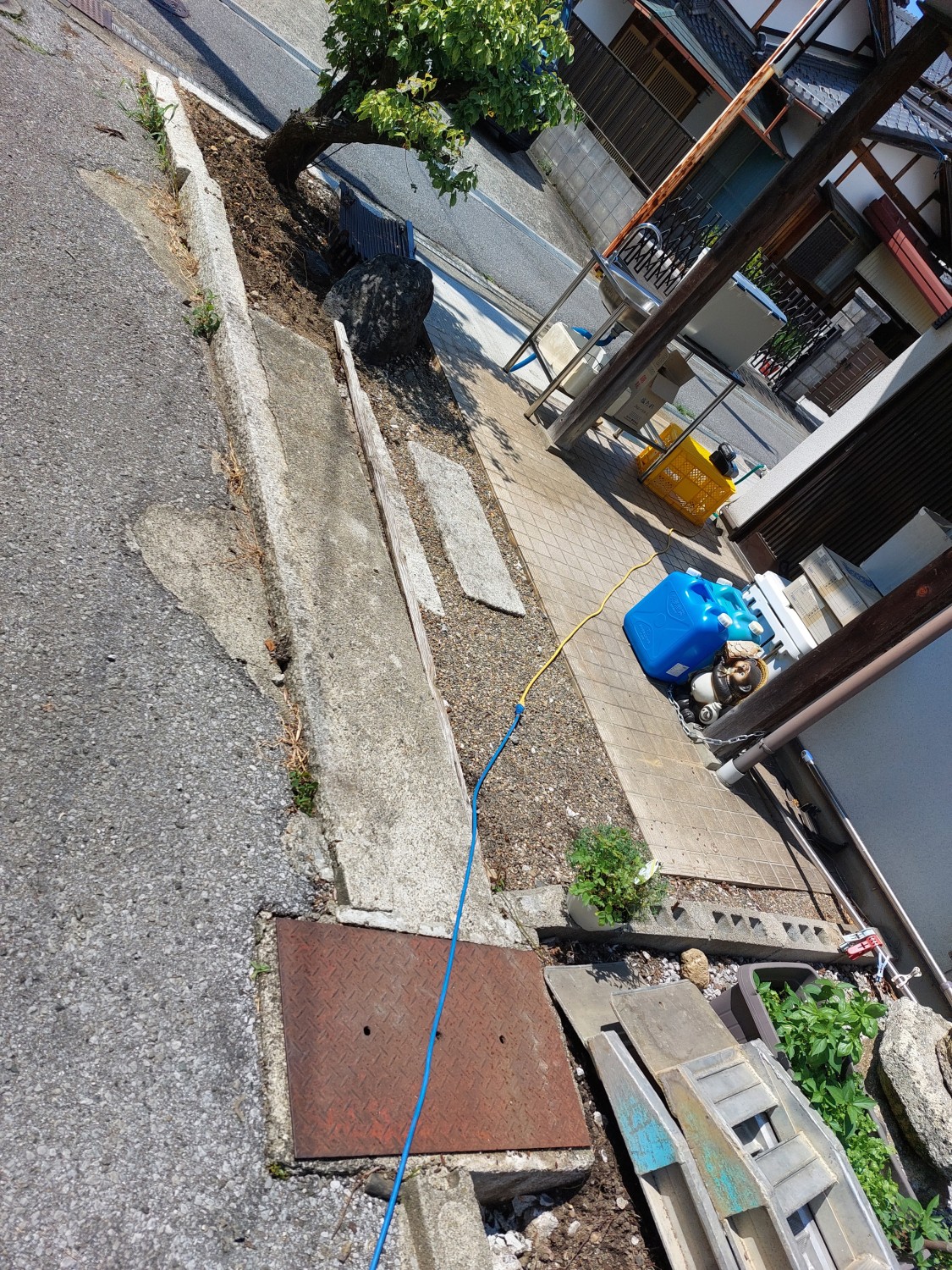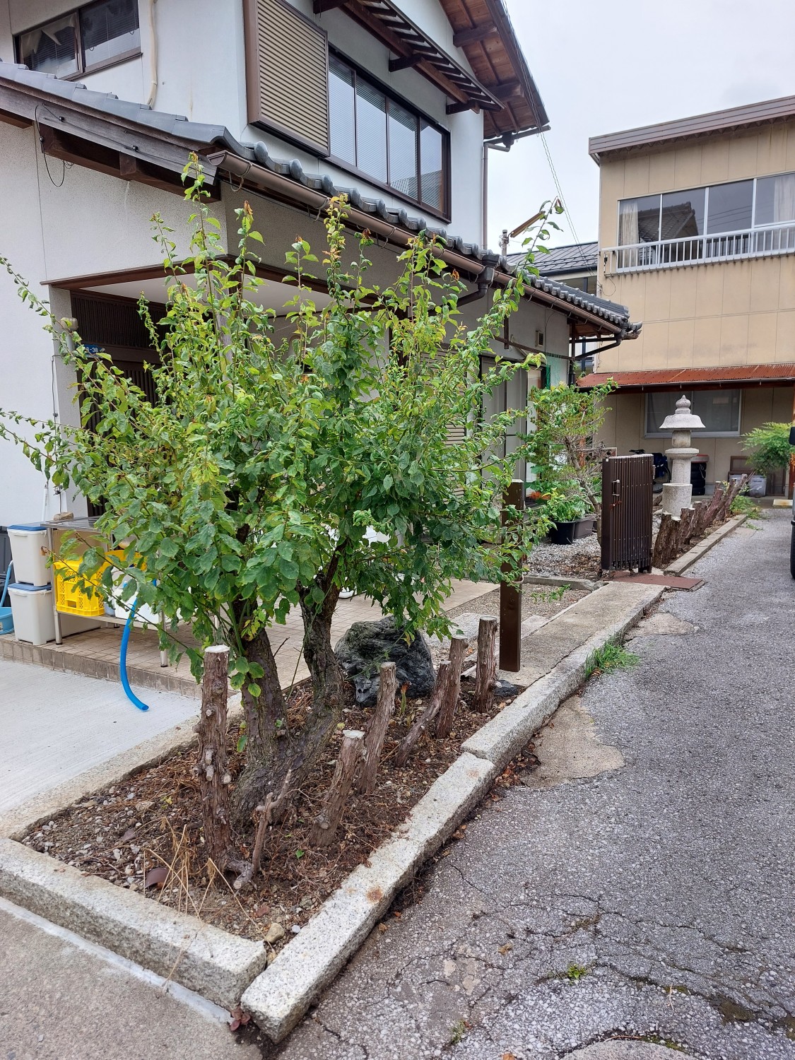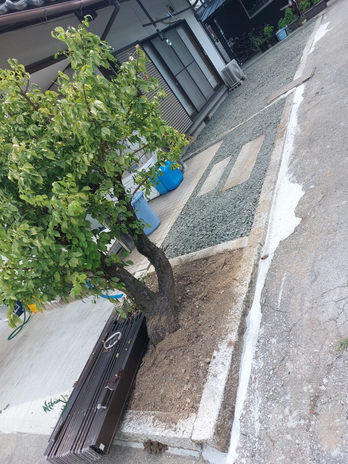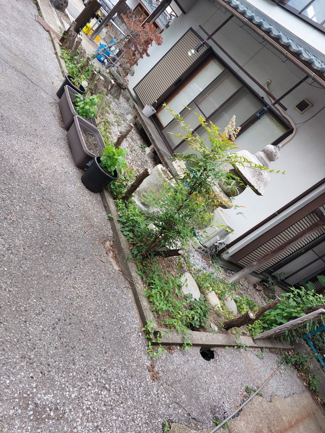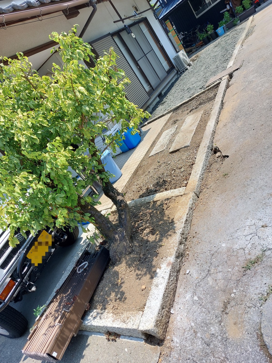 表の埋設のブロック・大きな岩・垣根・縁台・コンクリート面・木(松・南天)の撤去をおこない、土を鋤取り整地してから、砕石(C-30)を敷いてならしました。