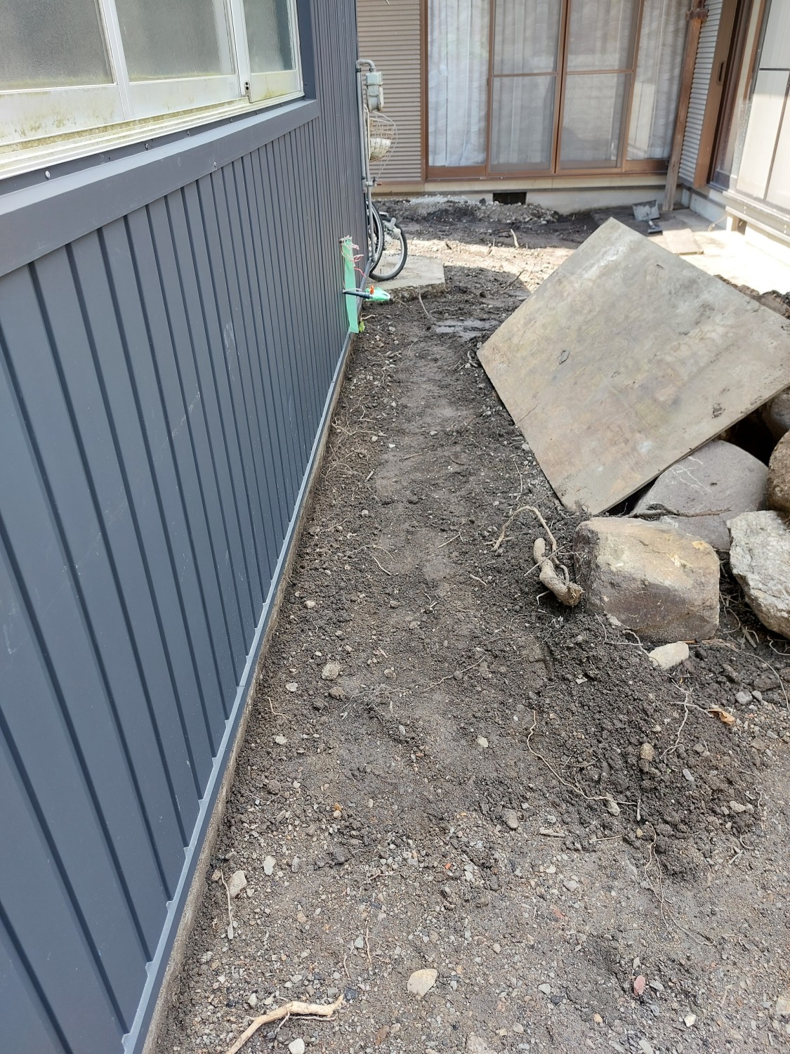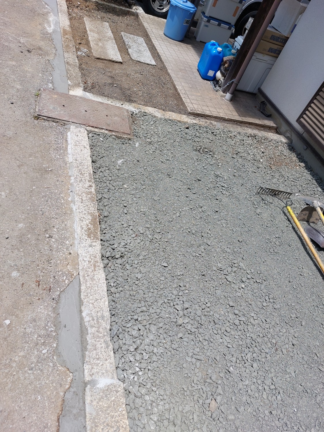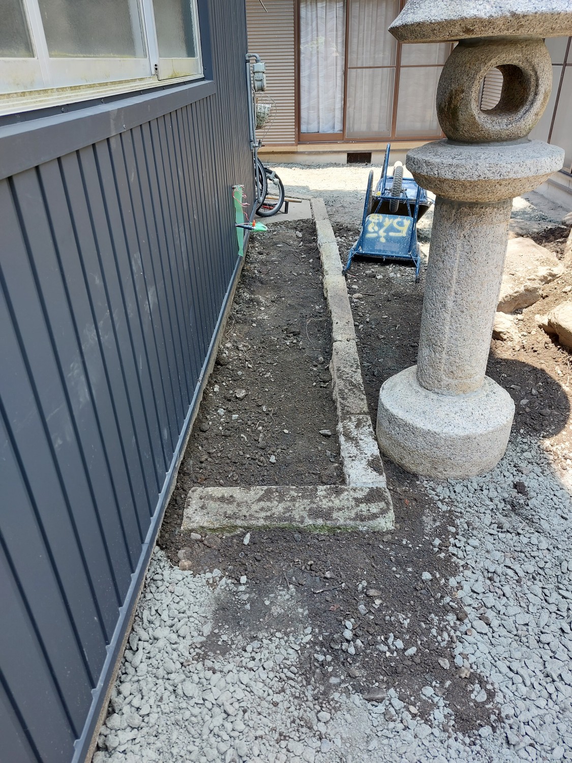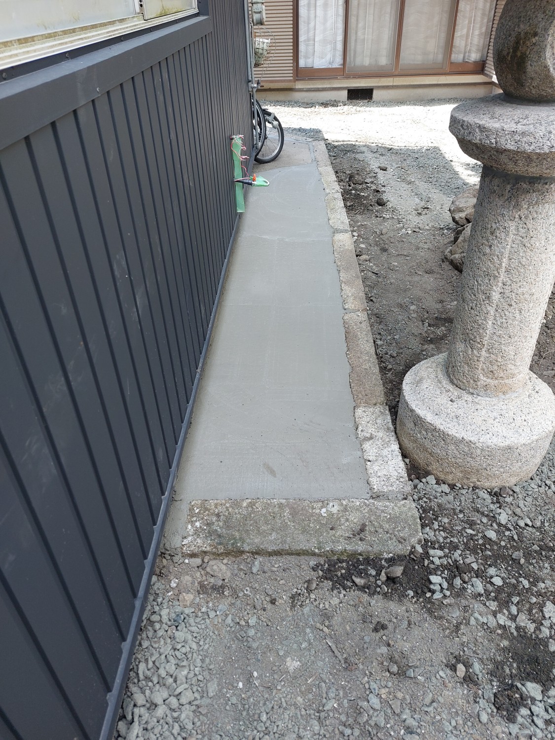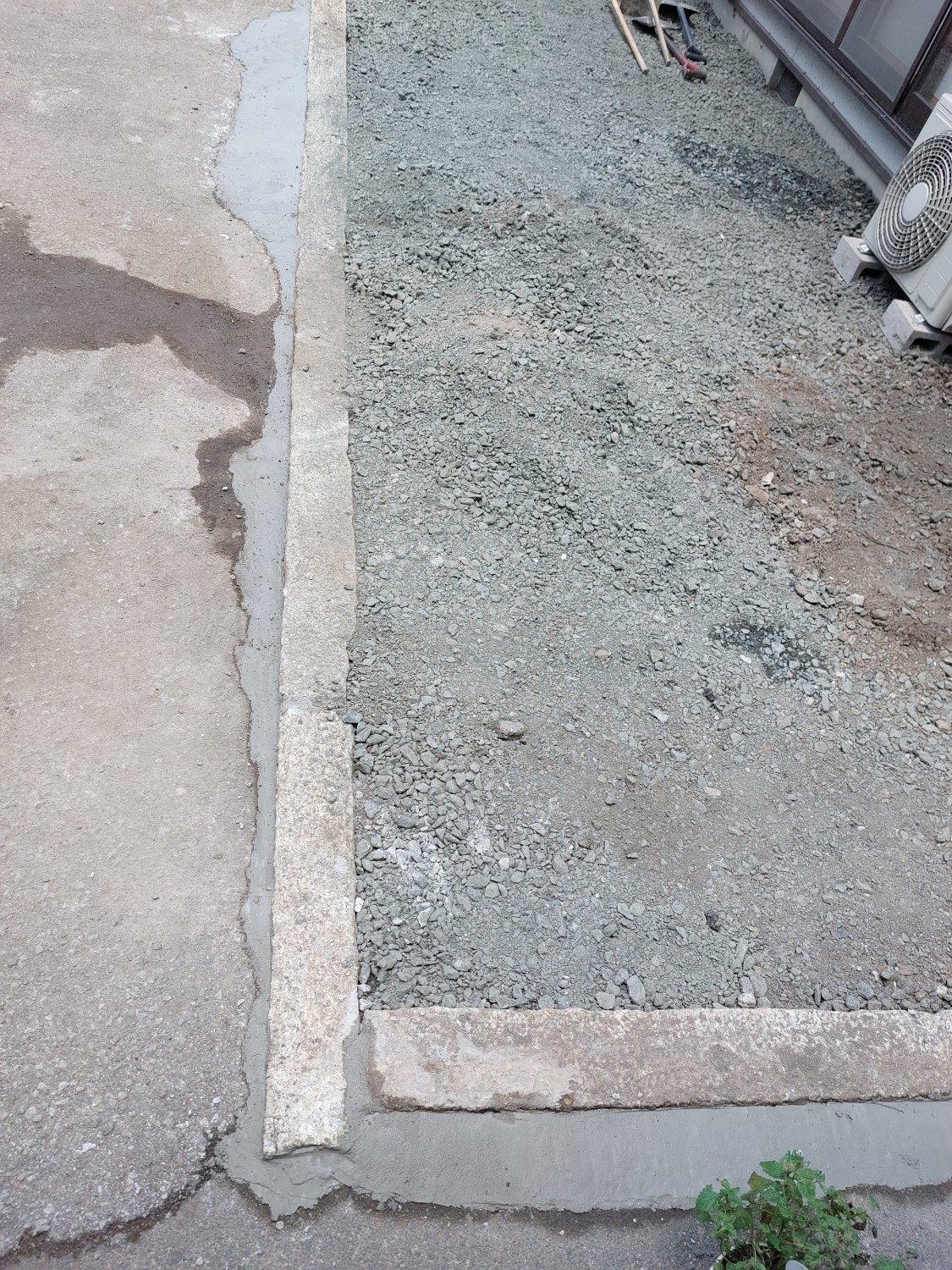 庭とコンクリート面との境に割肌のふち石を敷いて、コンクリート面の欠けている箇所の修復及び建屋の横に犬走りを作り、給湯器・室外機・ガス等を置けるようにしました。