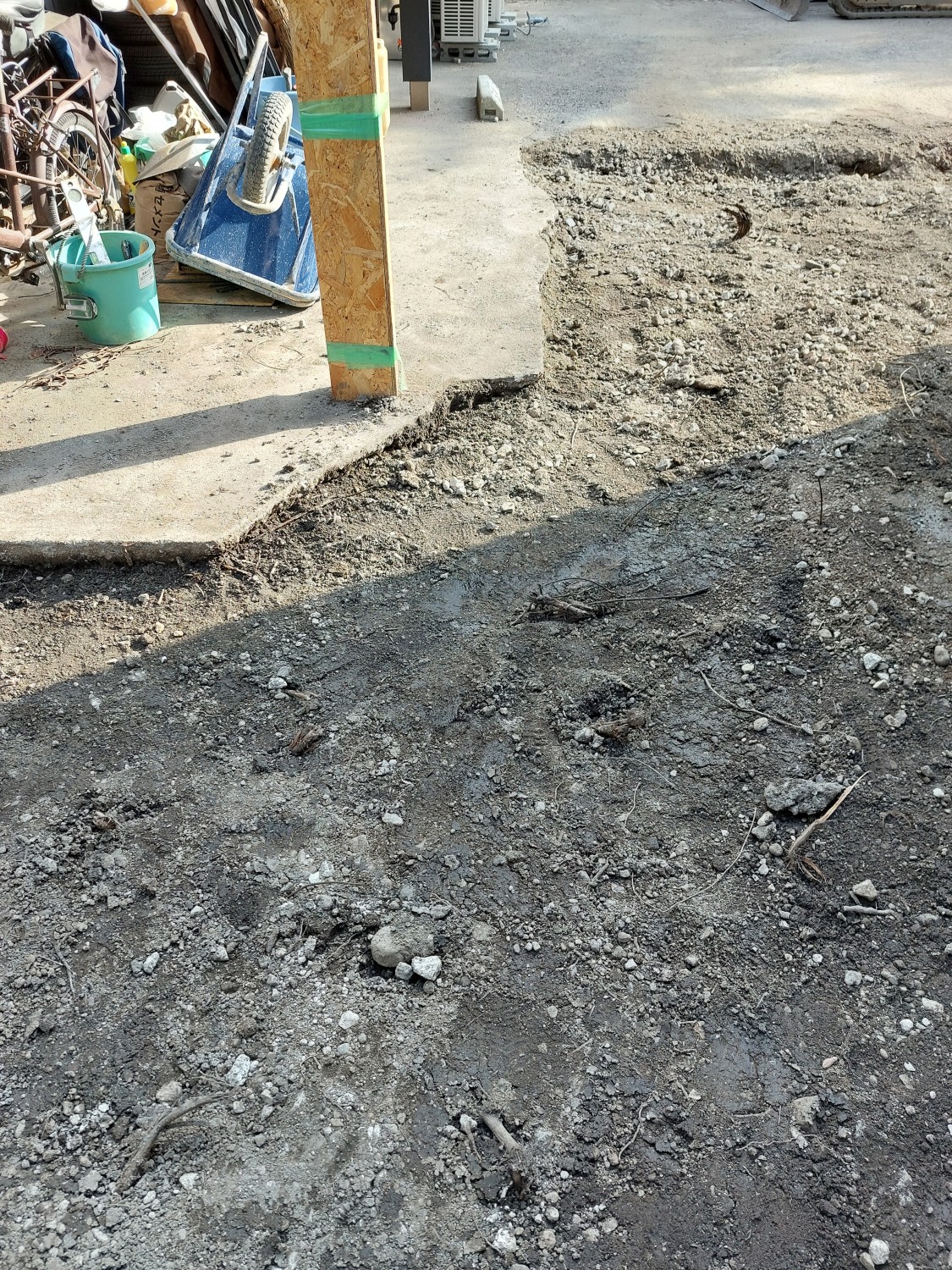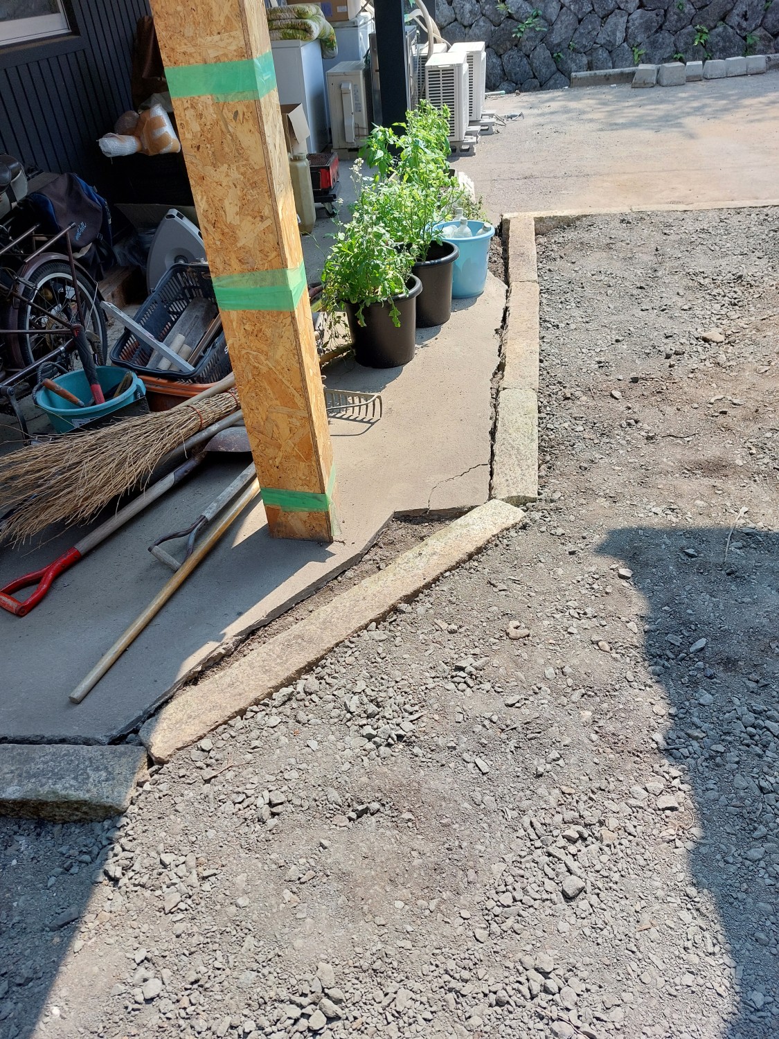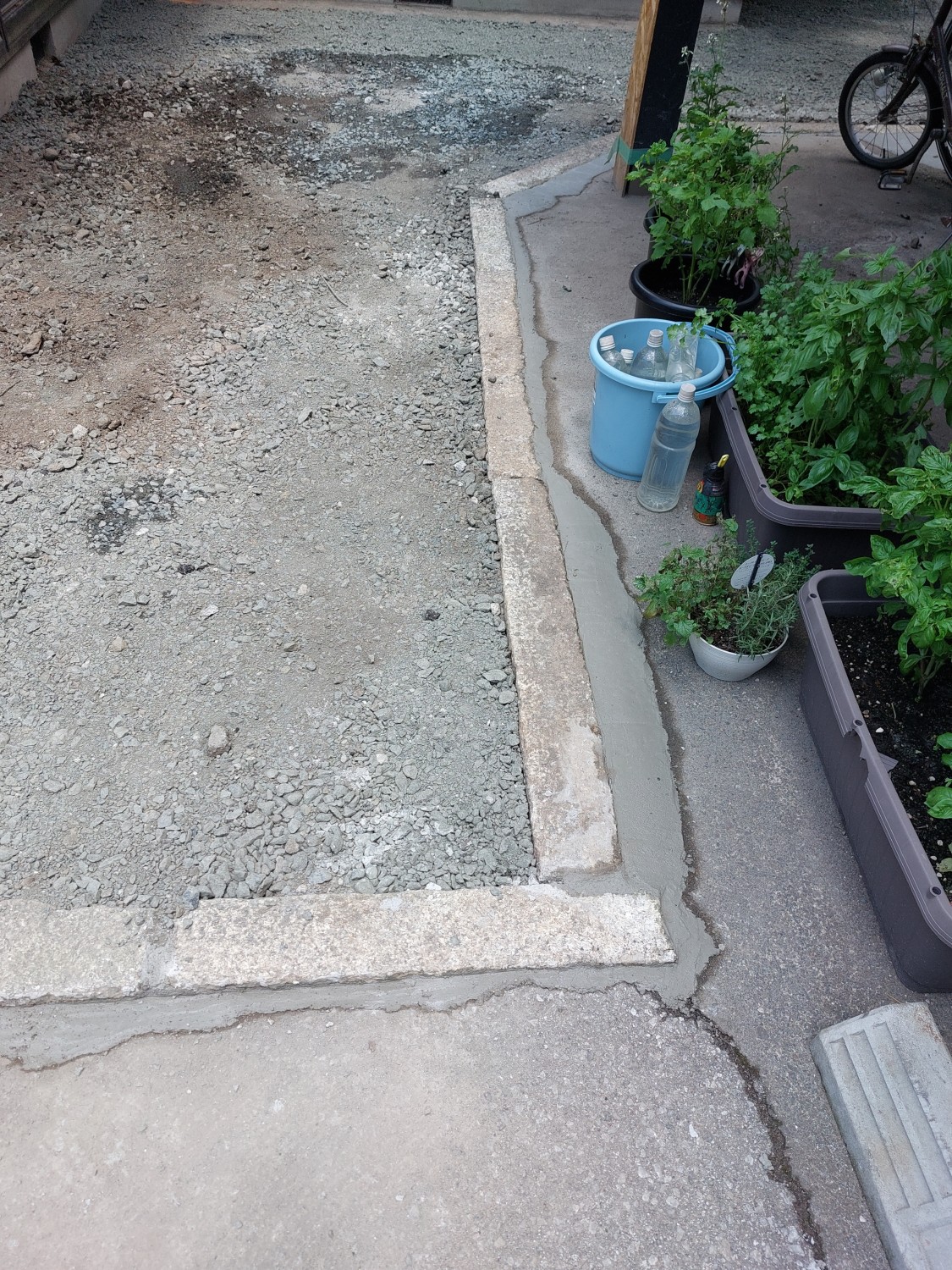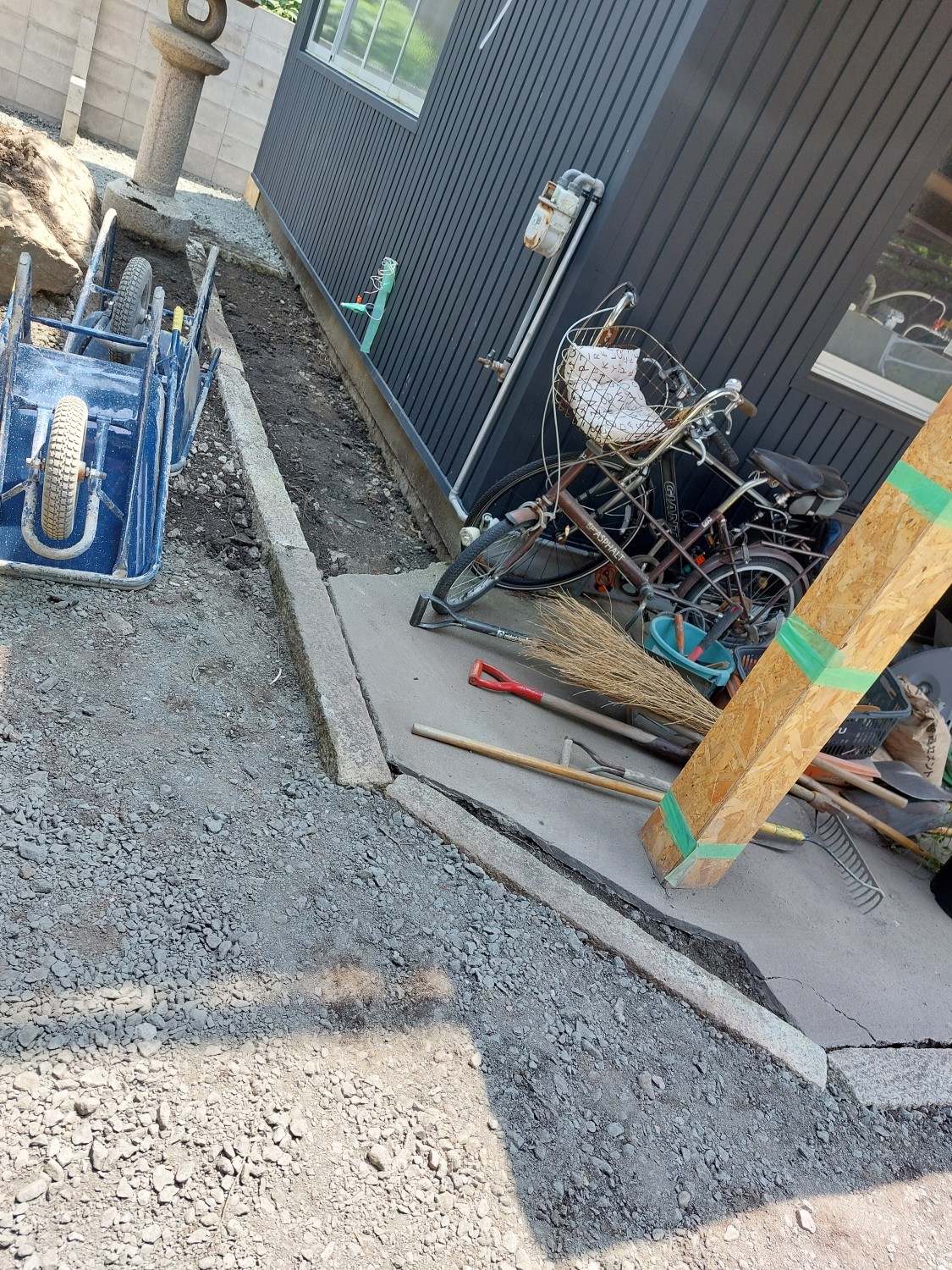 庭とコンクリート面との境に割肌のふち石を敷いて、コンクリート面の欠けている箇所の修復及び建屋の横に犬走りを作り、給湯器・室外機・ガス等を置けるようにしました。