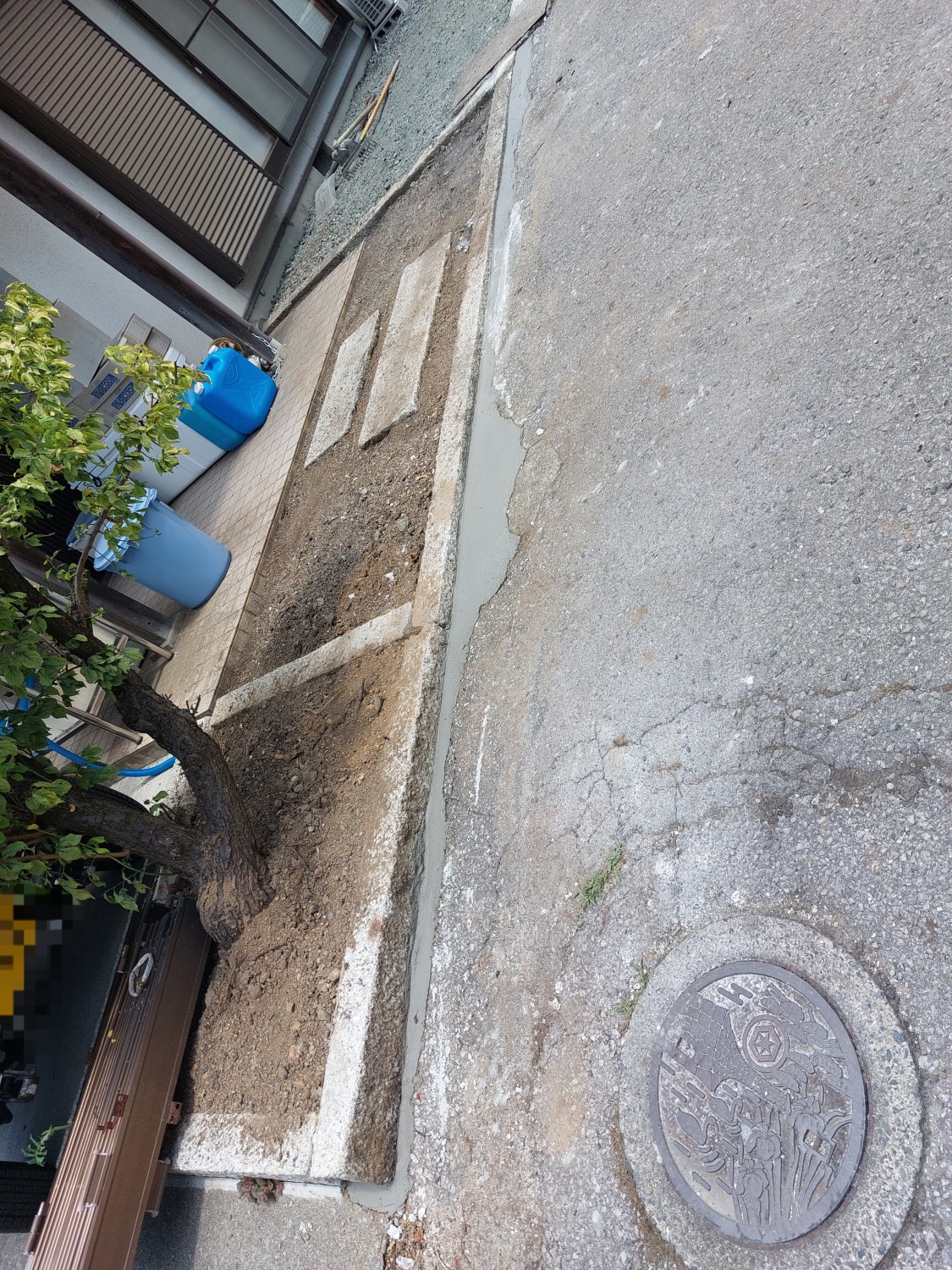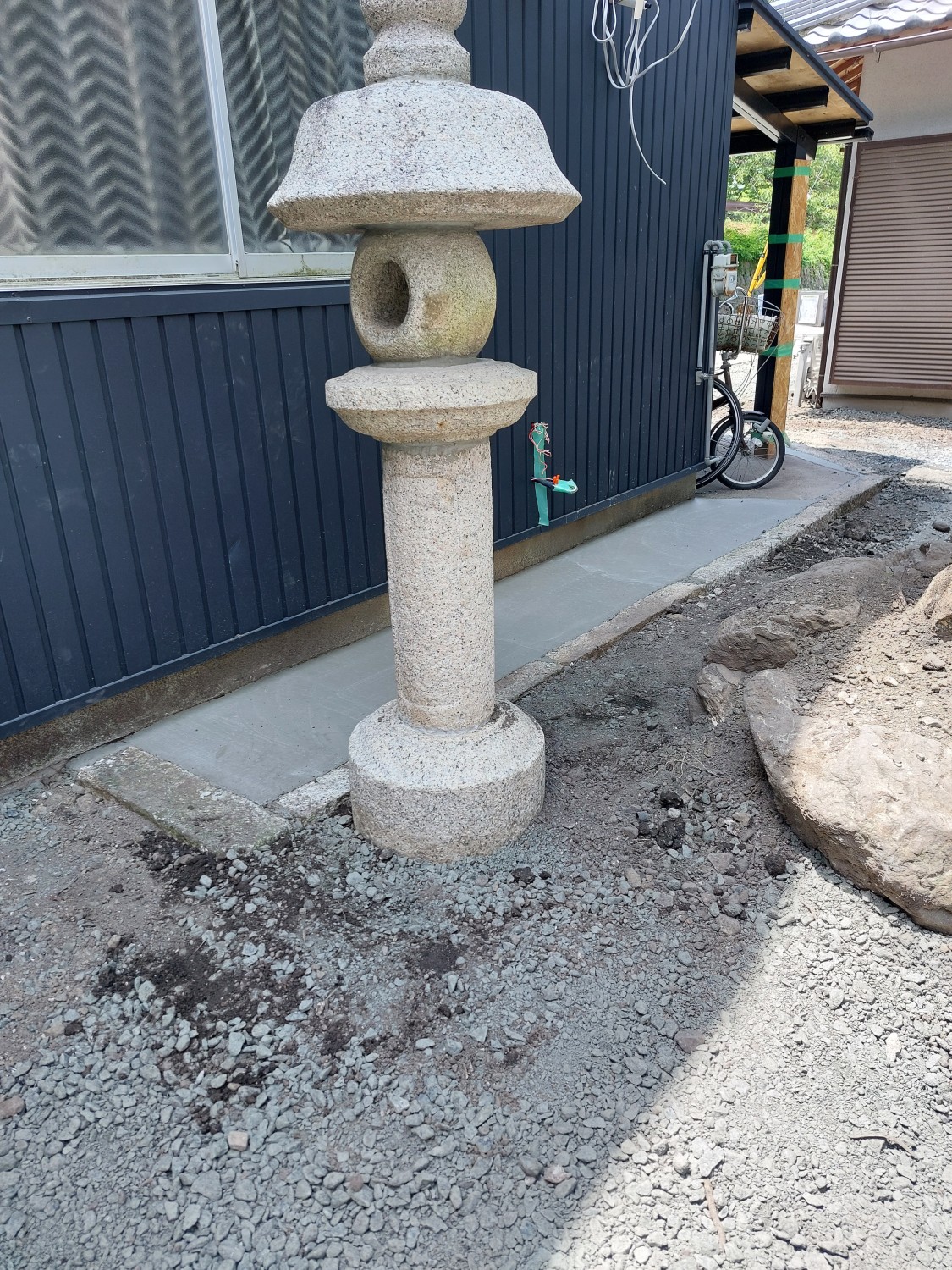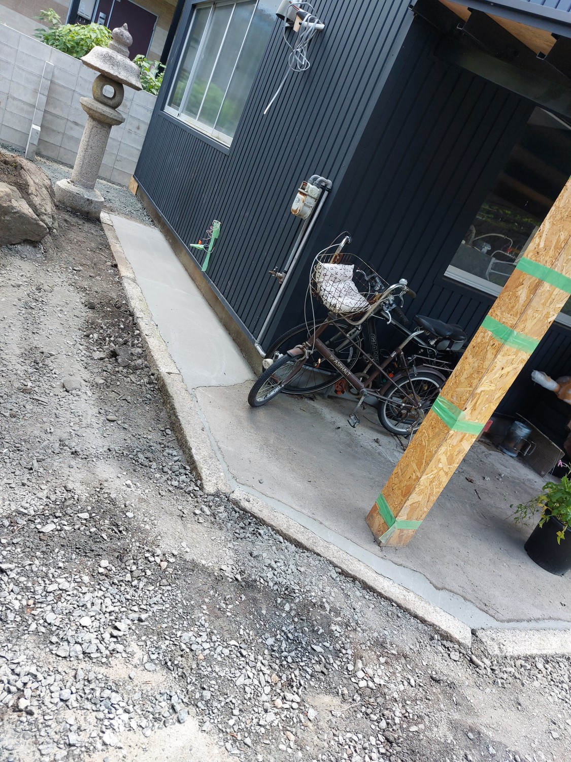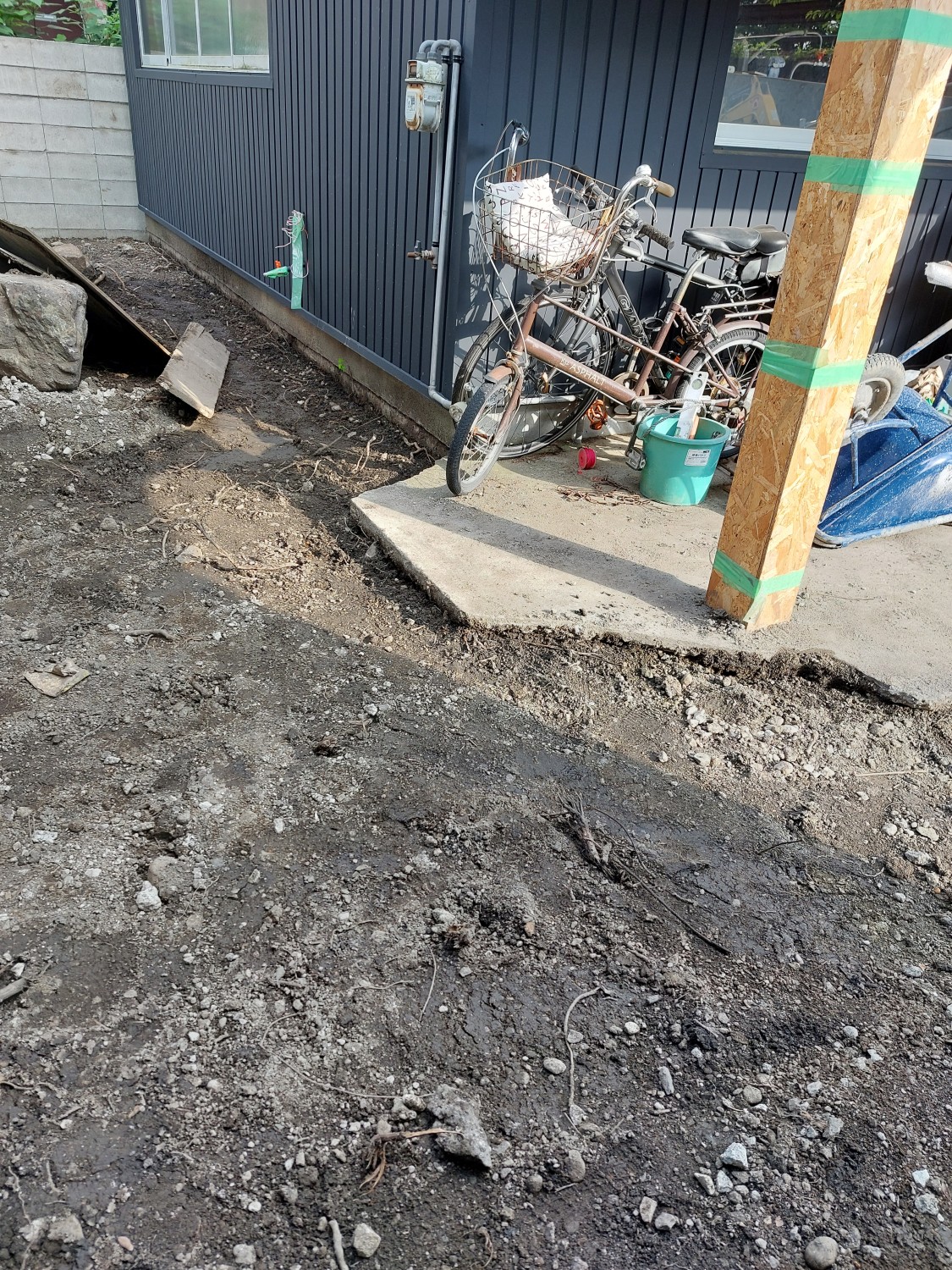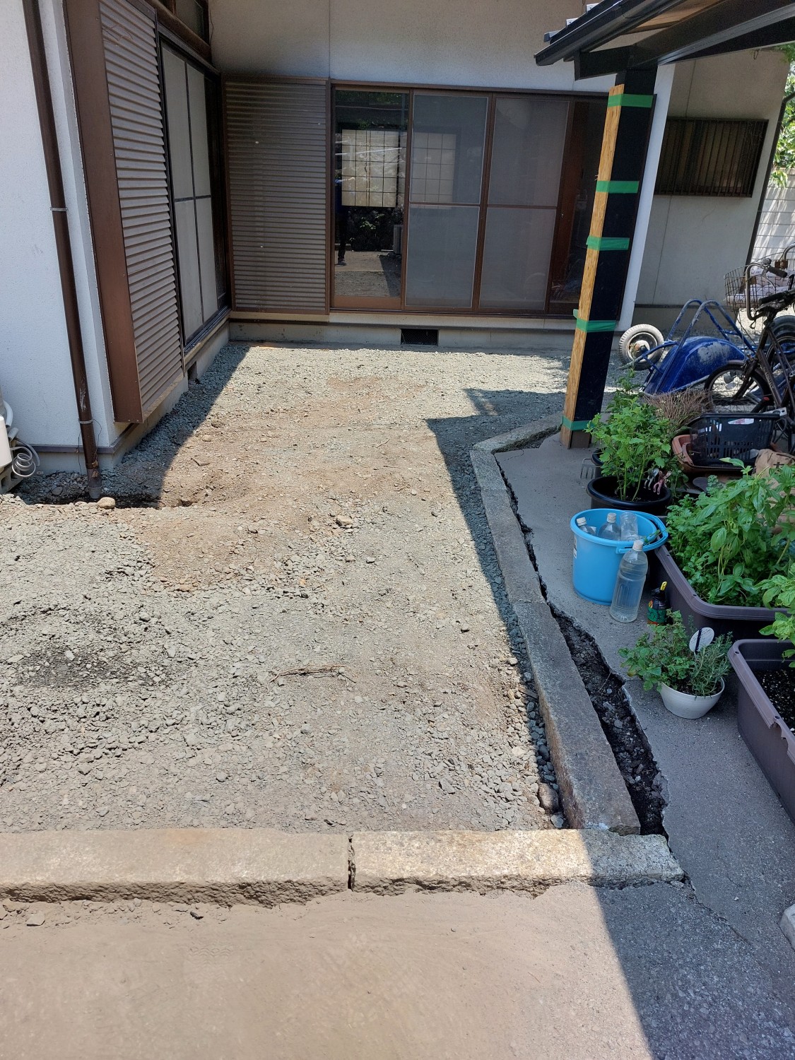 庭とコンクリート面との境に割肌のふち石を敷いて、コンクリート面の欠けている箇所の修復及び建屋の横に犬走りを作り、給湯器・室外機・ガス等を置けるようにしました。