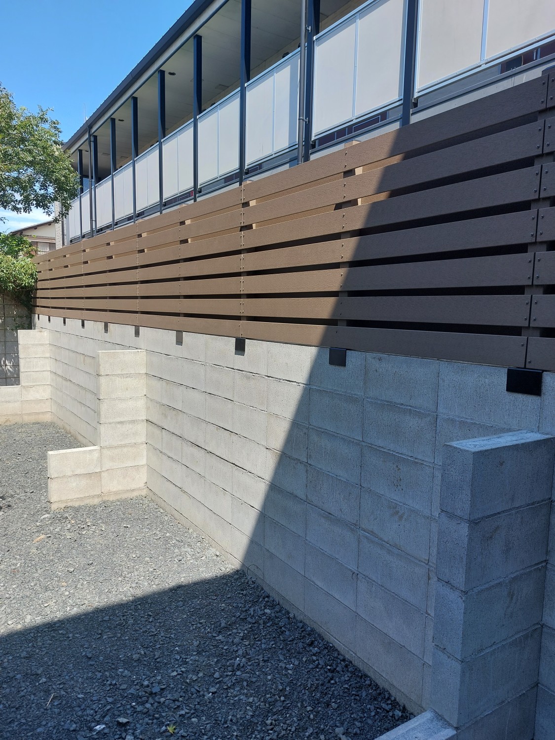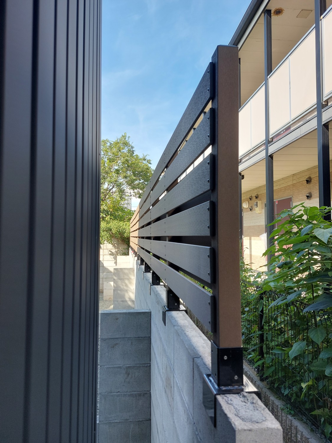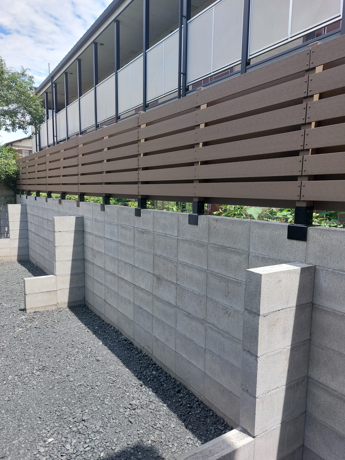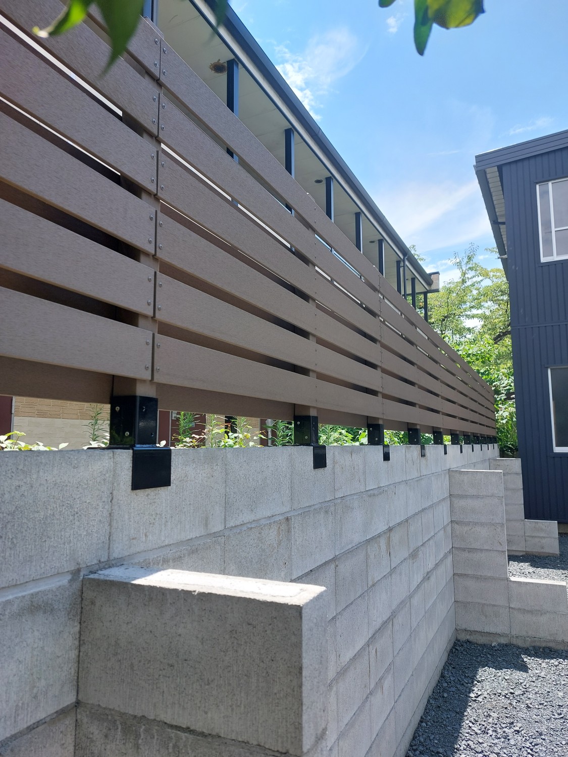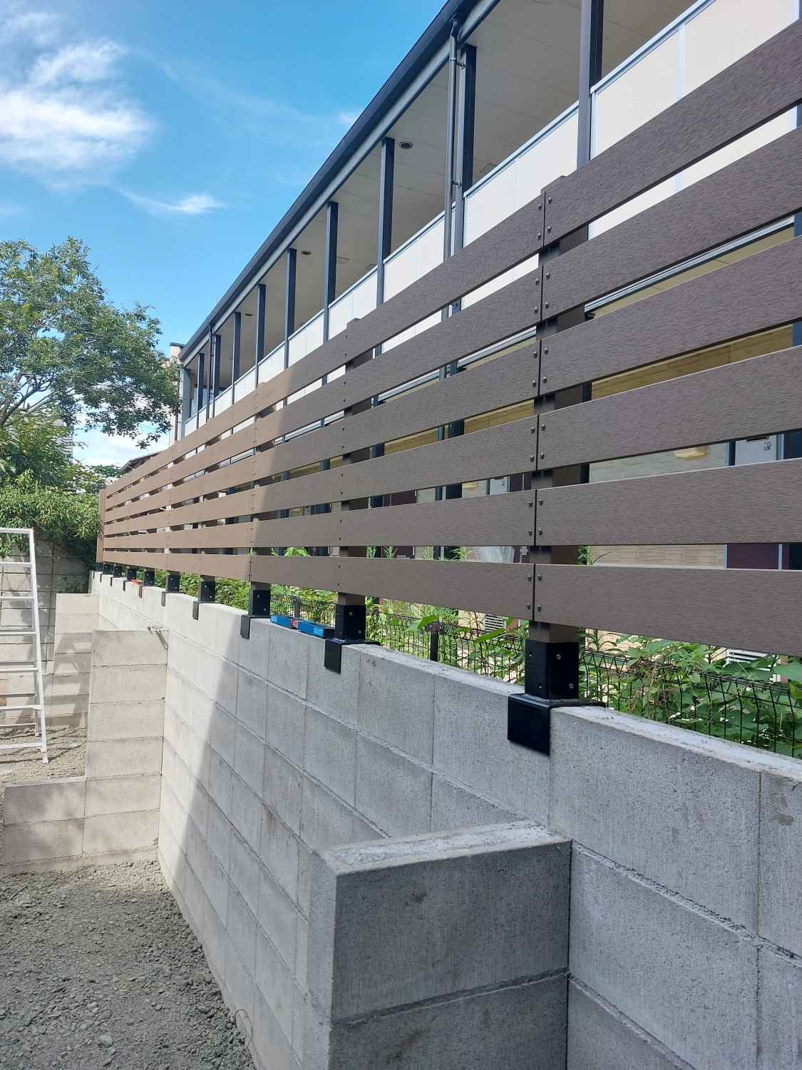 ブロックの上に人工木のウッドフェンスを取り付けて、裏のアパートからの目隠しとしました。