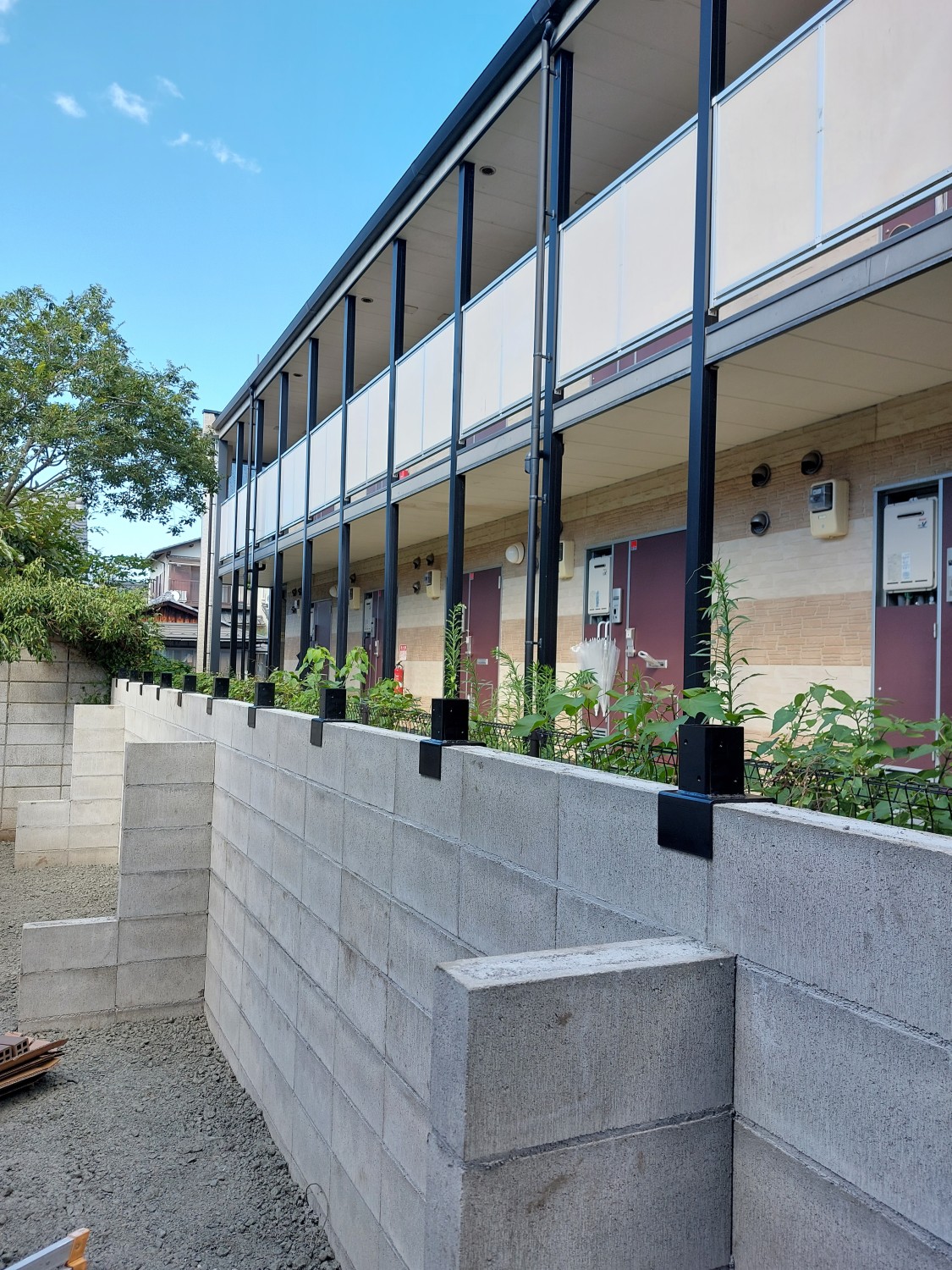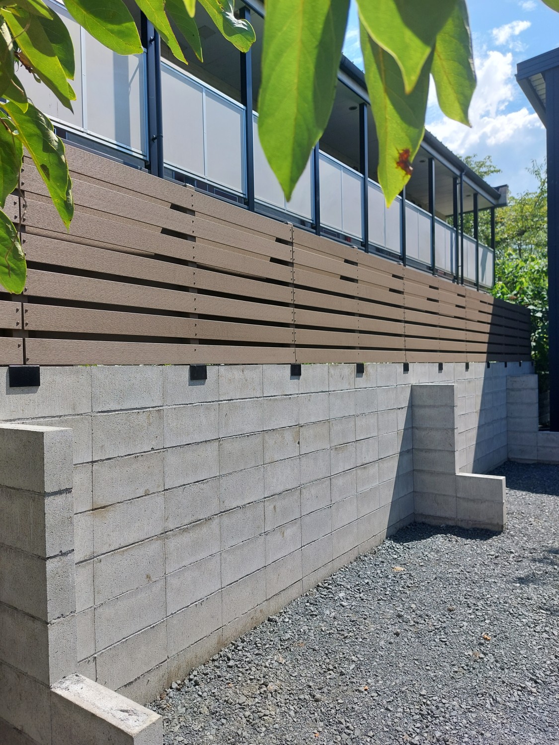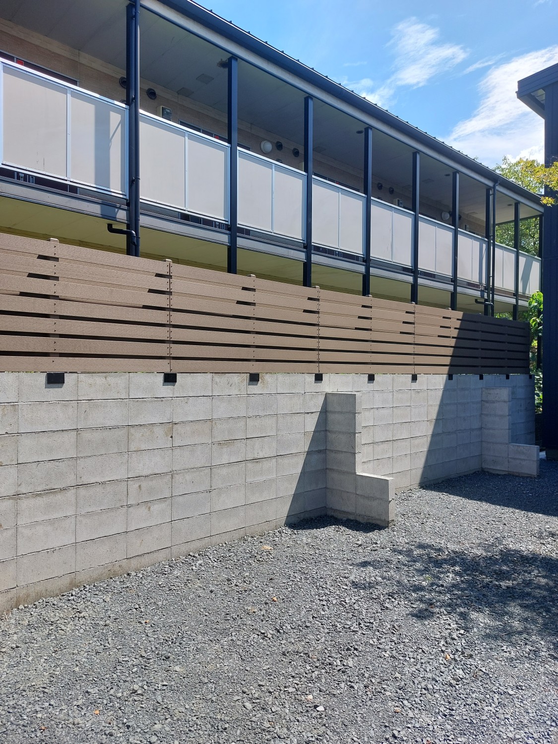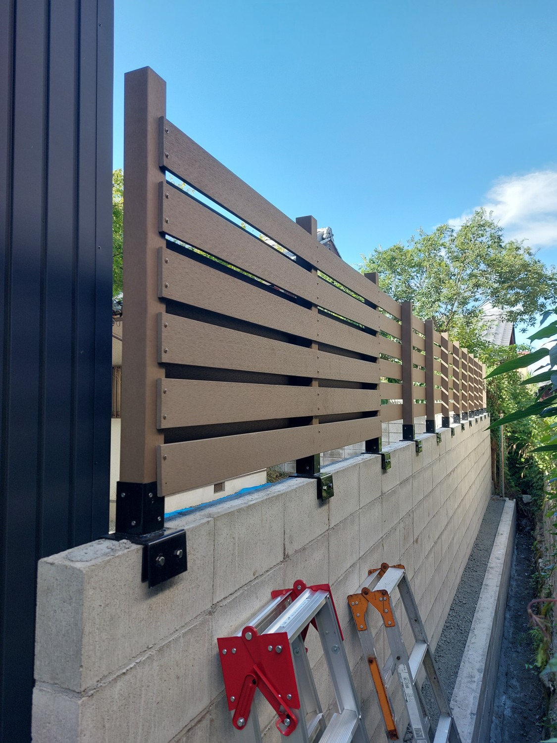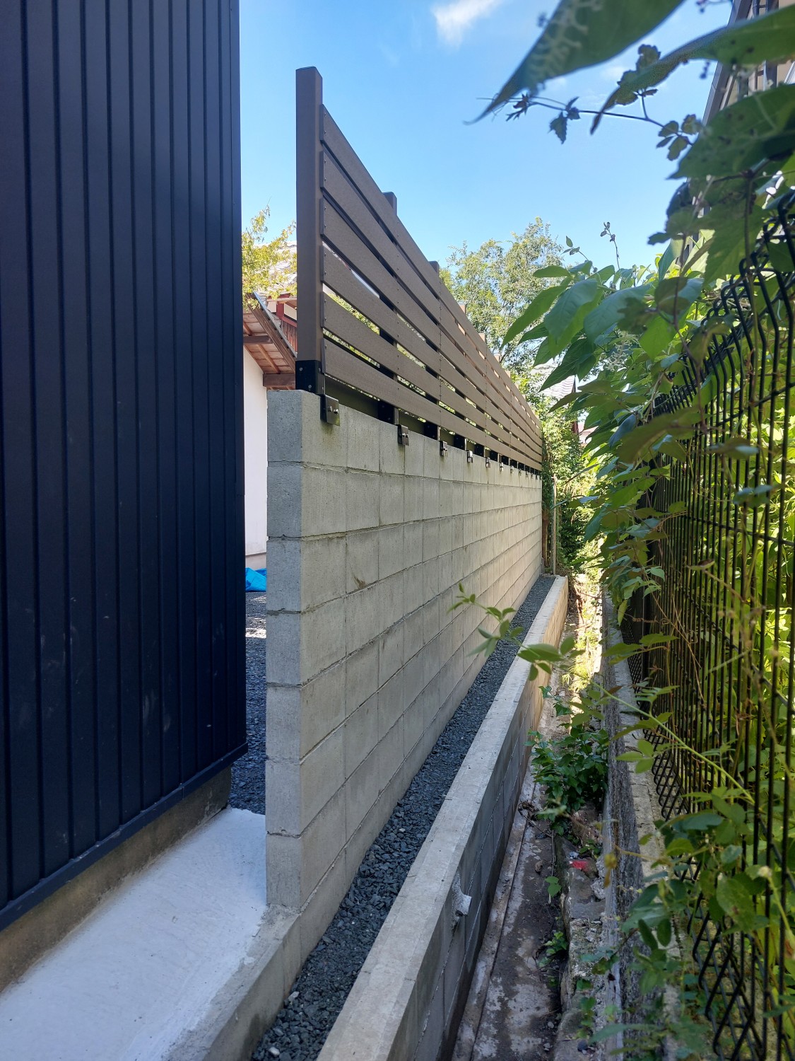 ブロックの上に人工木のウッドフェンスを取り付けて、裏のアパートからの目隠しとしました。