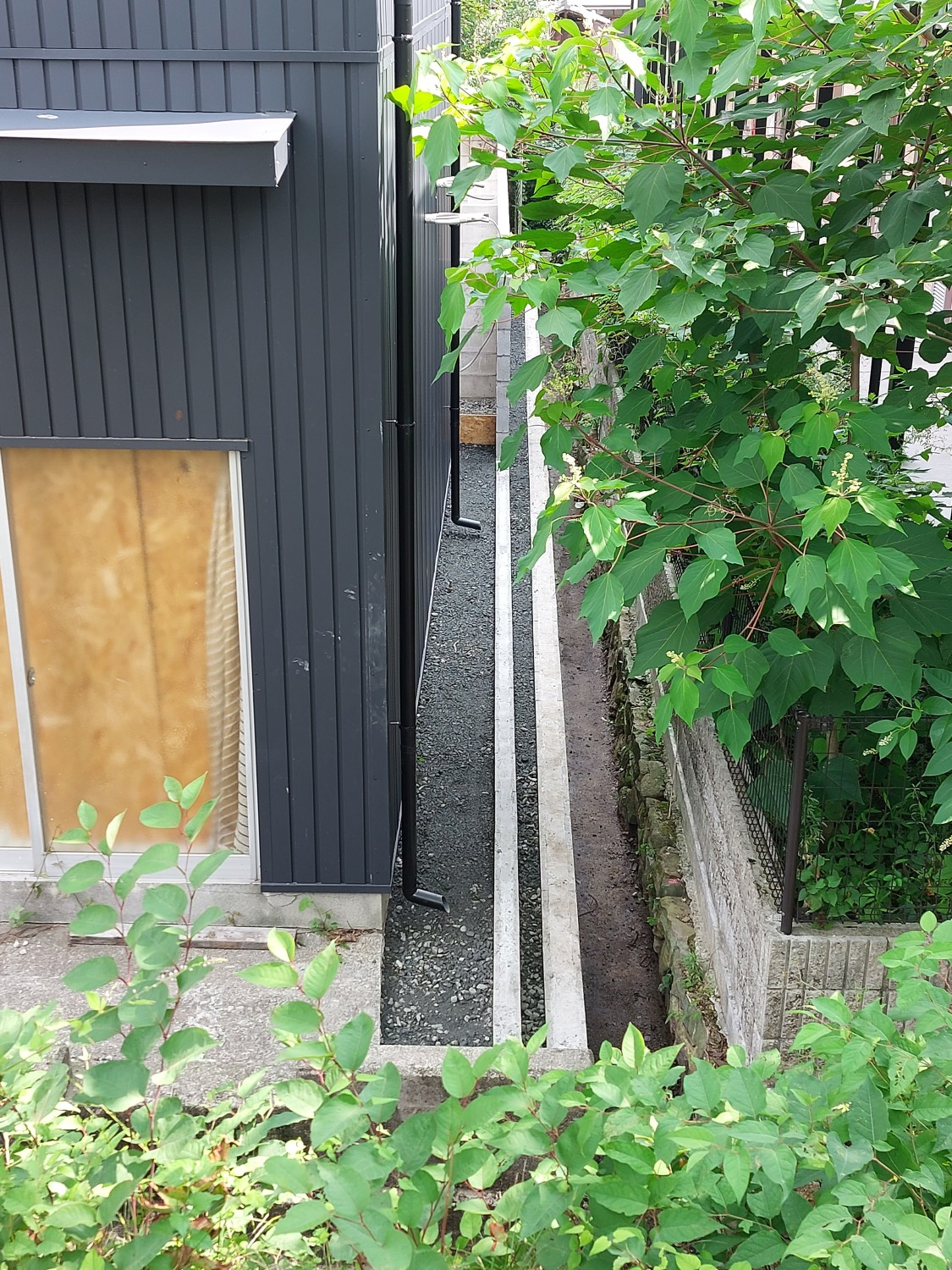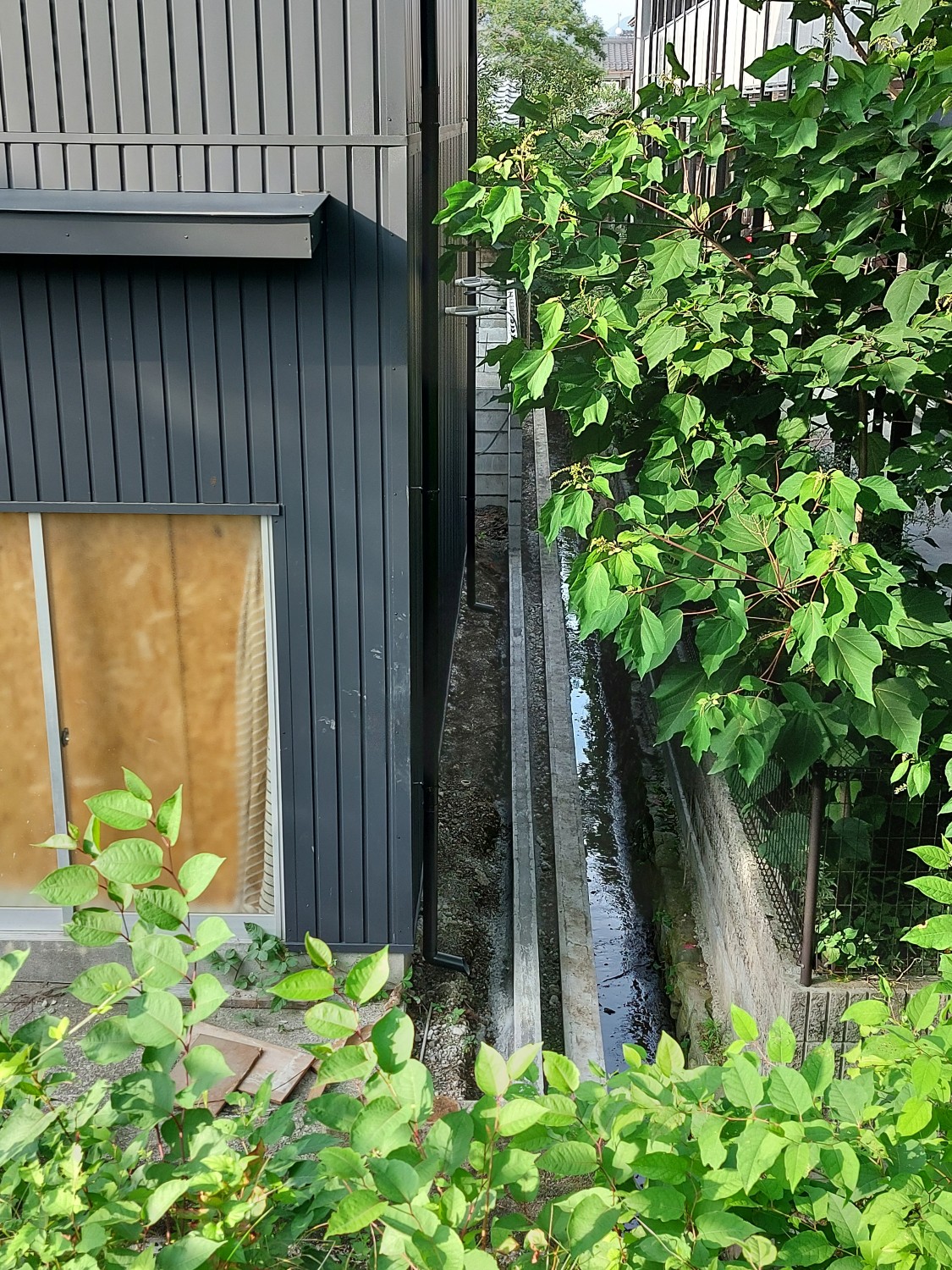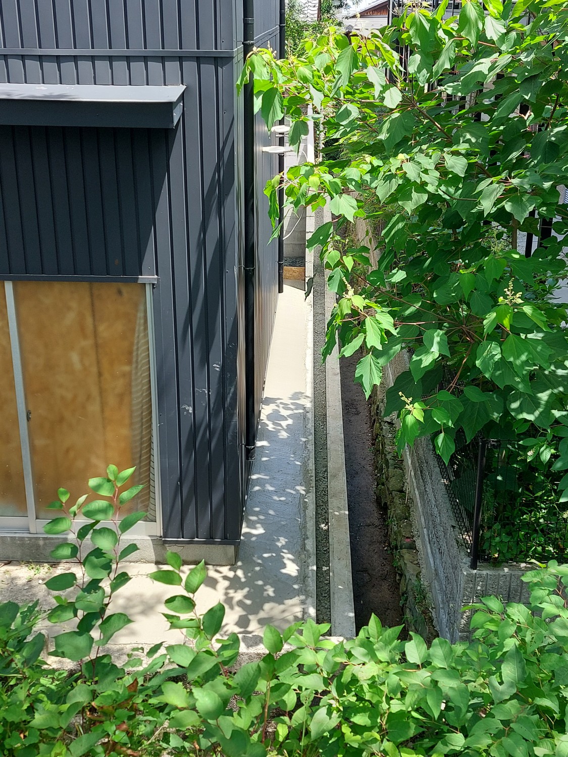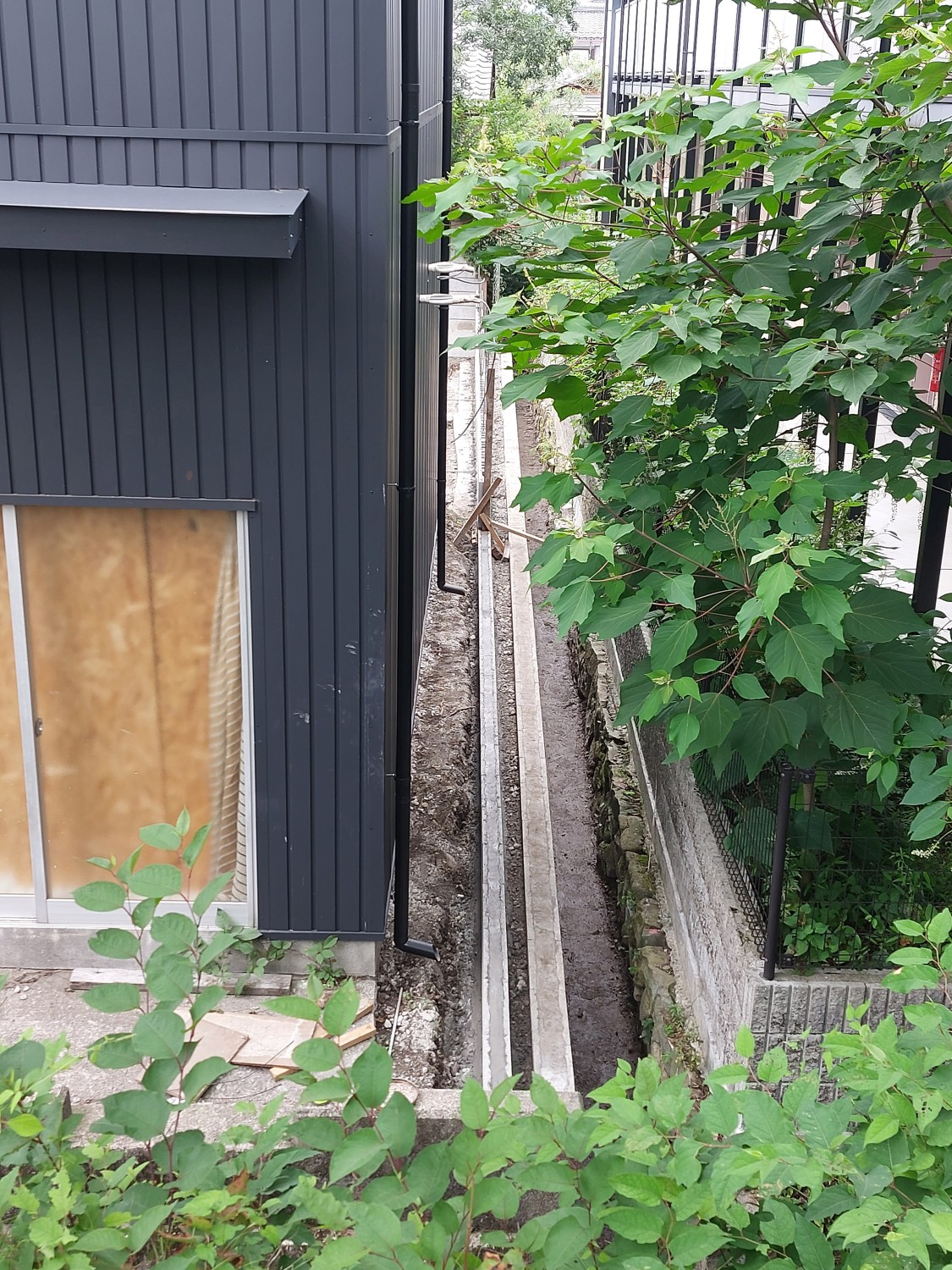 これで、事業所・庭部の裏の基礎・水路擁壁・犬走り・ブロック塀・人工木ウッドフェンス等の施工完了です。