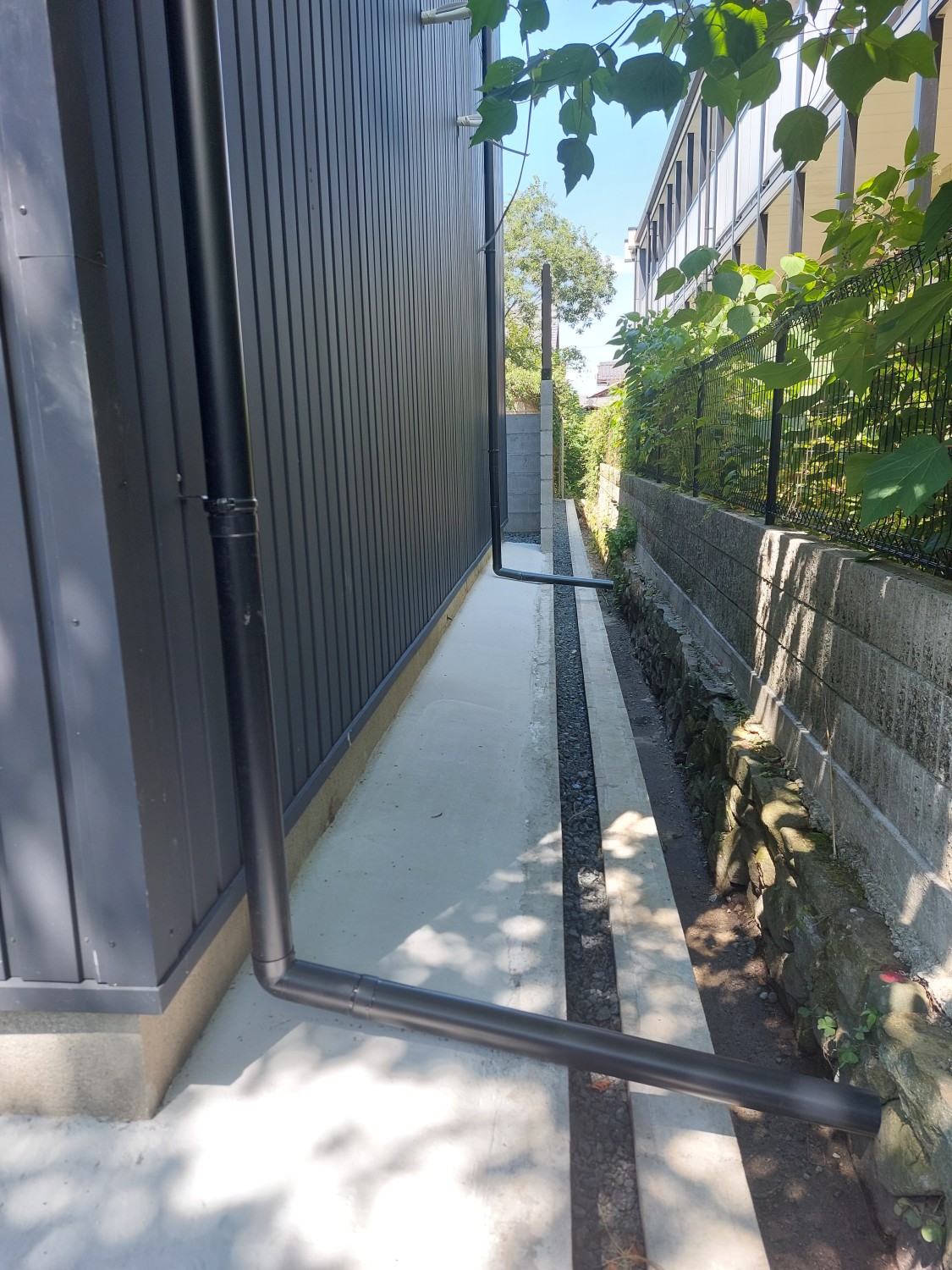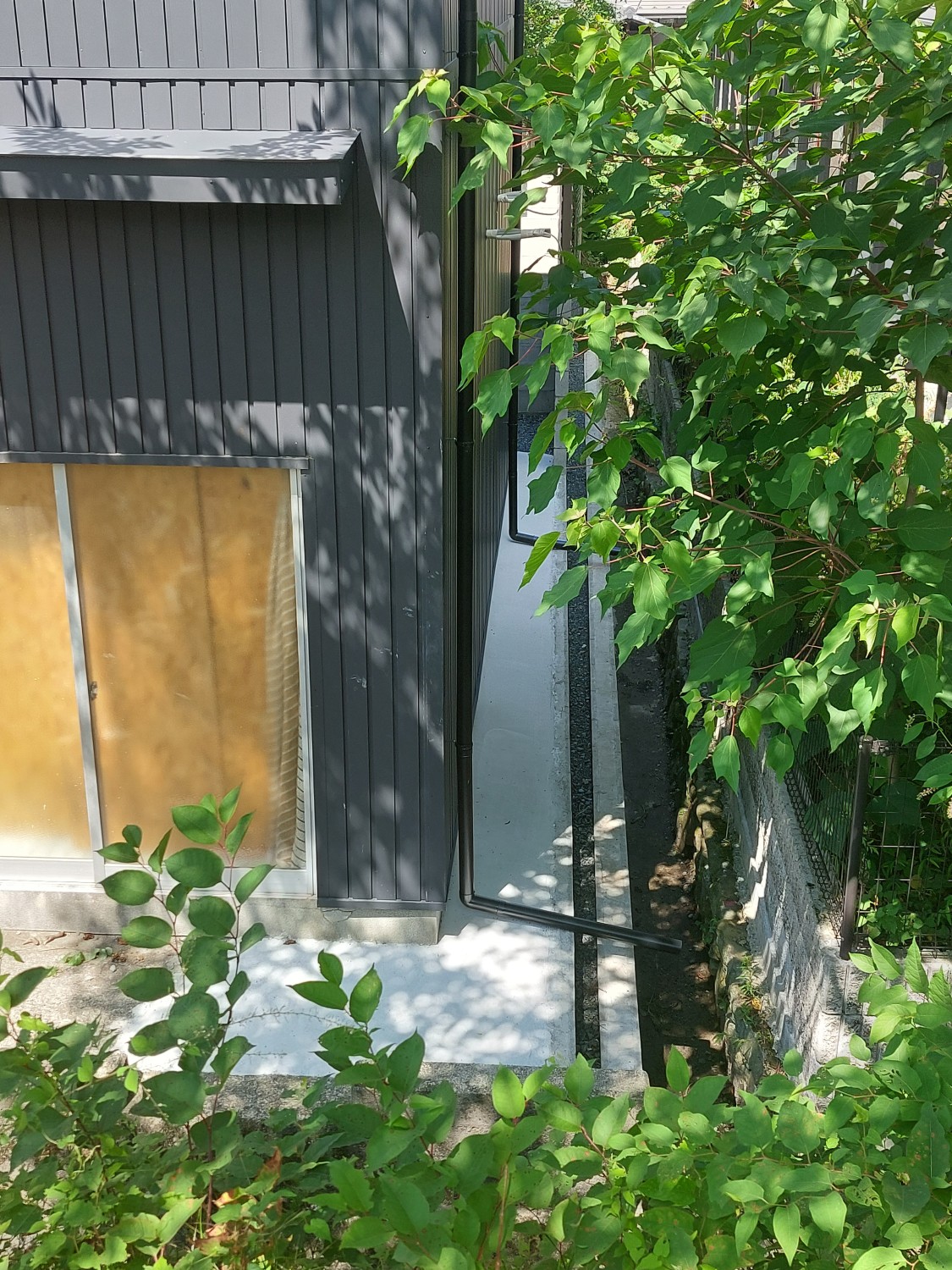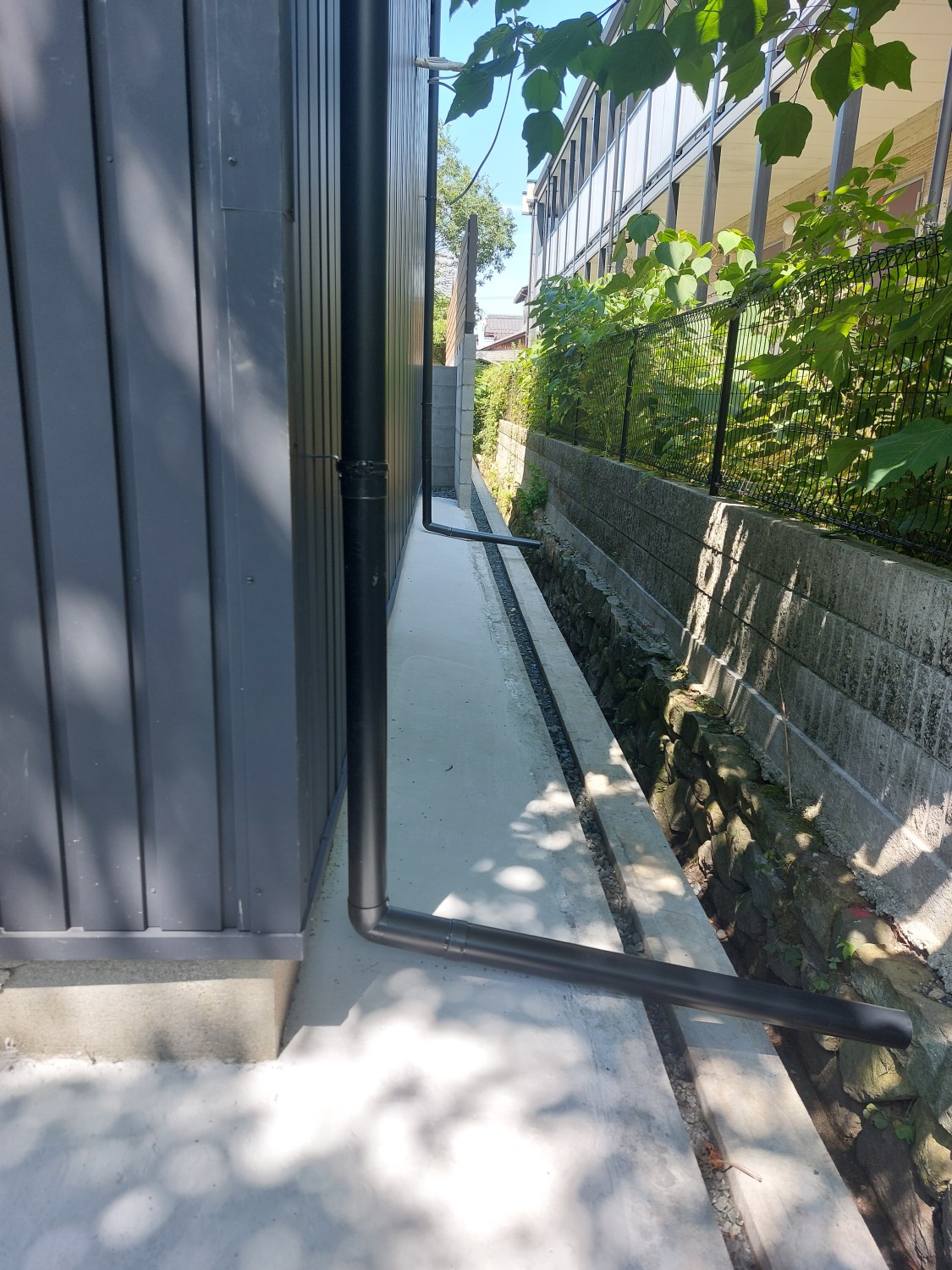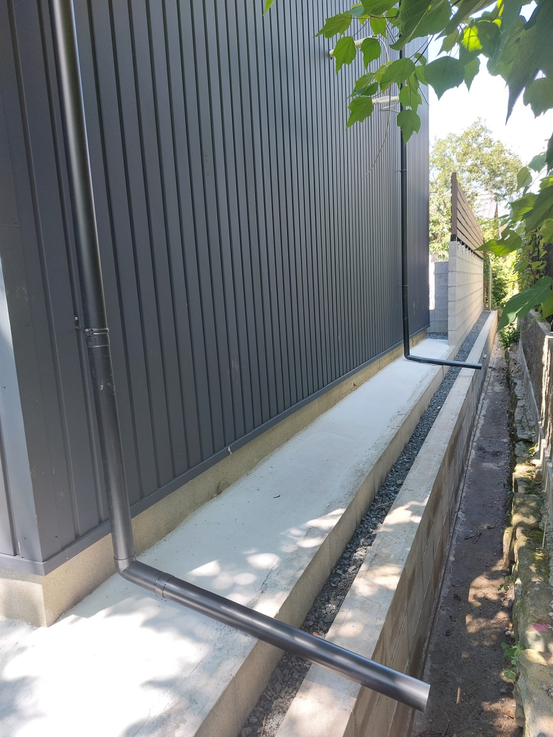これで、事業所・庭部の裏の基礎・水路擁壁・犬走り・ブロック塀・人工木ウッドフェンス等の施工完了です。