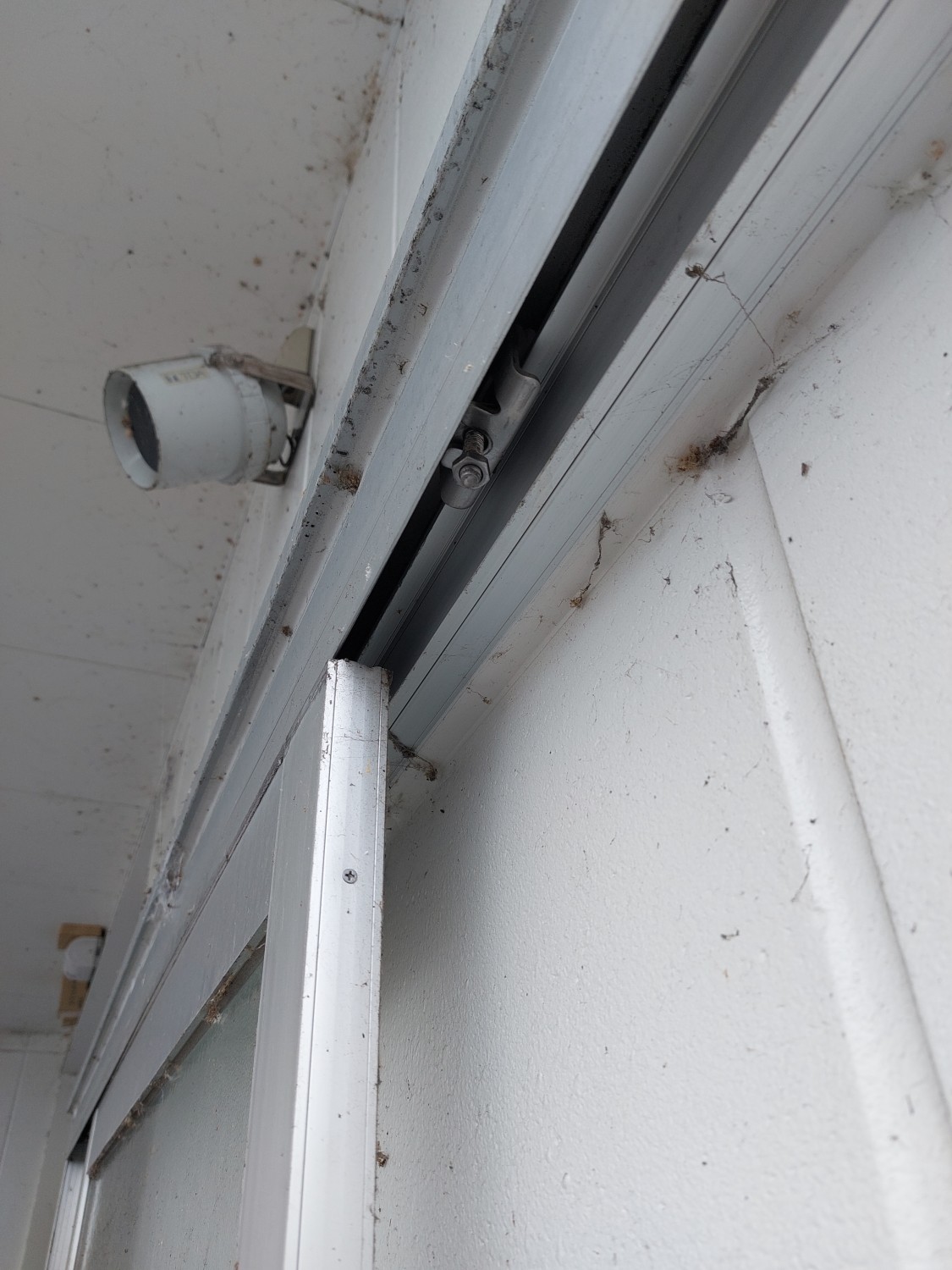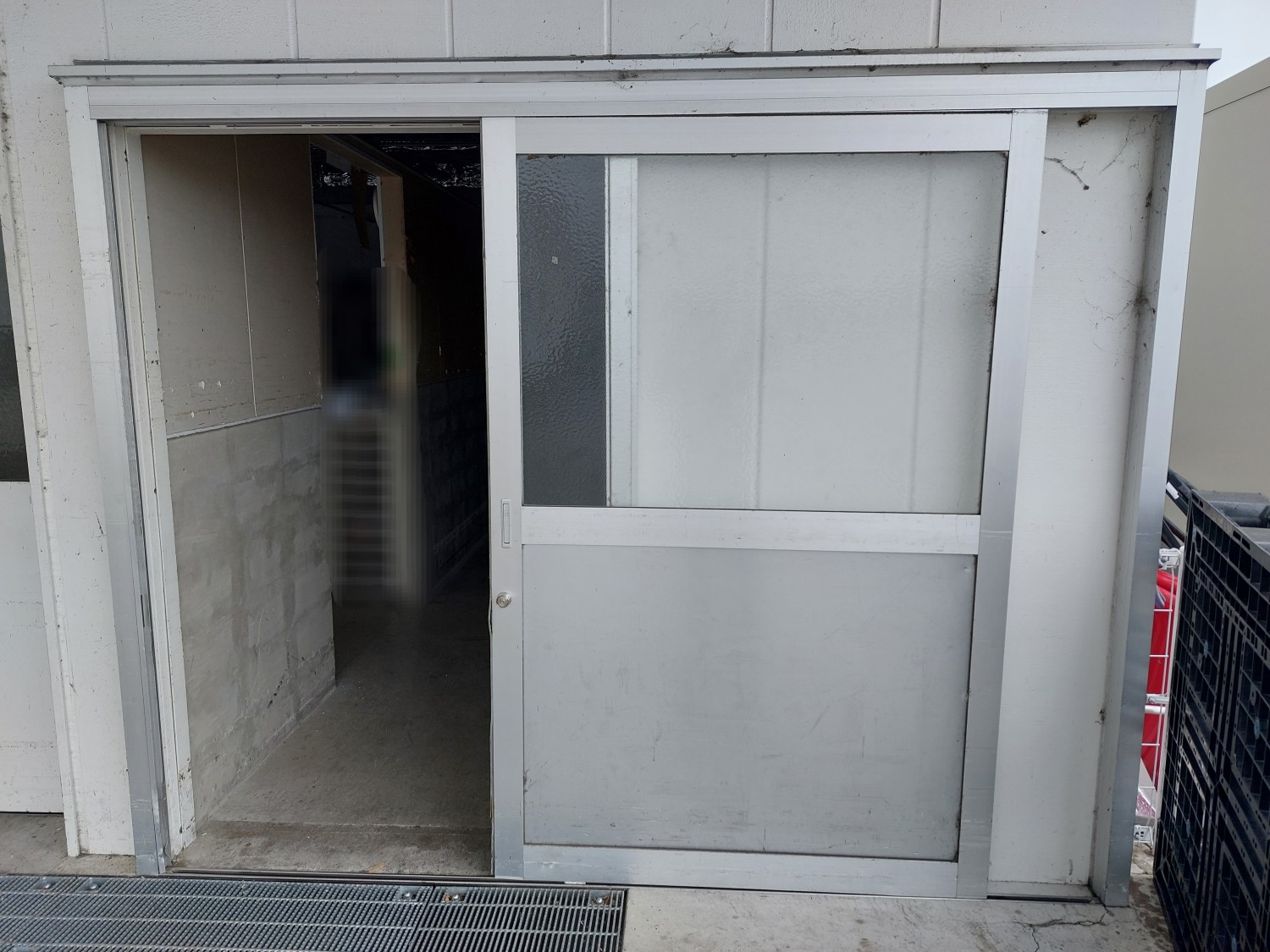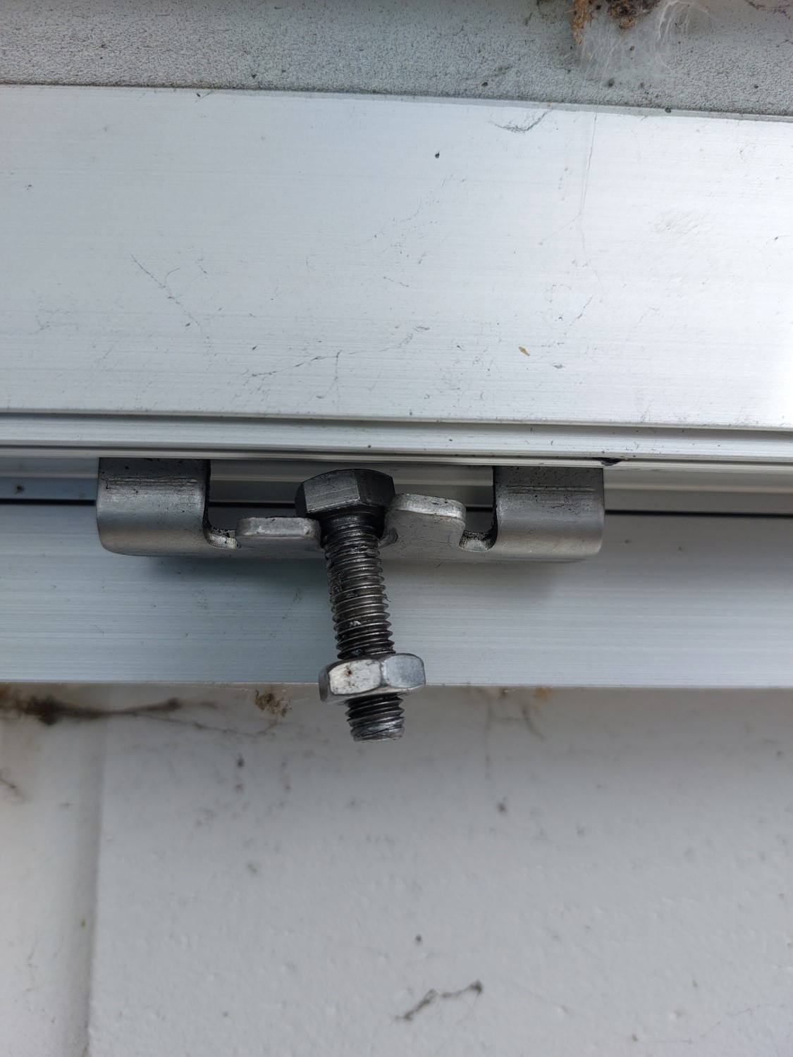 引き戸ドアにカゴ車がぶつかり、引き戸ドアの吊り金具が曲がる程の衝撃で、吊り金具が外れてドアが落ちていましたので、アルミサッシを外してドアを外してから吊り金具を外し、吊り金具の変形した箇所を成形し直して、潰れていました吊り金具のボルトとナットを交換しました。