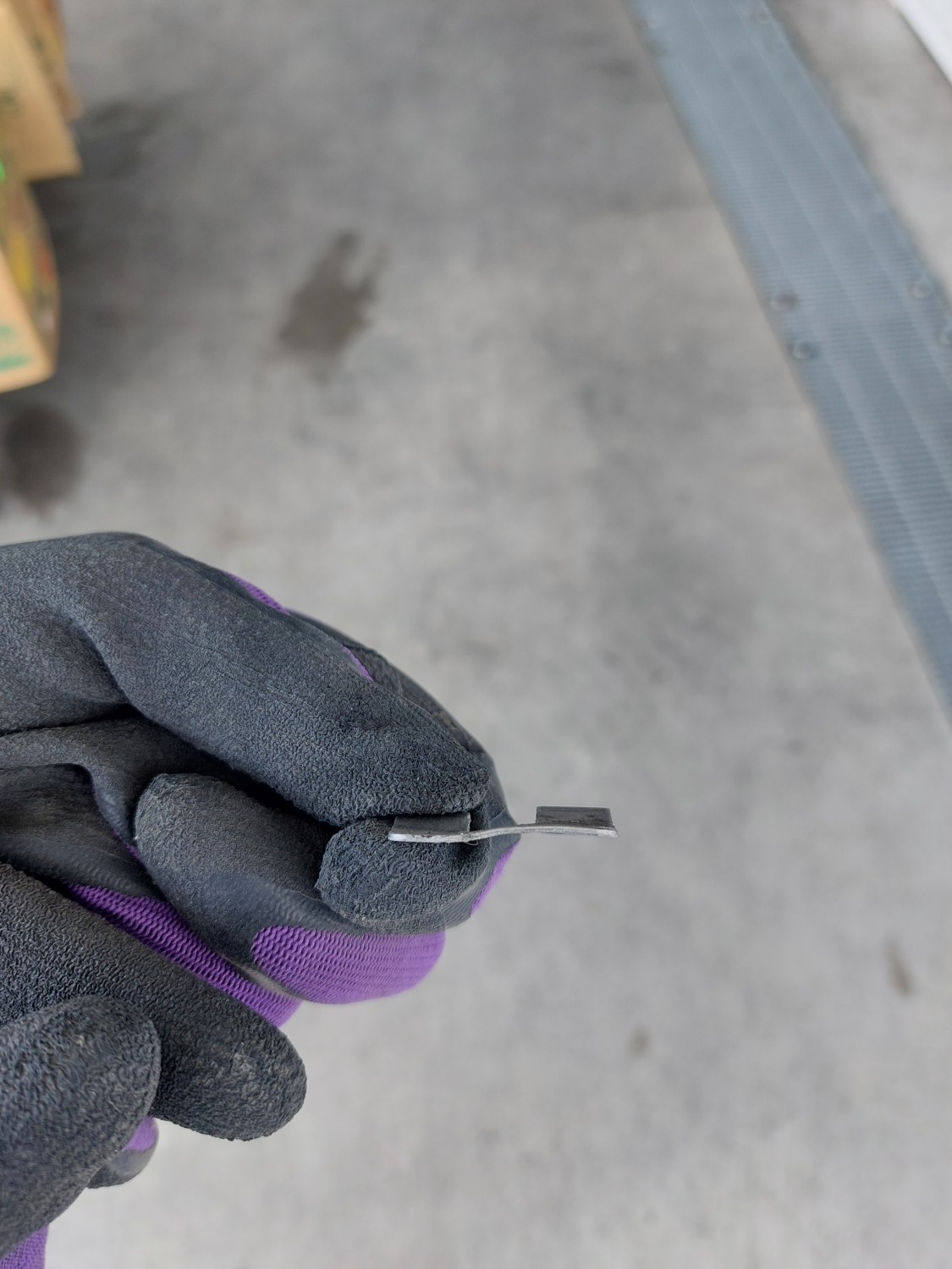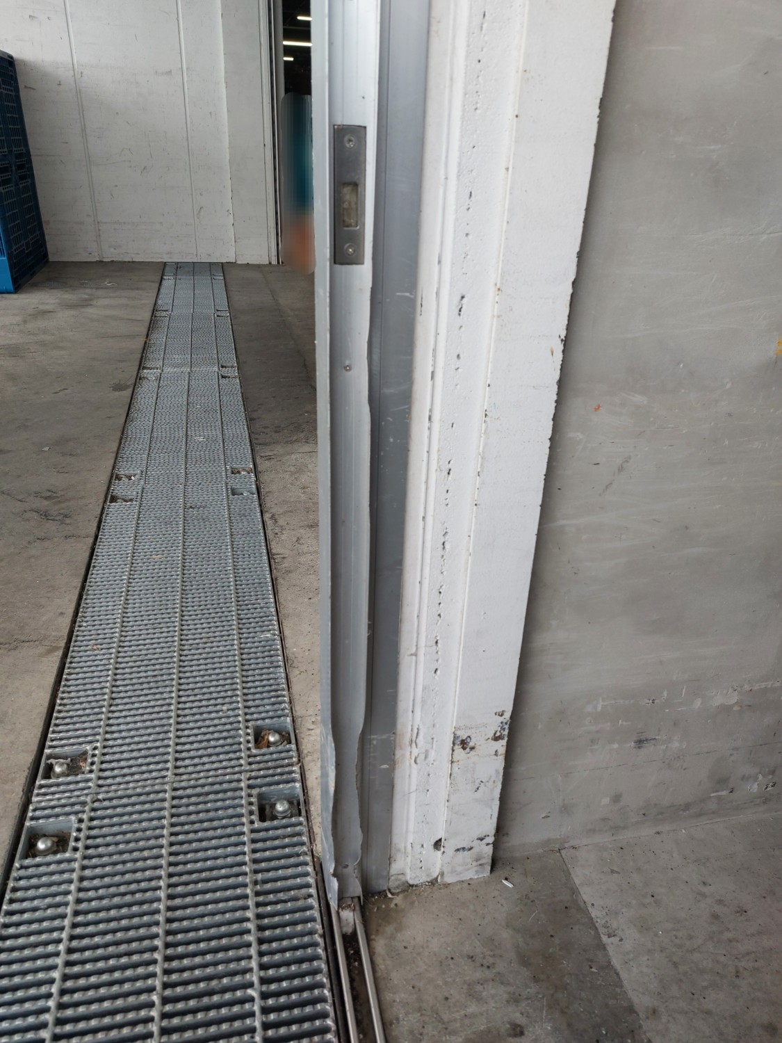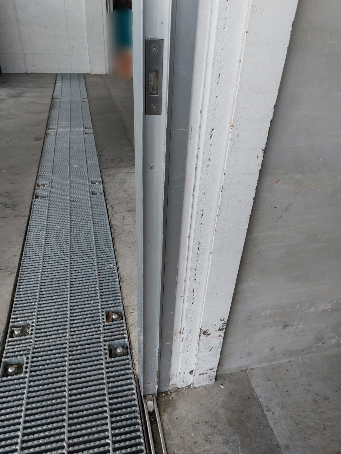 引き戸ドアにカゴ車がぶつかり、引き戸ドアの吊り金具が曲がる程の衝撃で、吊り金具が外れてドアが落ちていましたので、アルミサッシを外してドアを外してから吊り金具を外し、吊り金具の変形した箇所を成形し直して、潰れていました吊り金具のボルトとナットを交換しました。