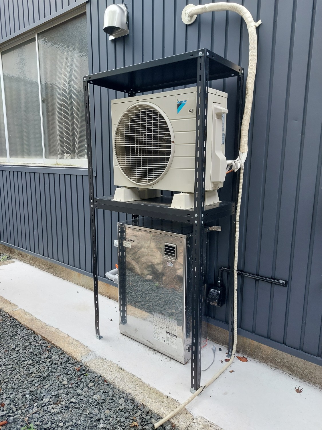 室内から屋外へ電気配線の延長をおこない、屋外コンセントの設置をしました。