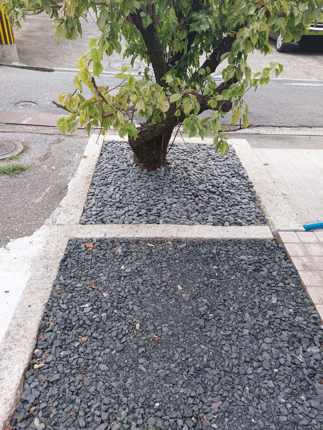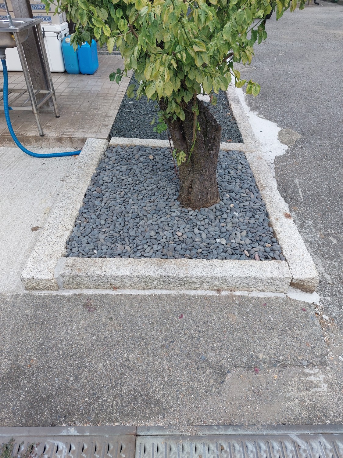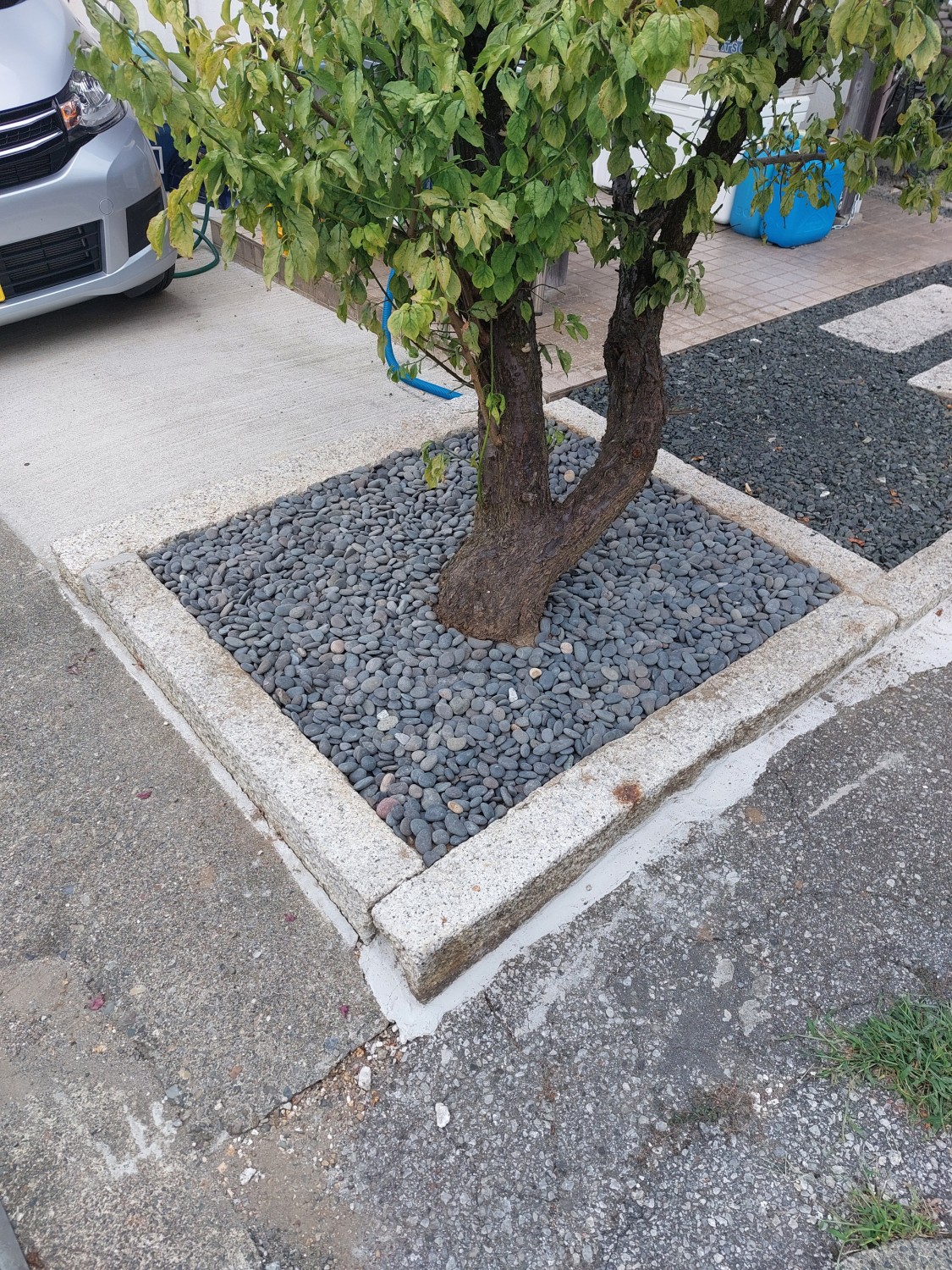 梅の木の下の土を鋤取り、玉砂利を敷いて仕上げました。