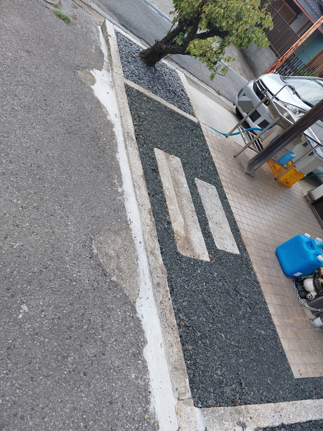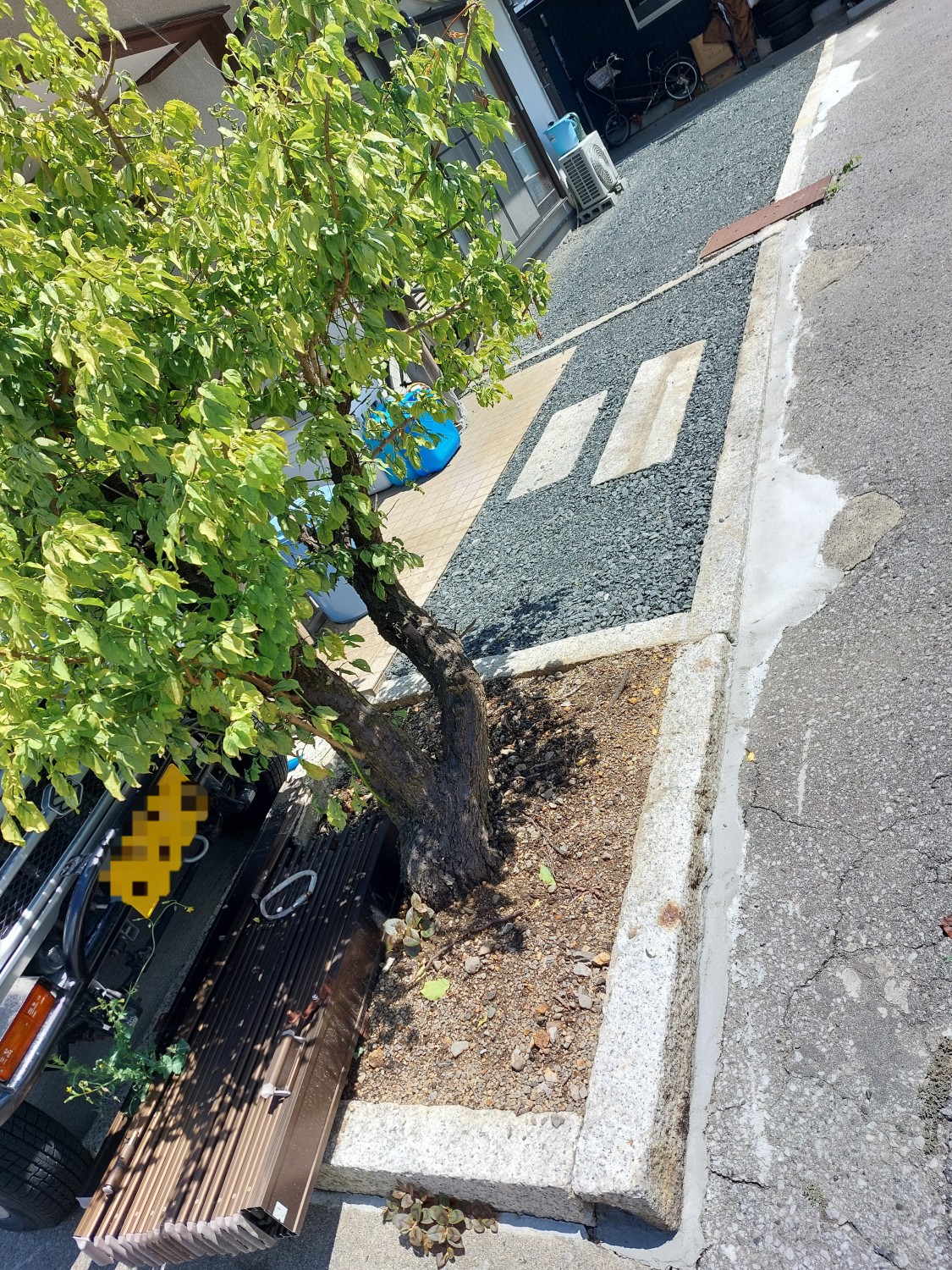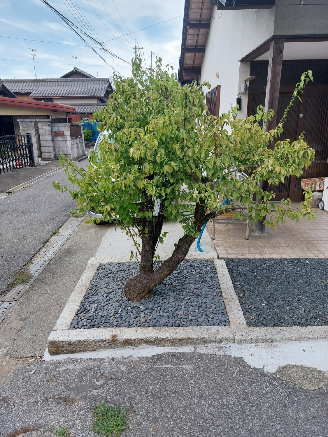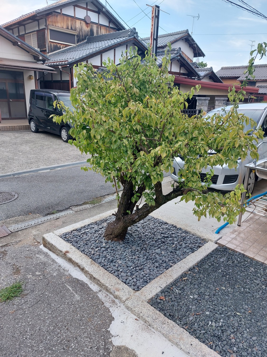 梅の木の下の土を鋤取り、玉砂利を敷いて仕上げました。