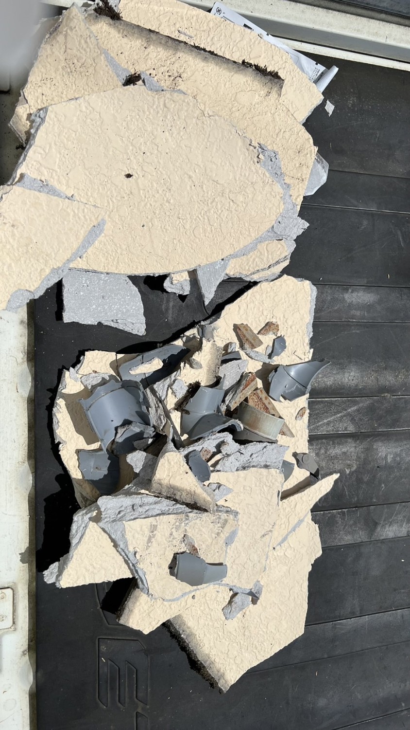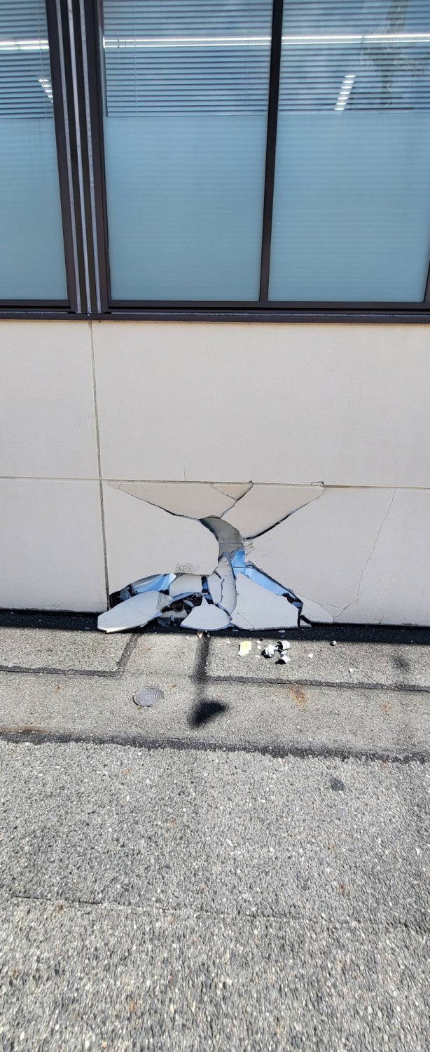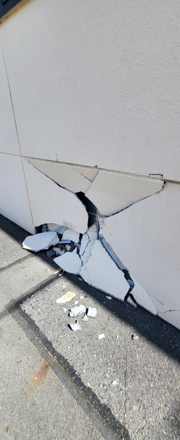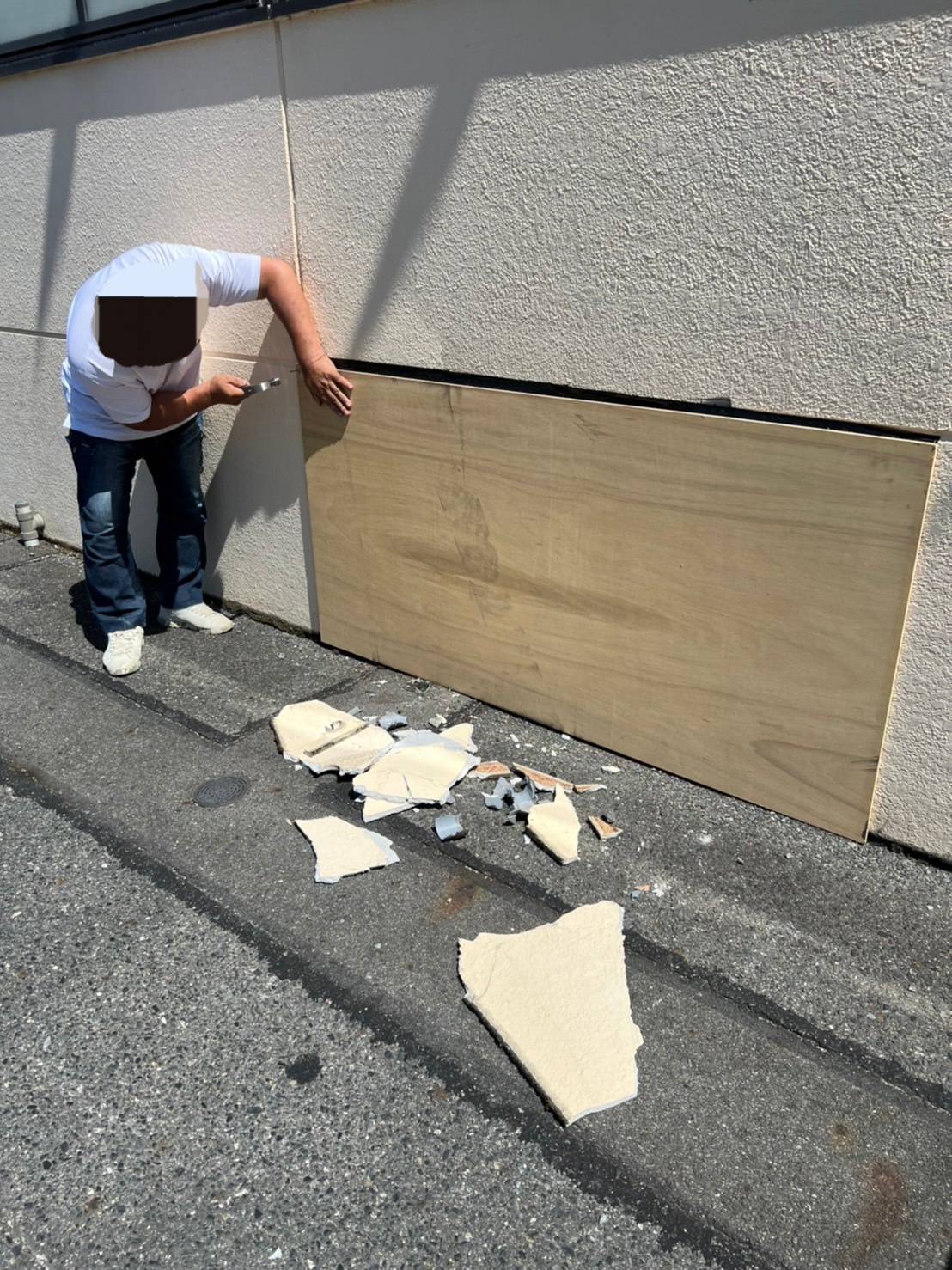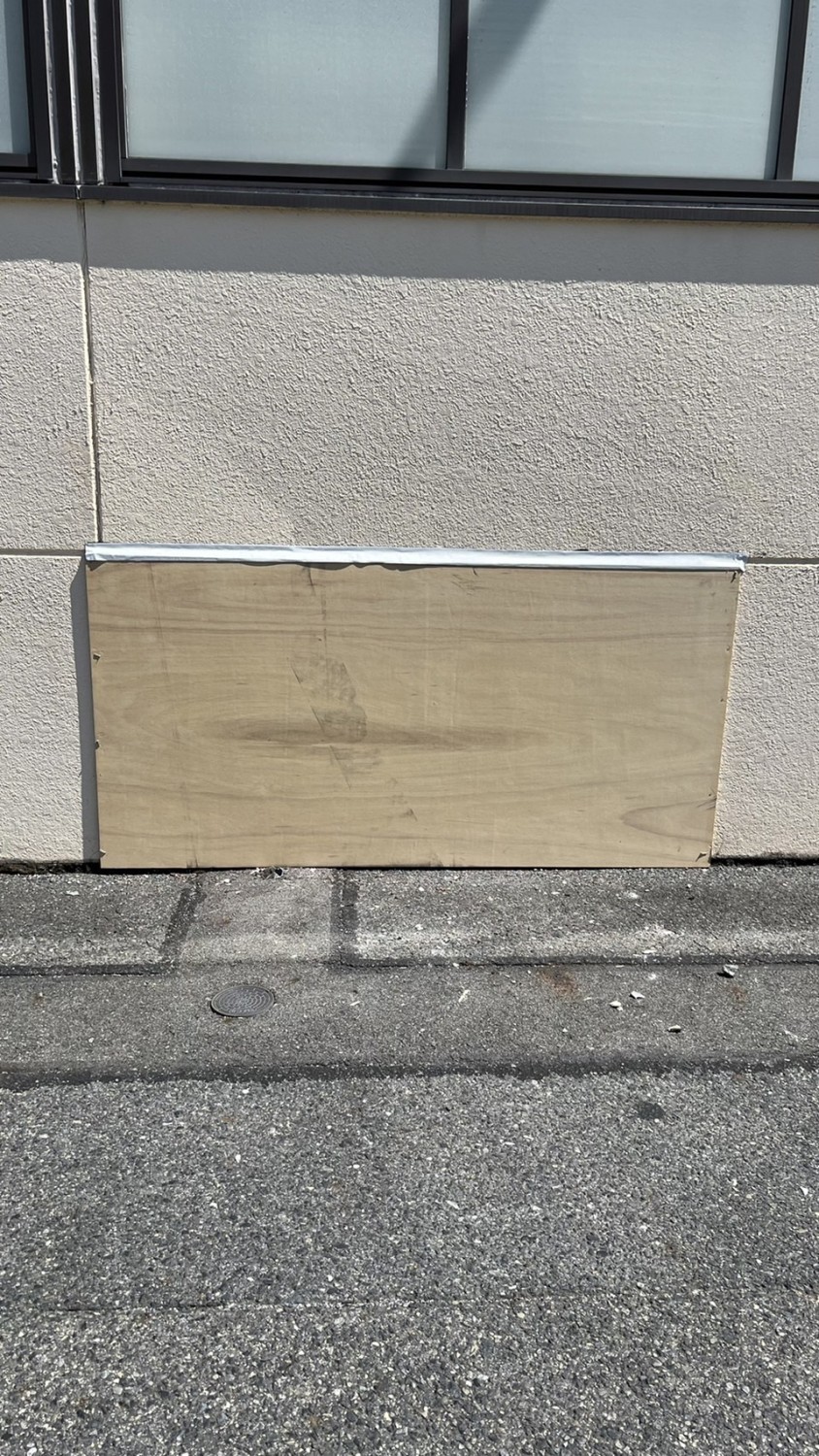外壁(サイディング)の破損個所の応急処置としまして、コンパネを張り防水テープにて養生しました。